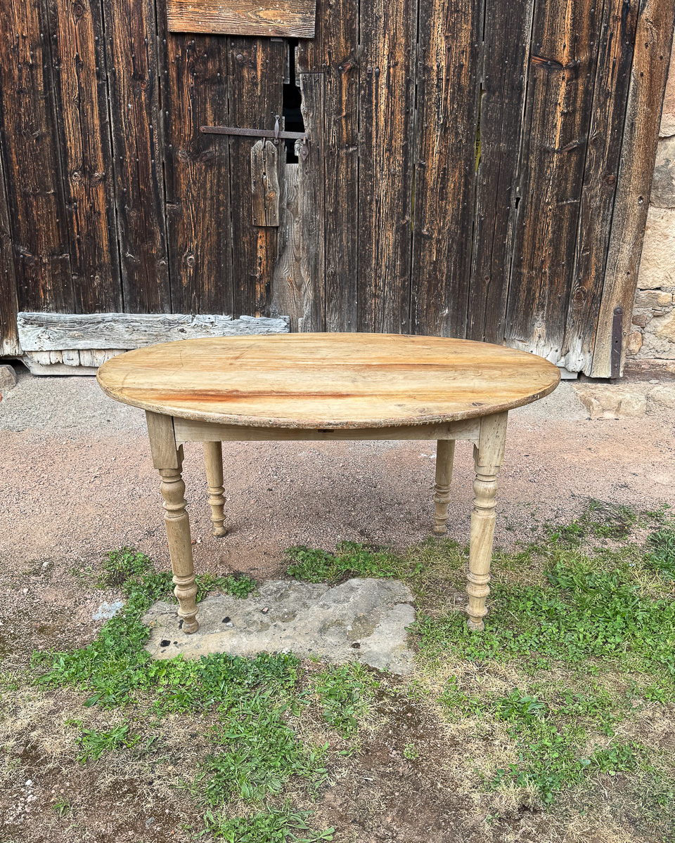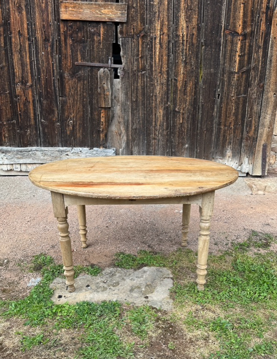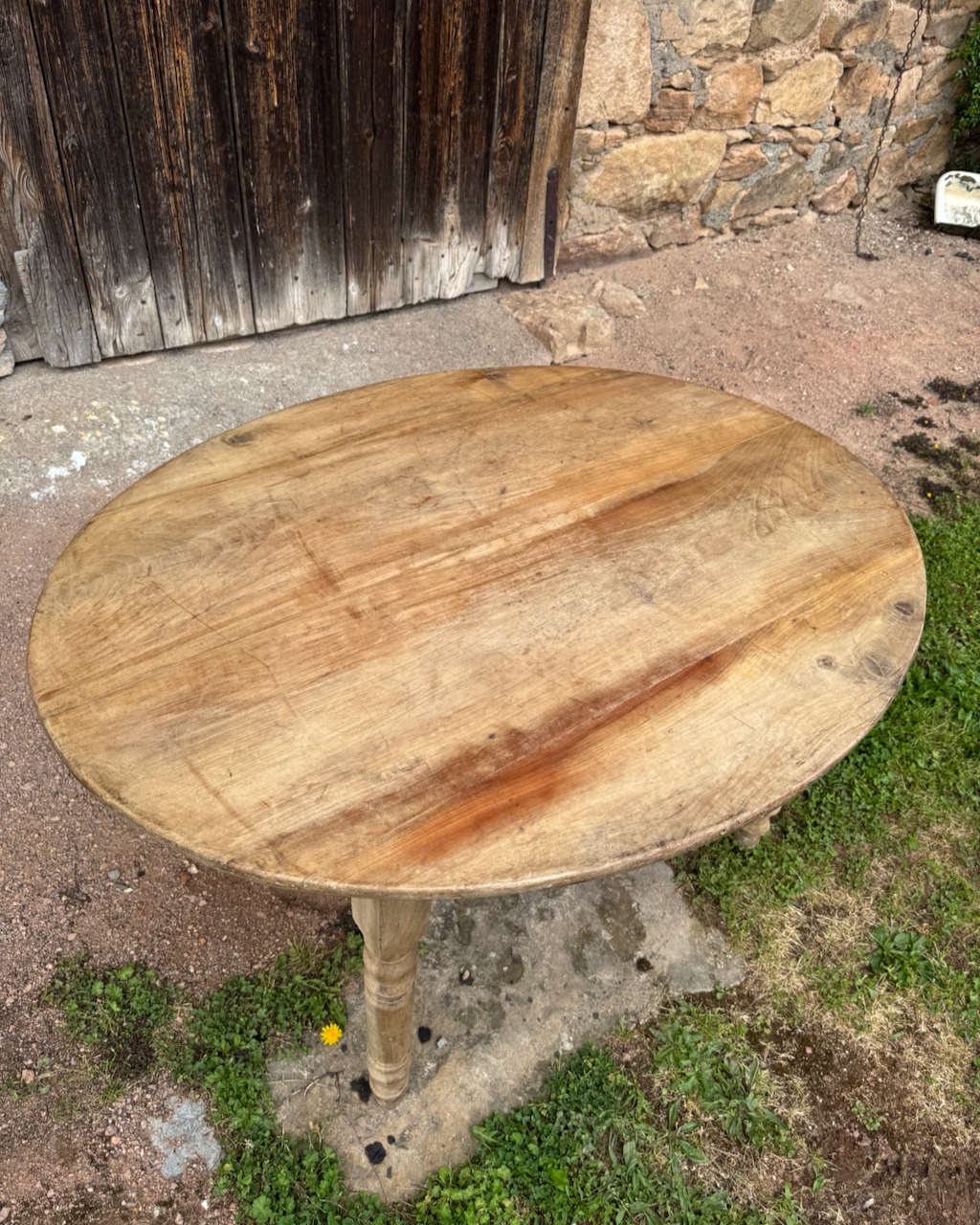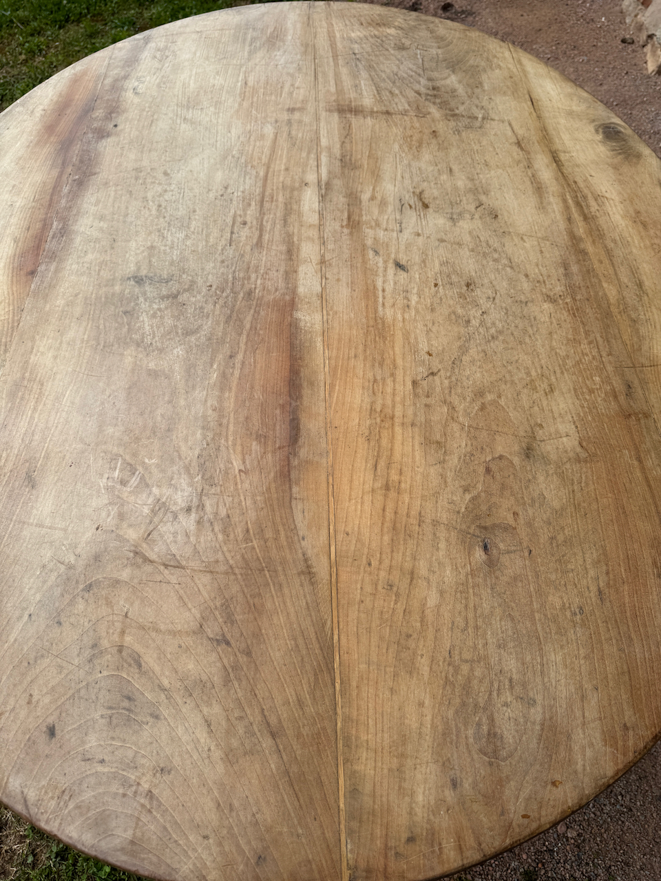 A late 19th century French oval shaped dining table with turned legs and peg construction, possibly in a fruitwood such as cherry with waxed finish. Overall in good condition.