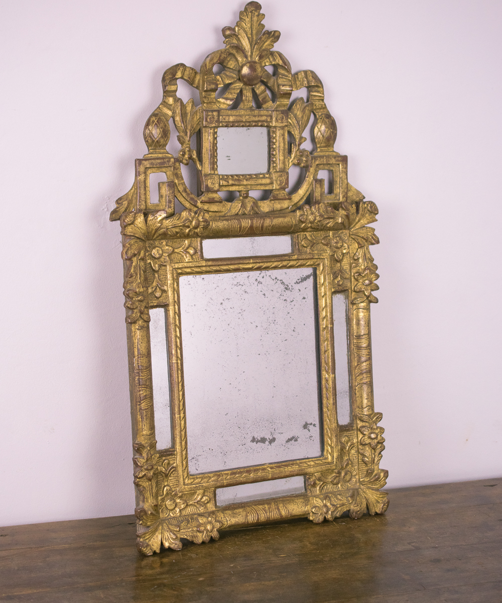 Italian or French small gilded hand carved mirror. Fantastic condition, totally original. Lovely foxing on the glass.