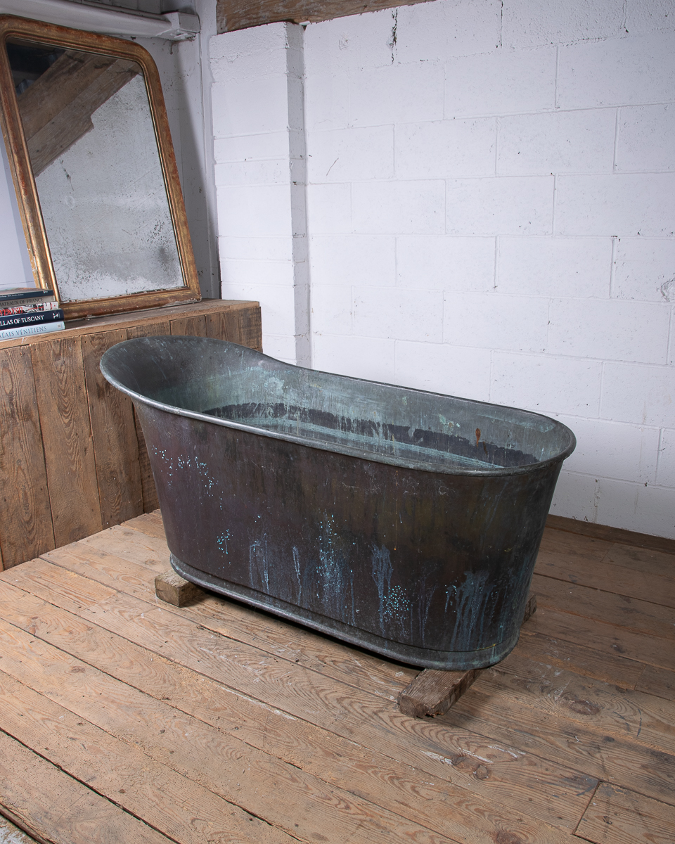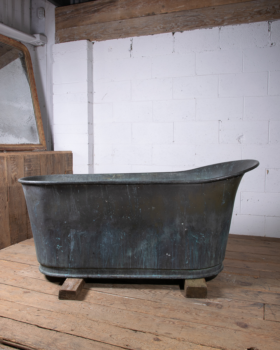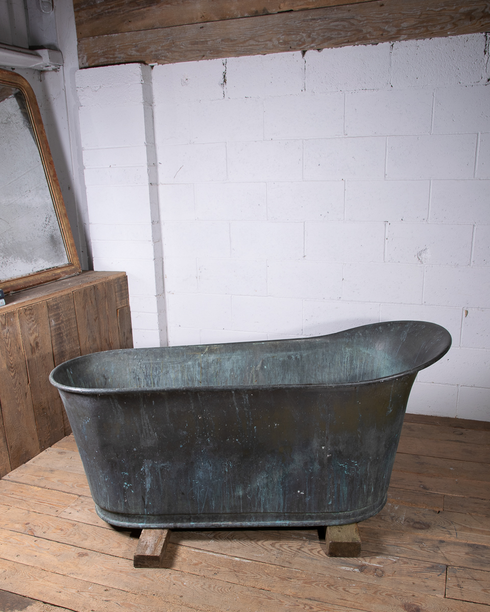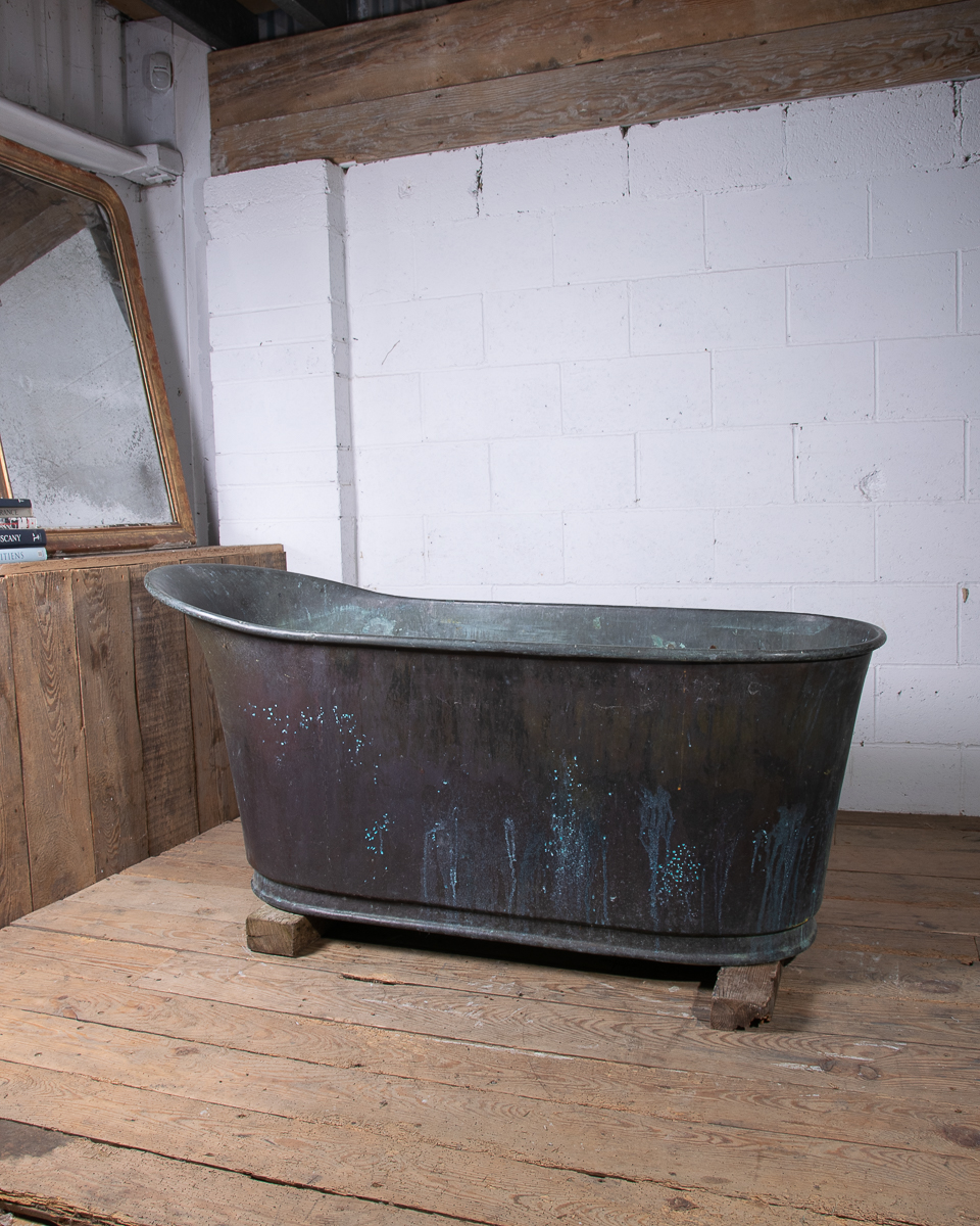A stunning 19th century French copper slipper bath (tapering from head to feet) reclaimed from a country house near Givernay, France. Beautifully shaped, handmade fabrication, the curvatures of the rim showing the quality of the craftsmanship.