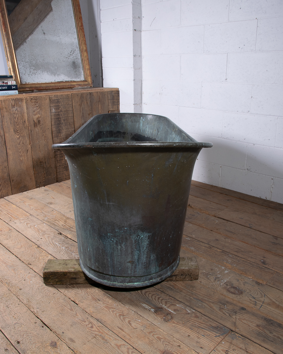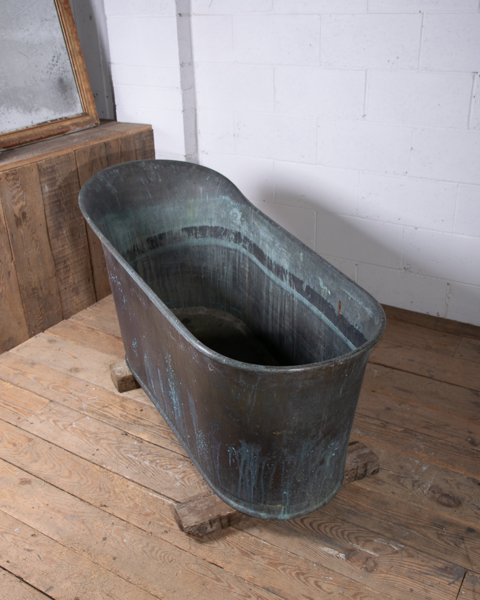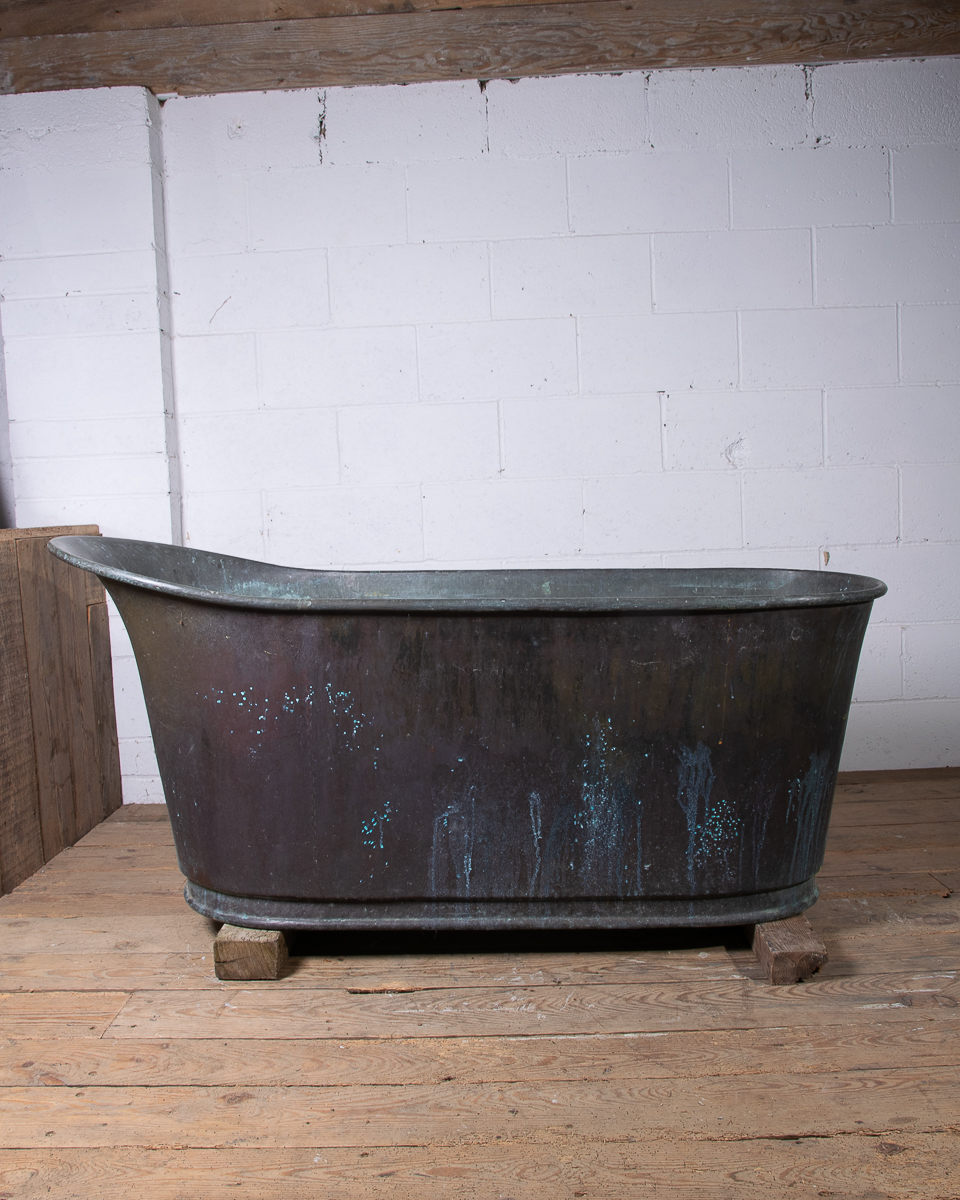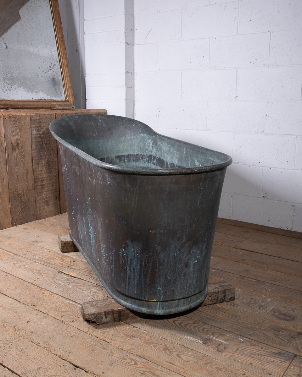 A stunning 19th century French copper slipper bath (tapering from head to feet) reclaimed from a country house near Givernay, France. Beautifully shaped, handmade fabrication, the curvatures of the rim showing the quality of the craftsmanship.