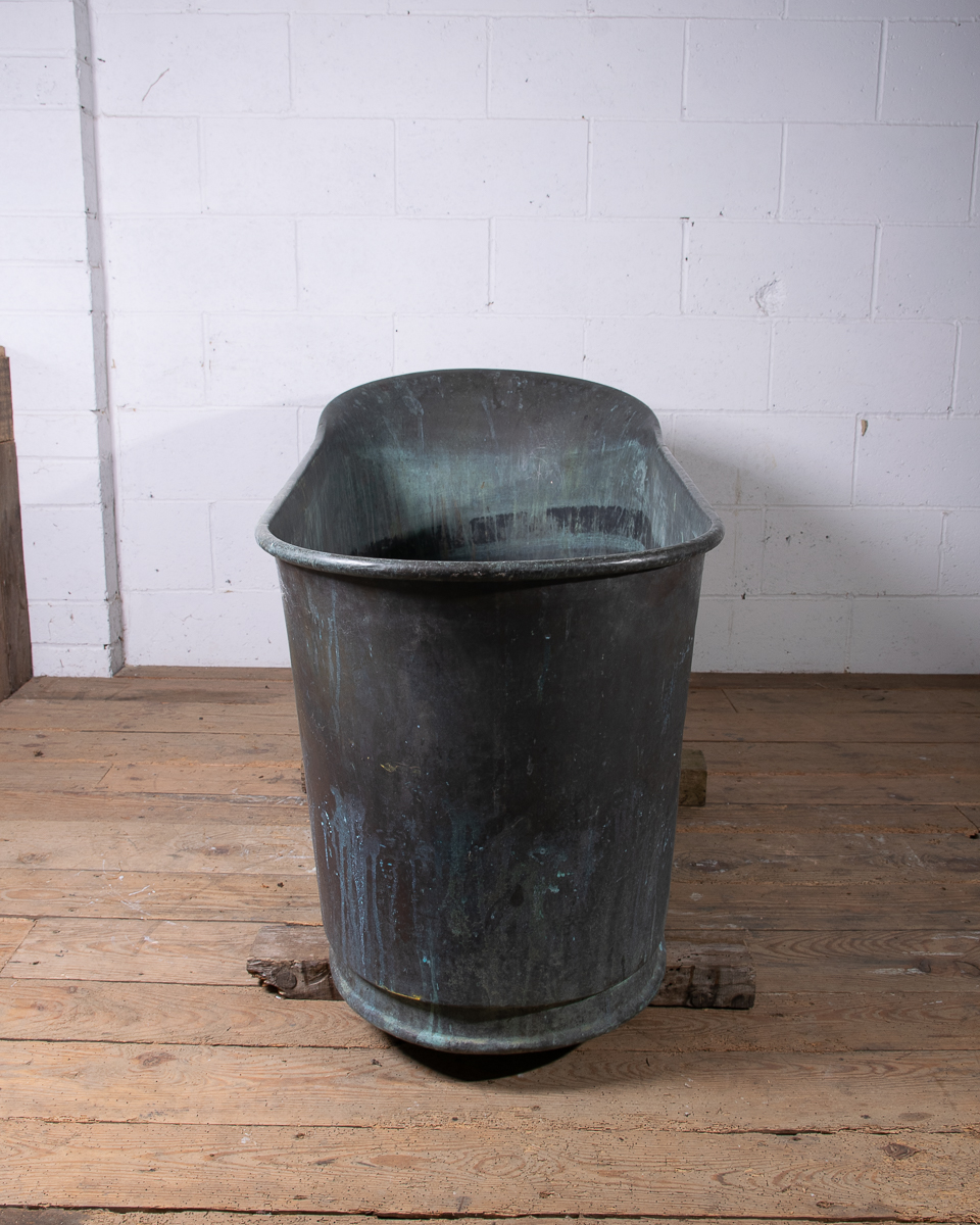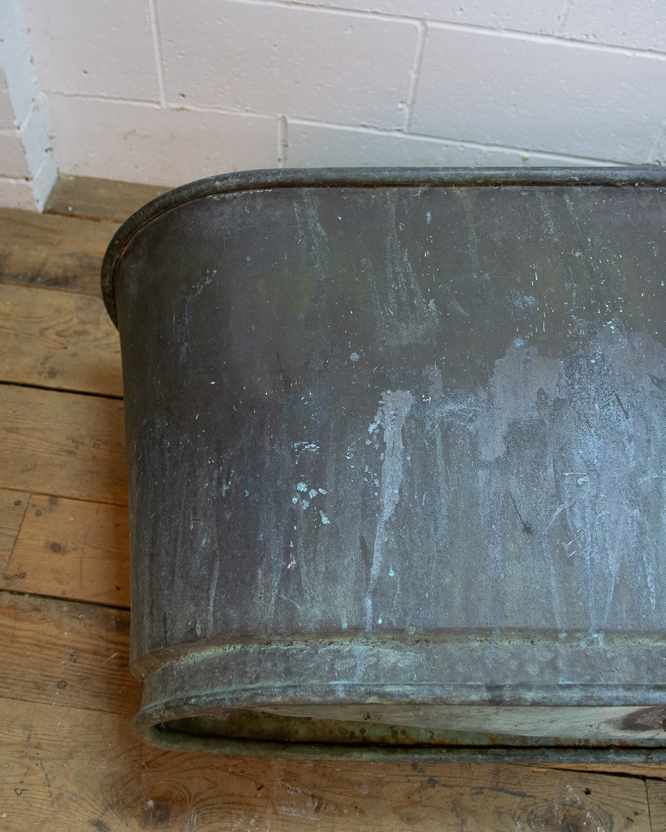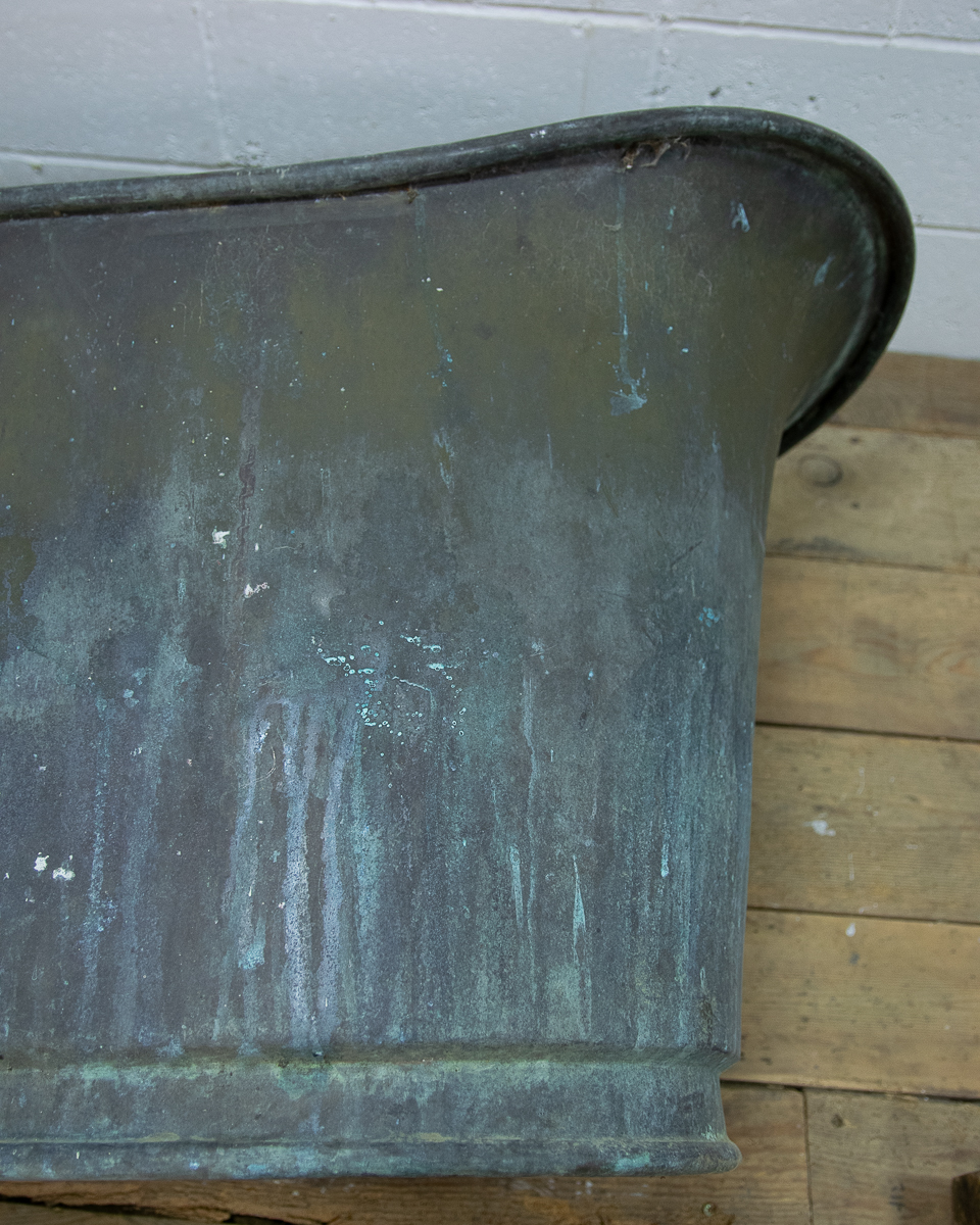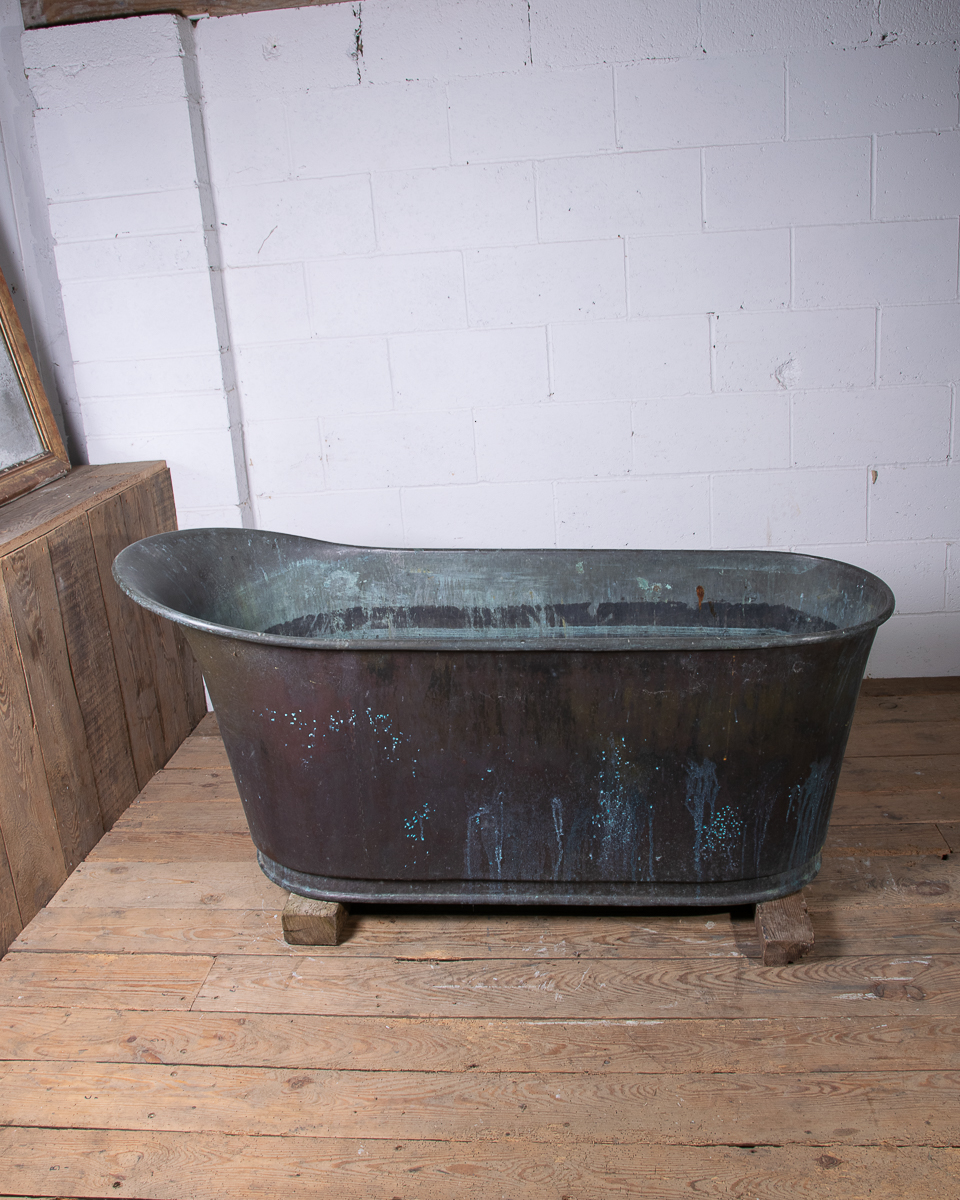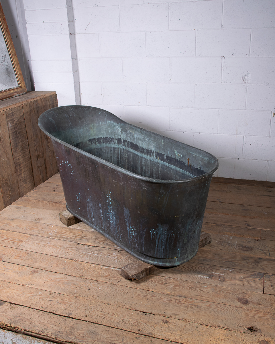 A stunning 19th century French copper slipper bath (tapering from head to feet) reclaimed from a country house near Givernay, France. Beautifully shaped, handmade fabrication, the curvatures of the rim showing the quality of the craftsmanship.