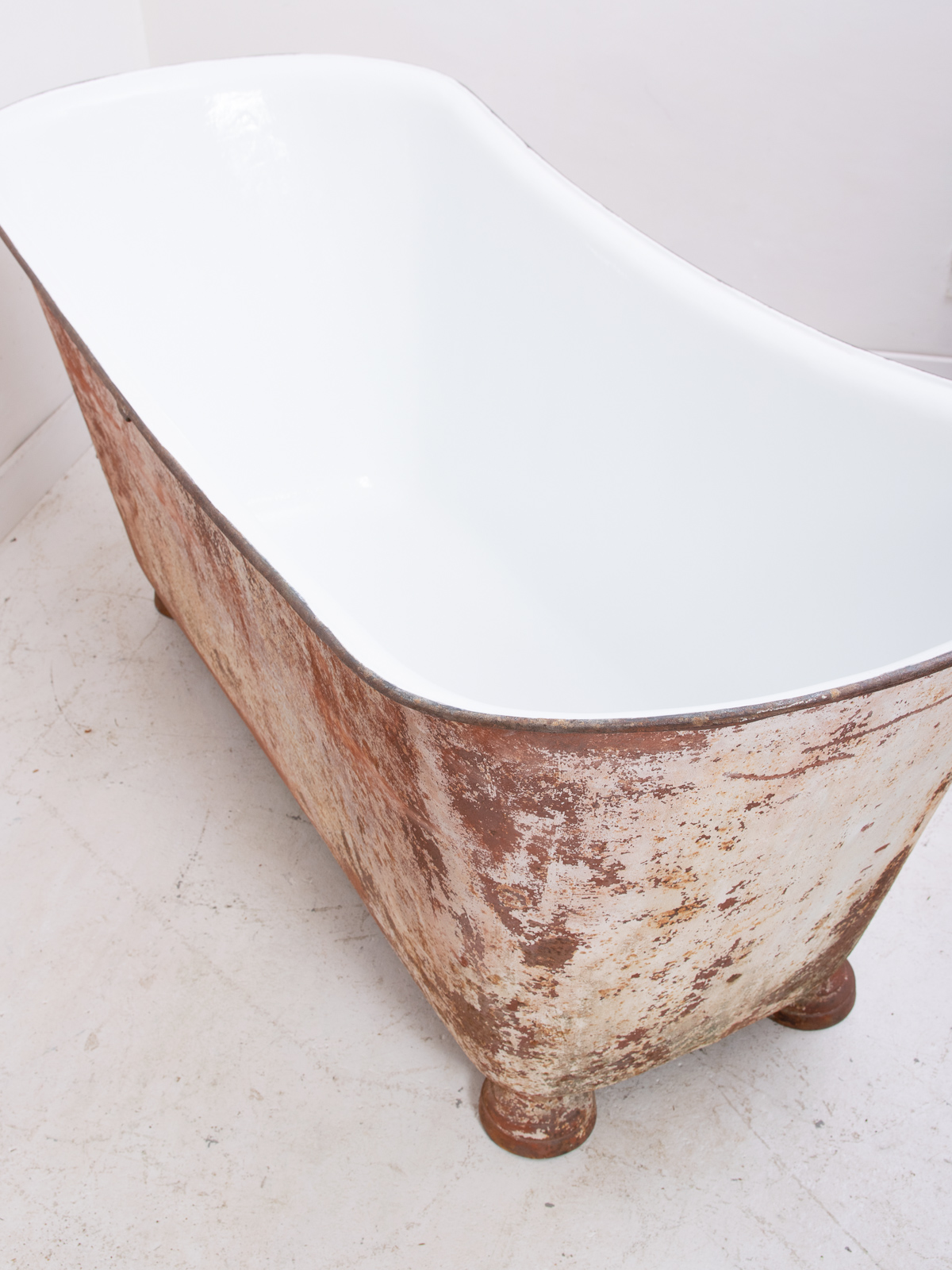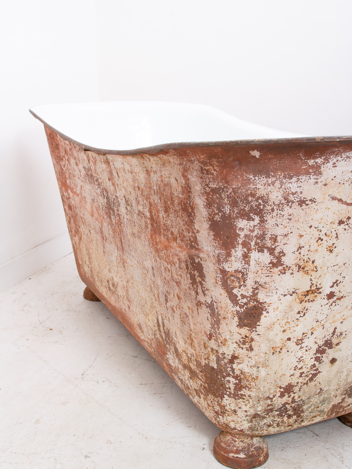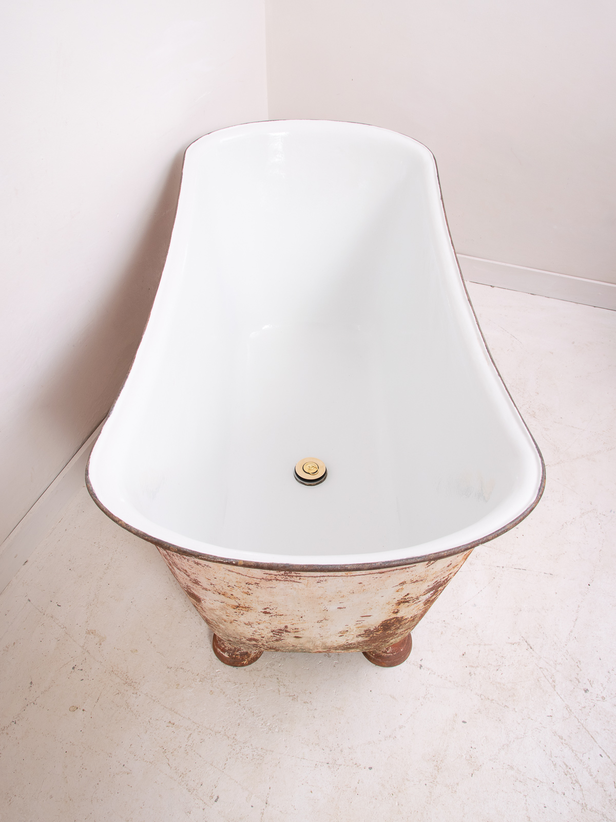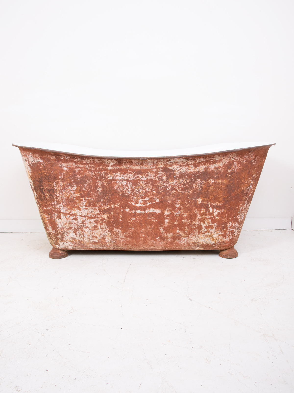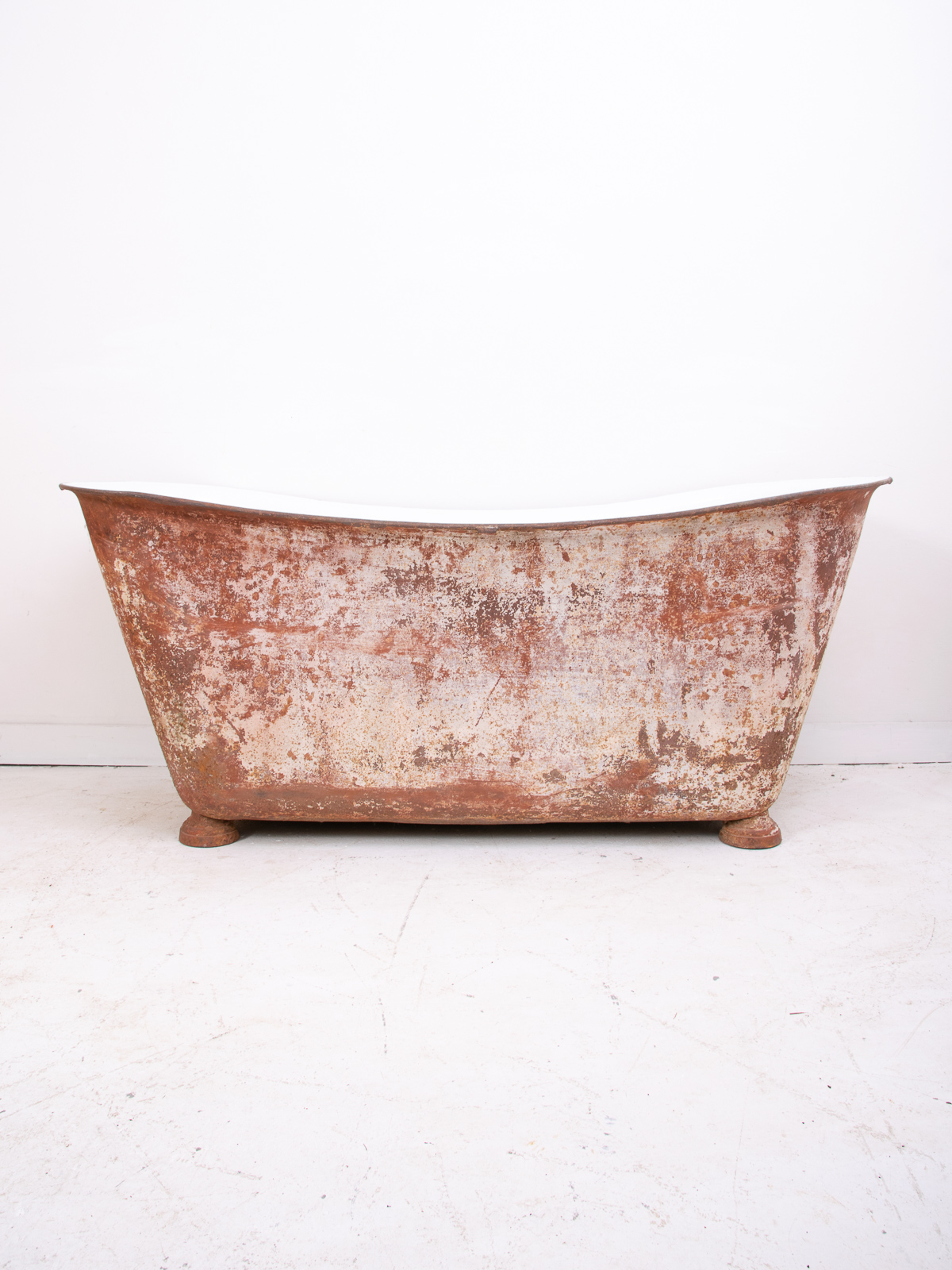 An authentic 19th century French cast iron double ended freestanding bateau bath sitting on round feet.