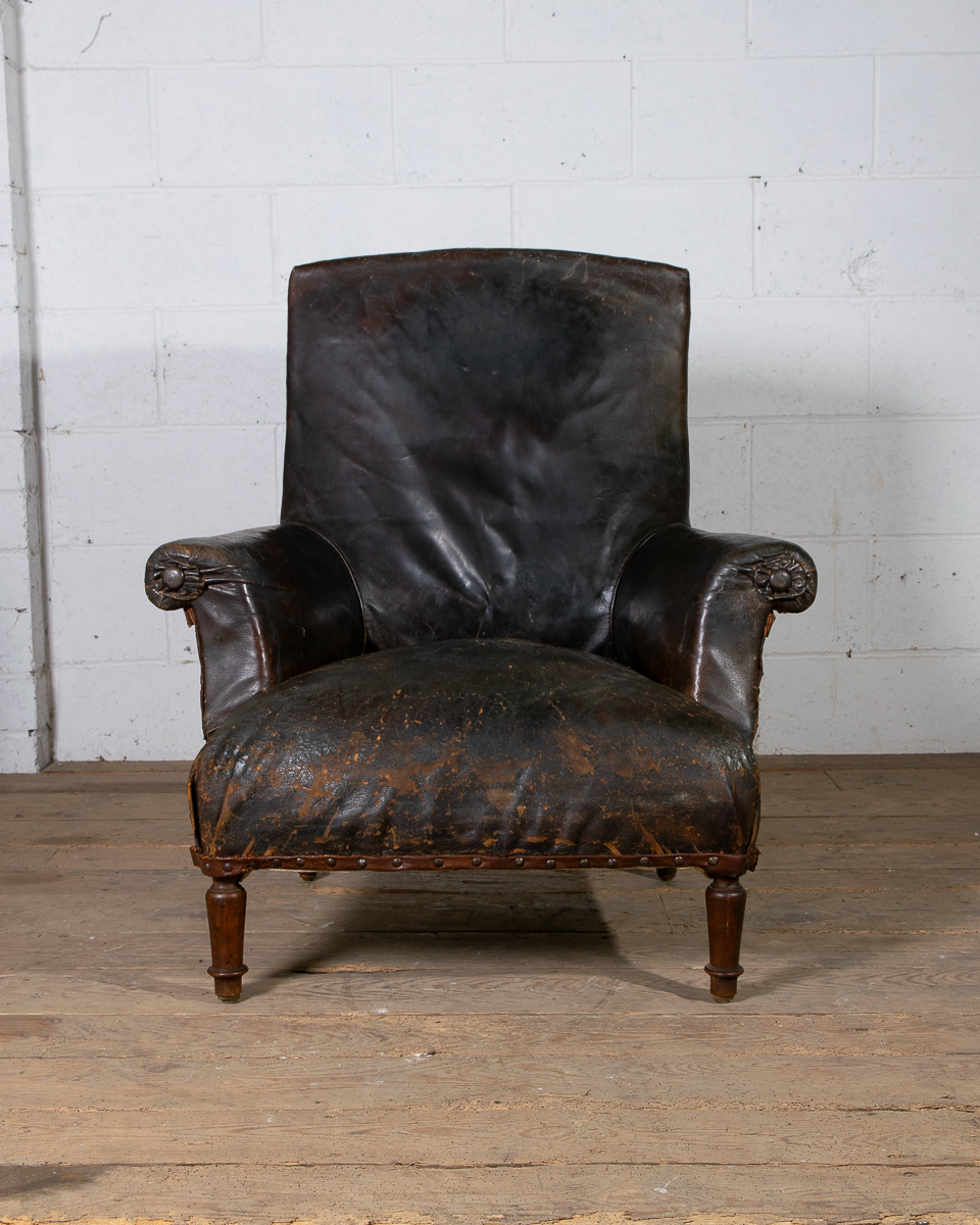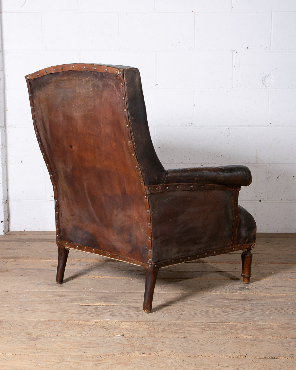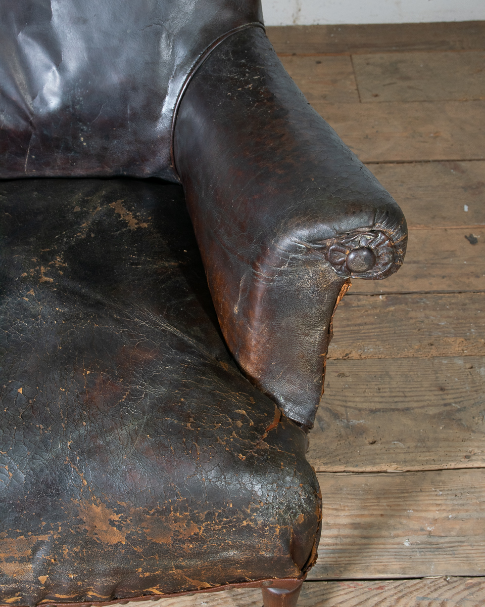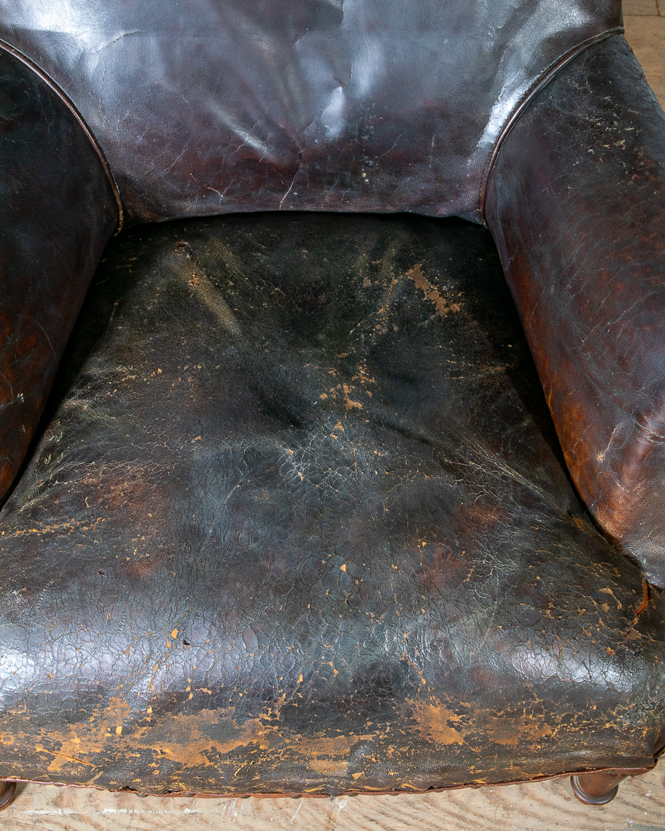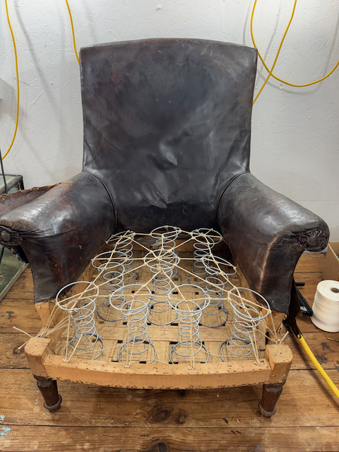 The seat has been rebuilt by us in-house including new springs, webbing and stuffing whilst retaining the original leather. The armchair frame has been checked and regaled to ensure it’s solid. The leather has been strengthened and patched in places (see photos of upholstery process), giving plenty more years of use. It could be raised on castors if desired. And…it’s delightfully comfortable to relax in.