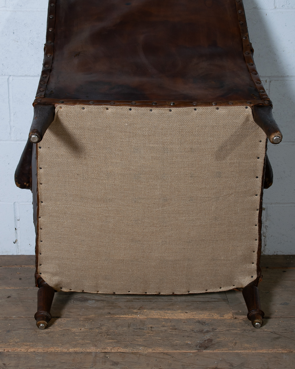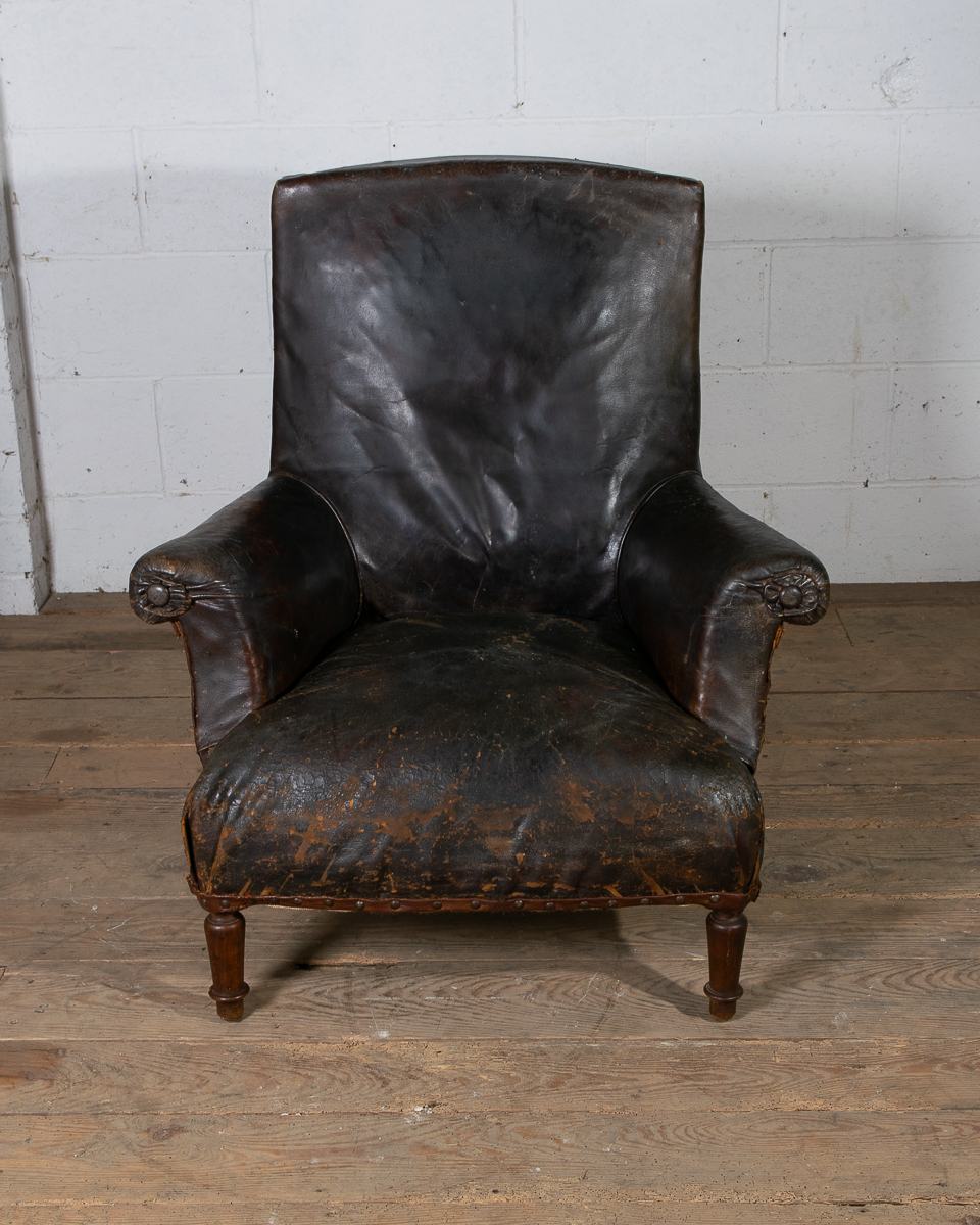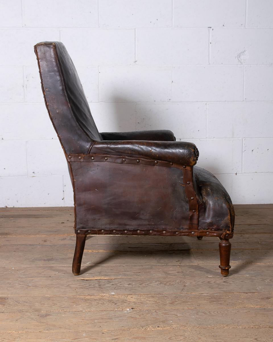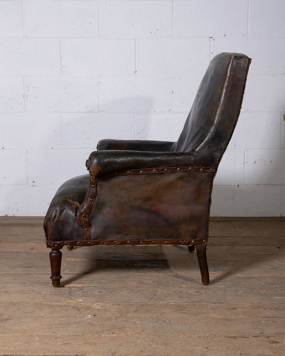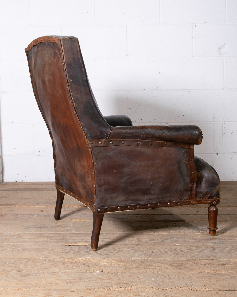 The seat has been rebuilt by us in-house including new springs, webbing and stuffing whilst retaining the original leather. The armchair frame has been checked and regaled to ensure it’s solid. The leather has been strengthened and patched in places (see photos of upholstery process), giving plenty more years of use. It could be raised on castors if desired. And…it’s delightfully comfortable to relax in.
