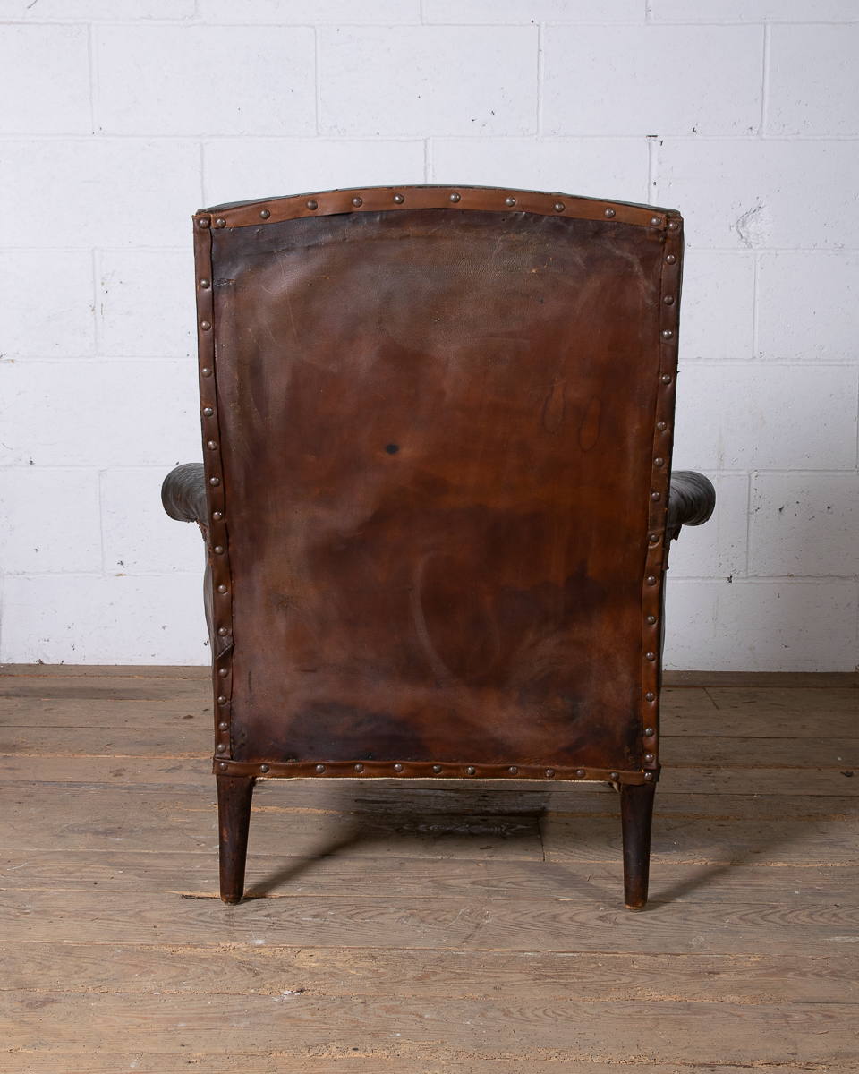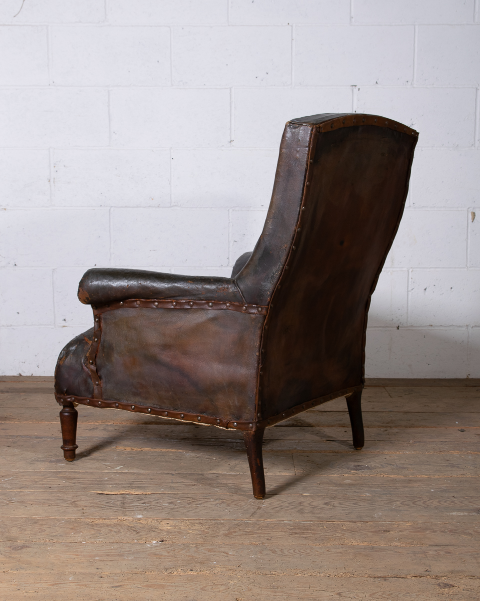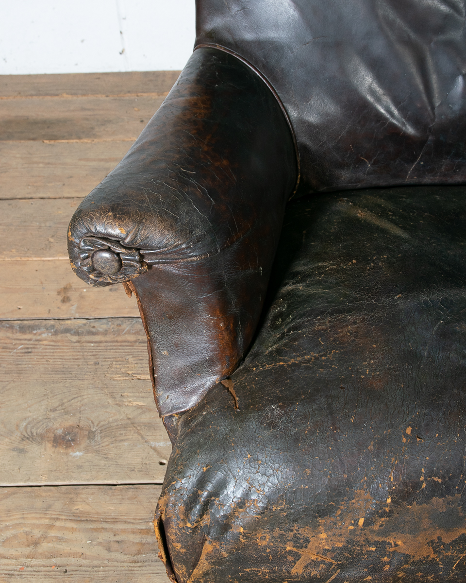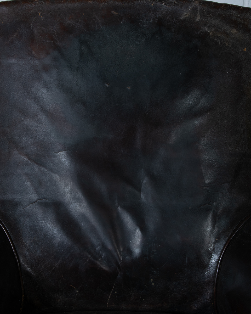The seat has been rebuilt by us in-house including new springs, webbing and stuffing whilst retaining the original leather. The armchair frame has been checked and regaled to ensure it’s solid. The leather has been strengthened and patched in places (see photos of upholstery process), giving plenty more years of use. It could be raised on castors if desired. And…it’s delightfully comfortable to relax in.