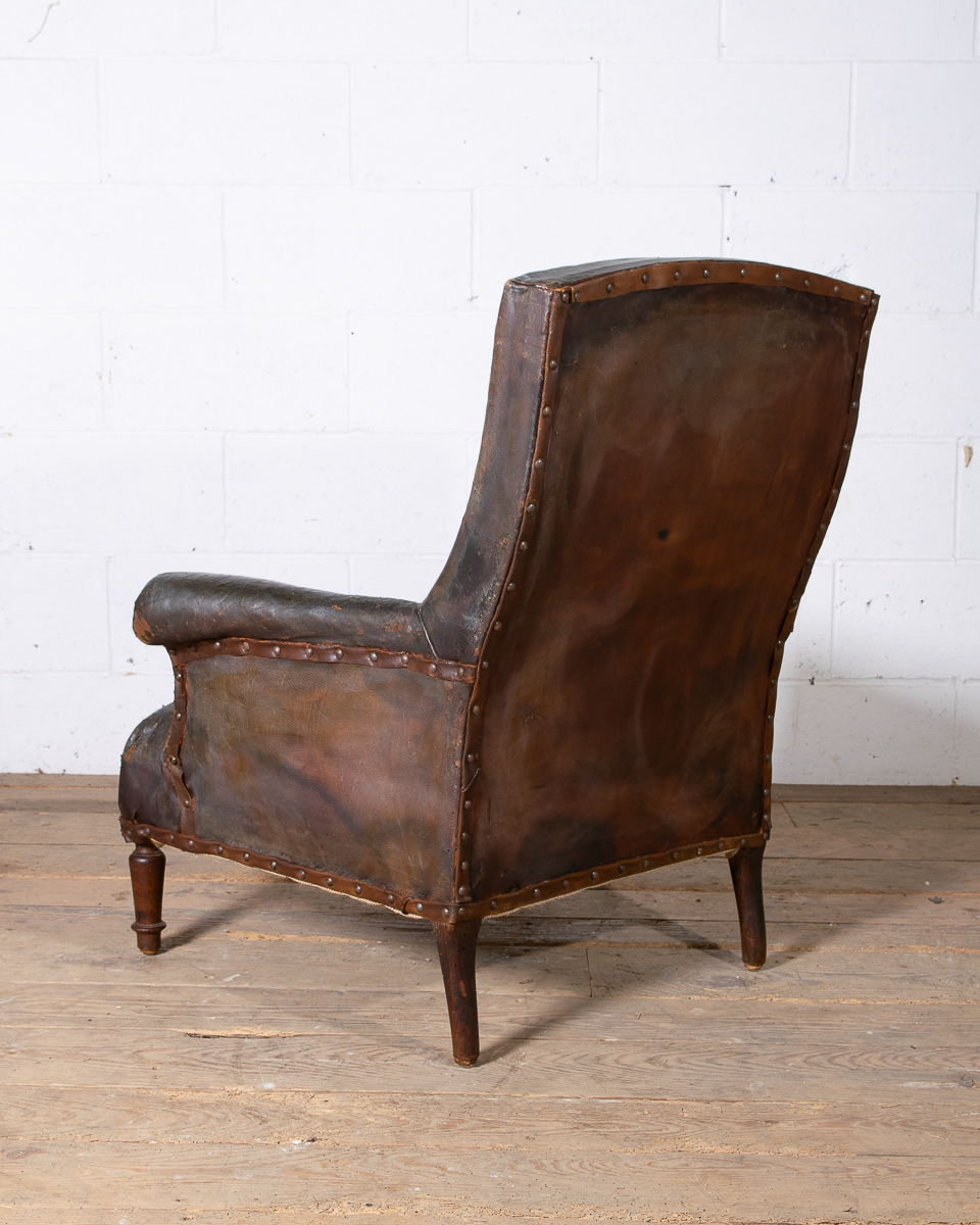 A well-proportioned French library or easy armchair from the Louis Philippe period circa 1850. Scrolled arms and turned legs. Original cigar colour leather with a hint of claret.