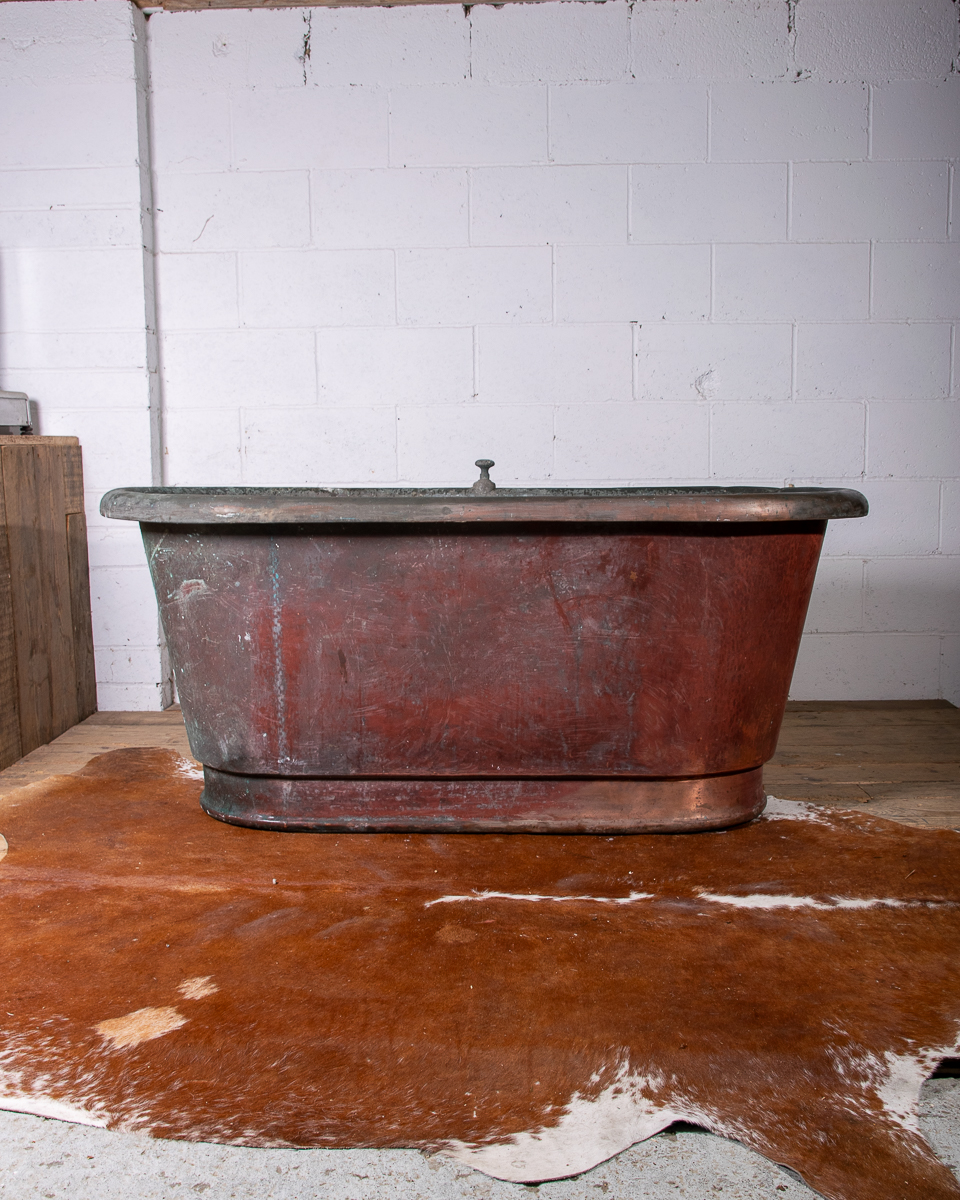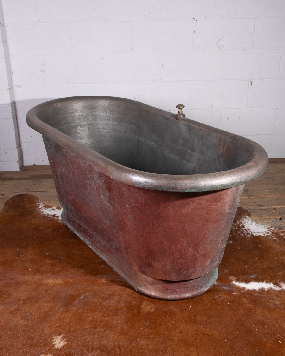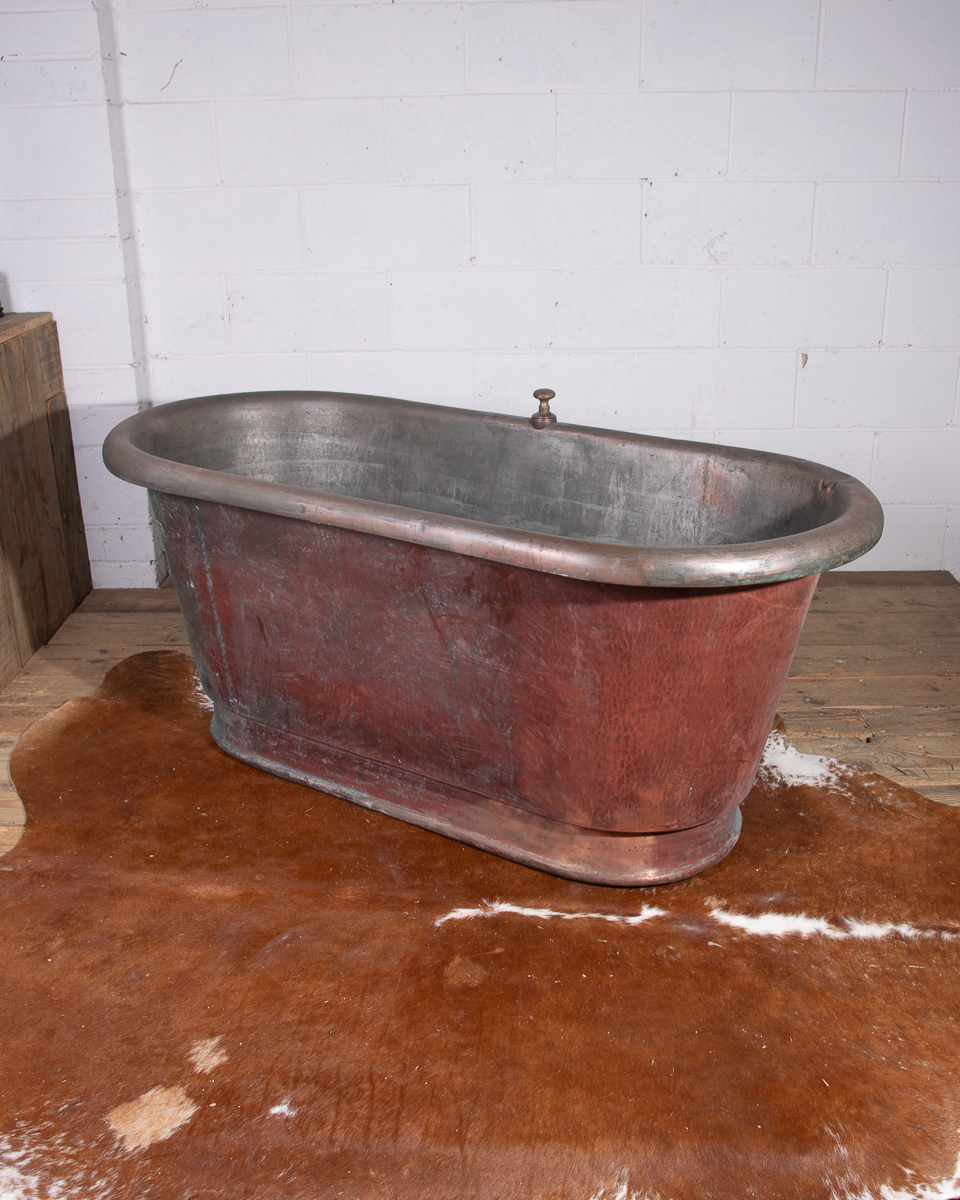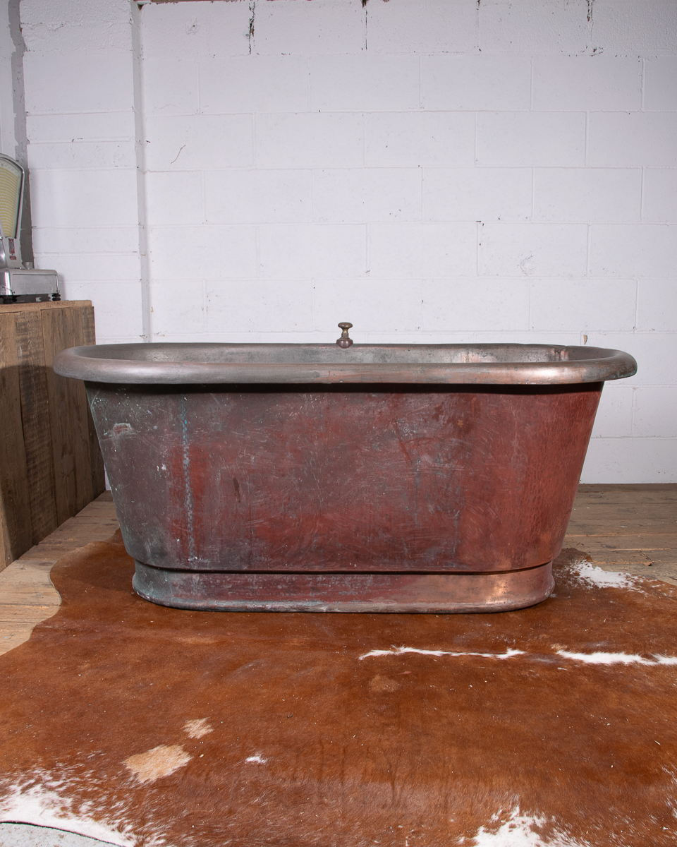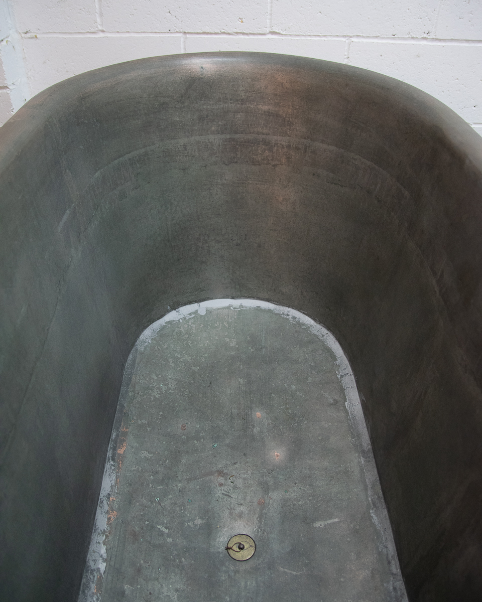 The bath has been restored, including soda blasting the interior to clean the electroplate, removal of the existing waste fitting and installation of a modern aged brass fitting that will connect to UK plumbing, and sealing/water-testing the seams to ensure the bath is watertight.