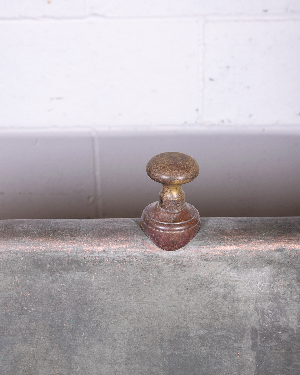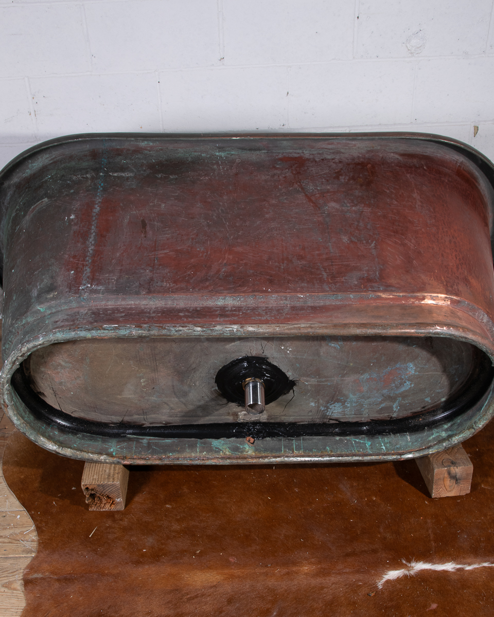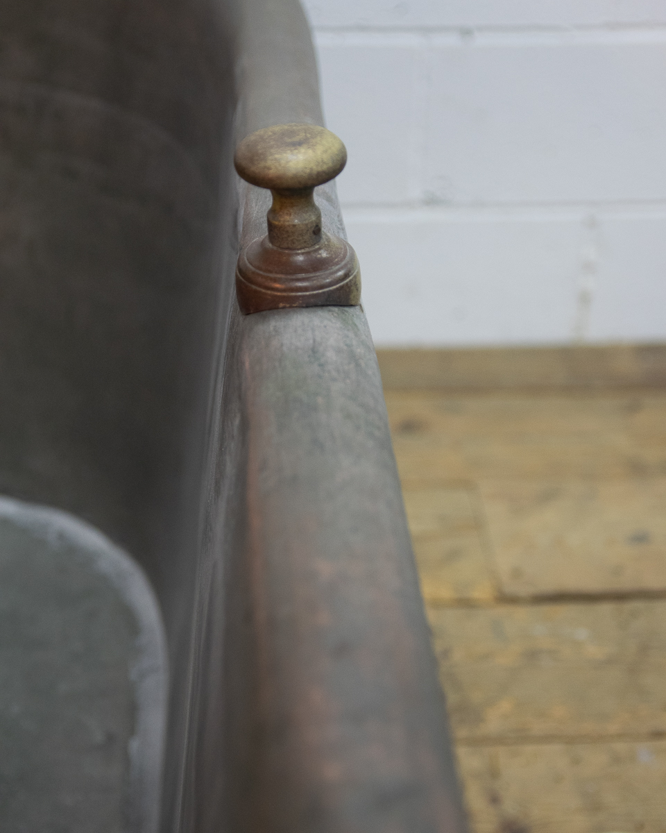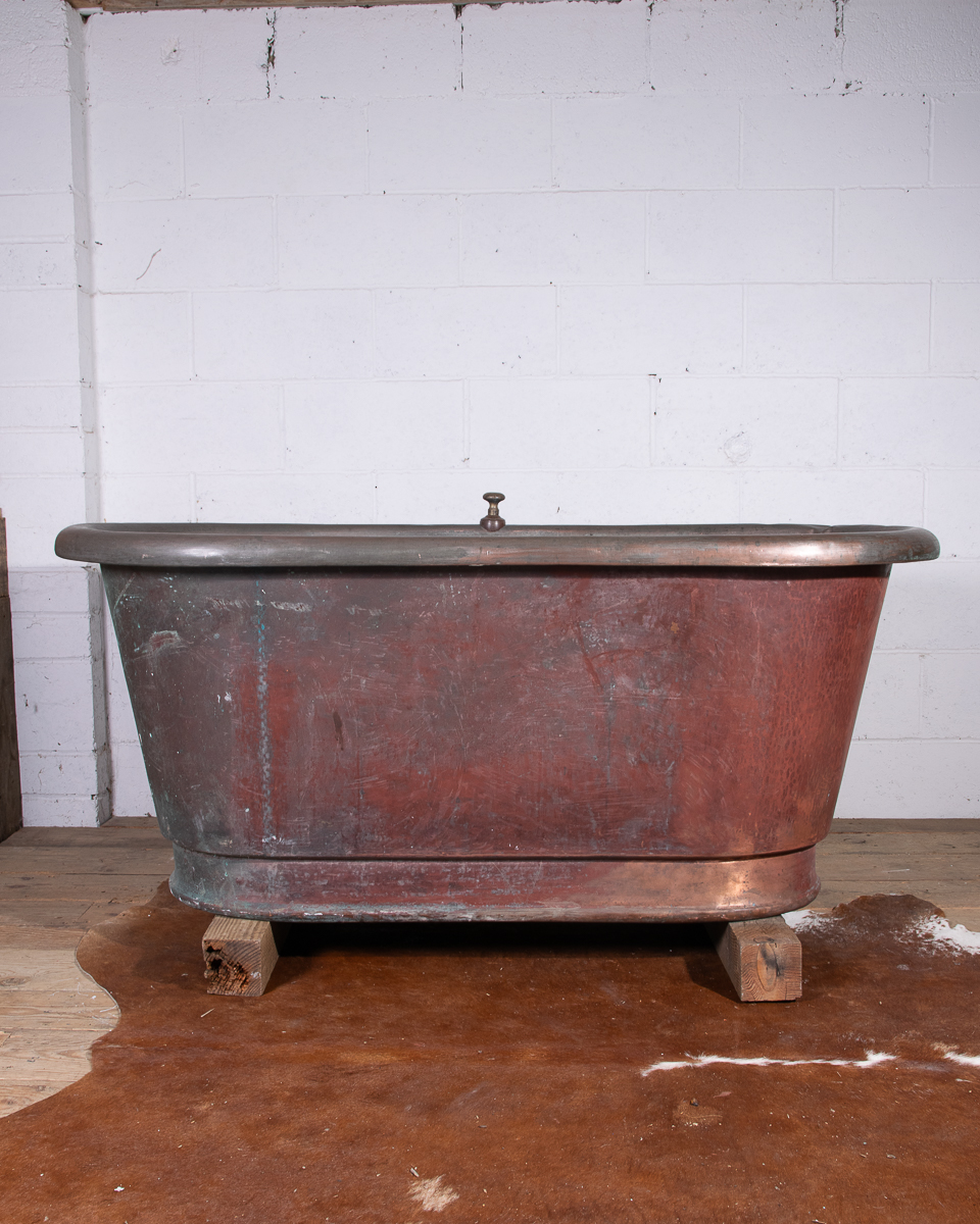 The bath has been restored, including soda blasting the interior to clean the electroplate, removal of the existing waste fitting and installation of a modern aged brass fitting that will connect to UK plumbing, and sealing/water-testing the seams to ensure the bath is watertight.