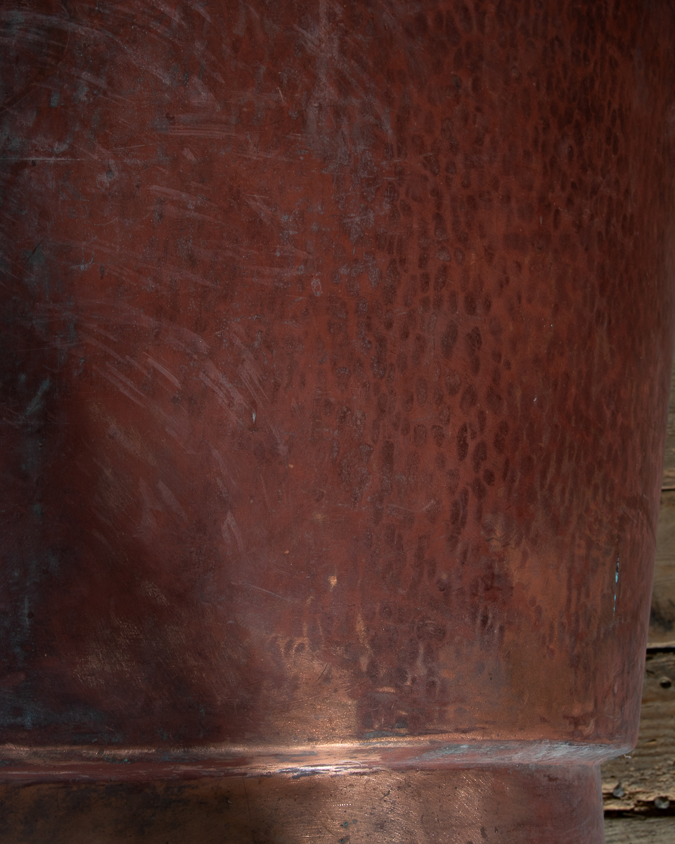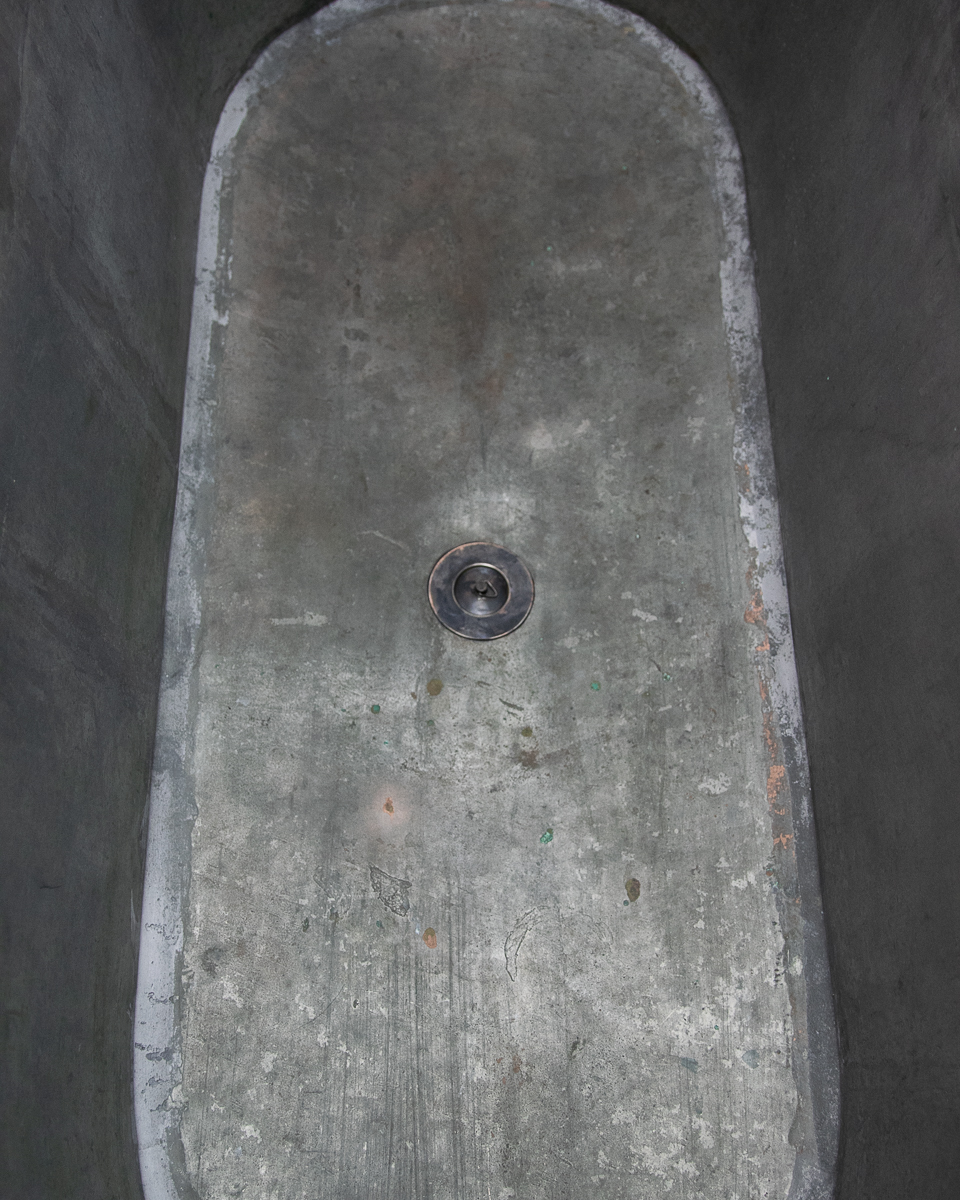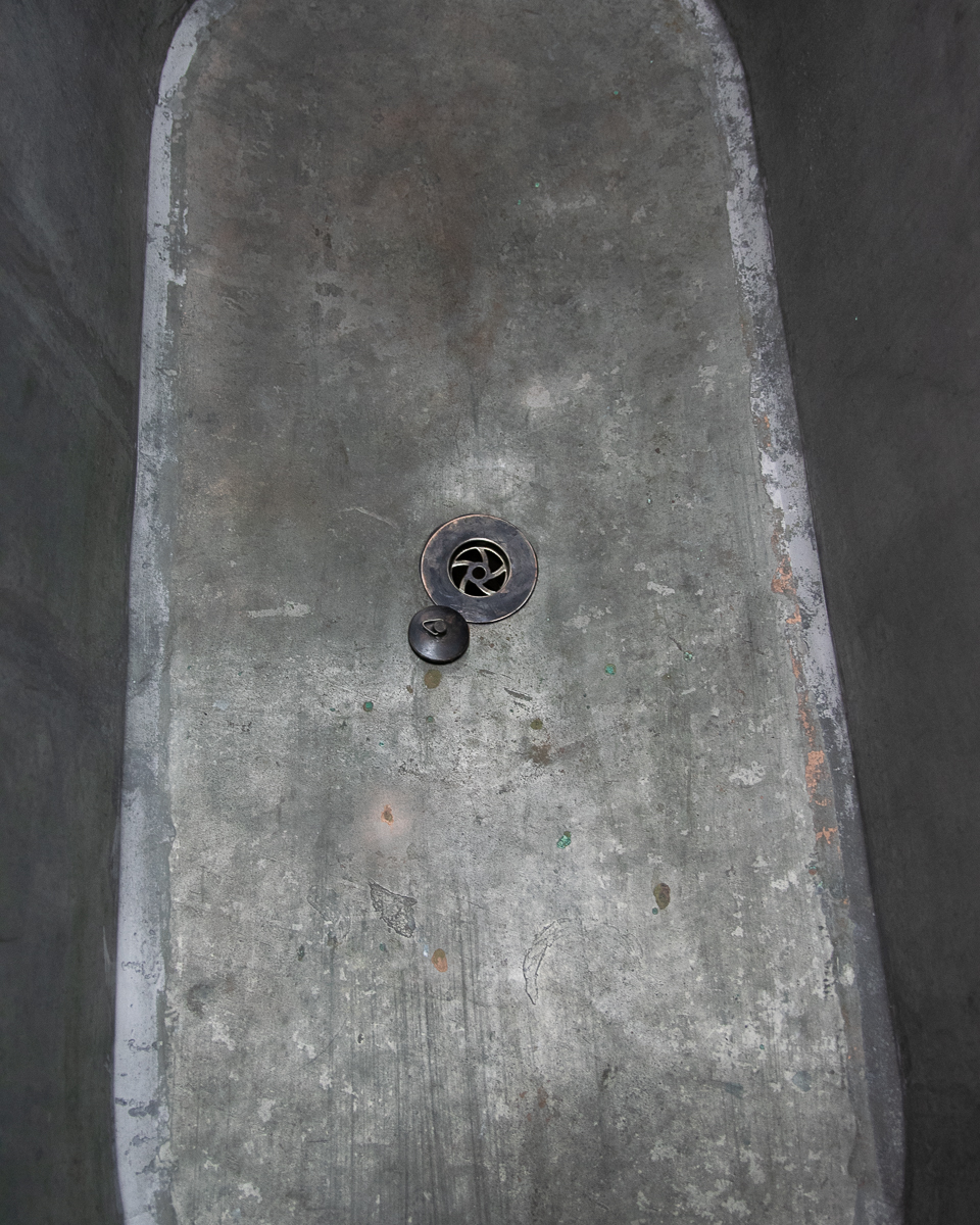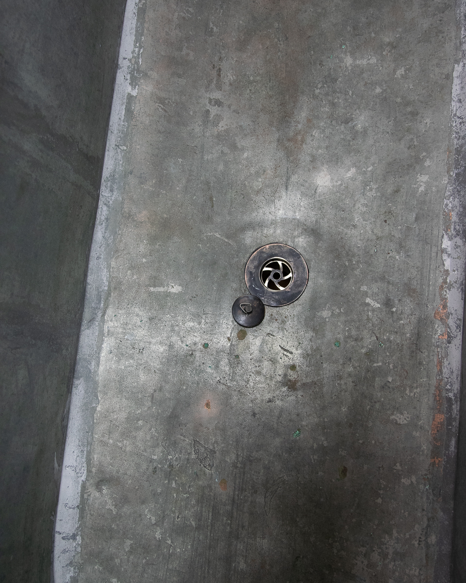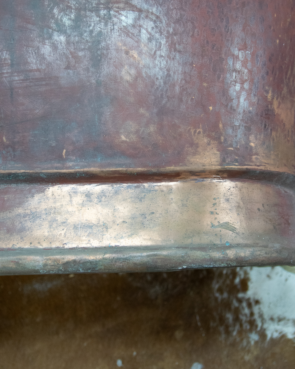 The bath has been restored, including soda blasting the interior to clean the electroplate, removal of the existing waste fitting and installation of a modern aged brass fitting that will connect to UK plumbing, and sealing/water-testing the seams to ensure the bath is watertight.