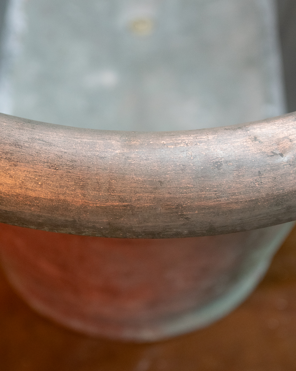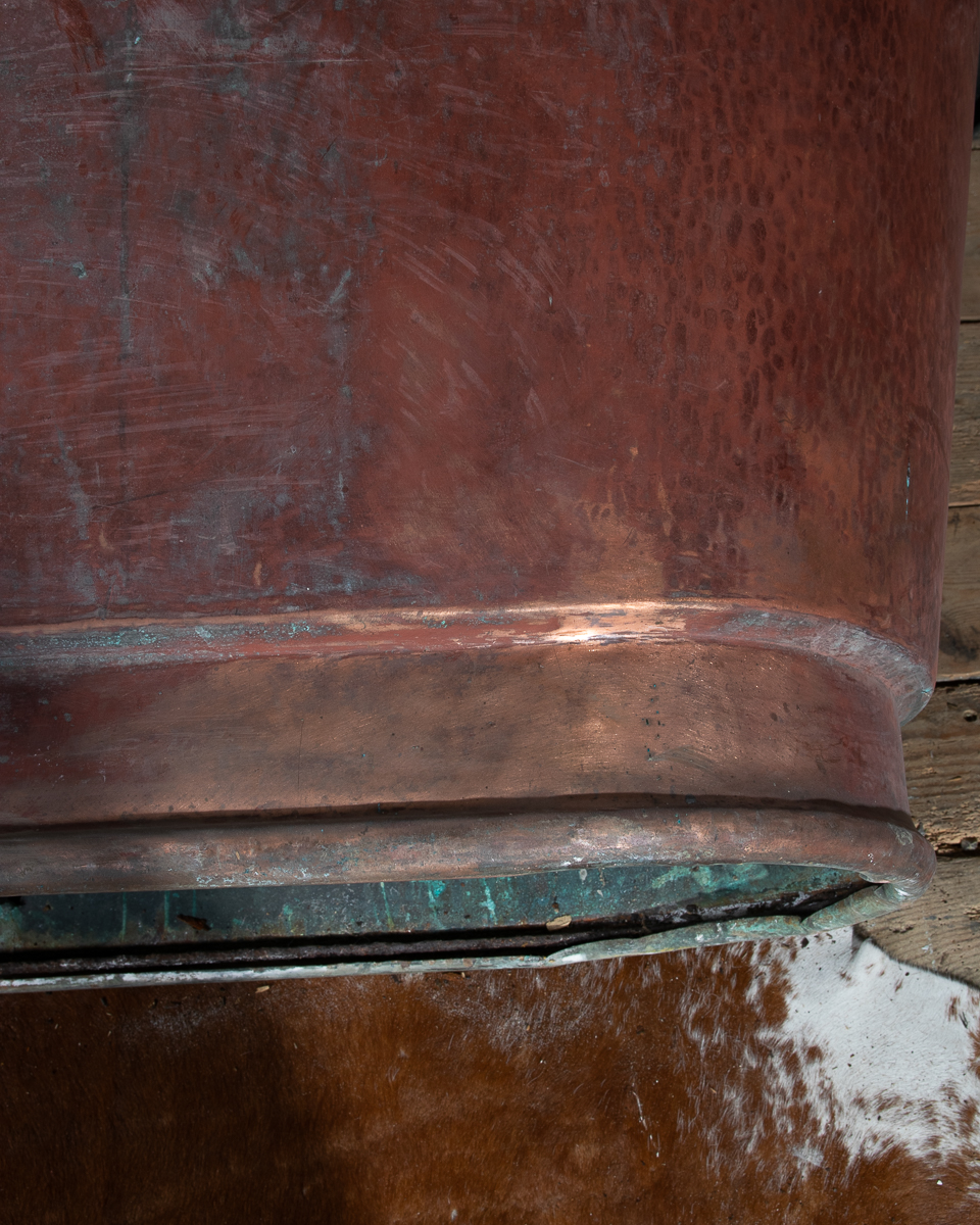 An authentic, handmade French copper bateau bath from around 1860 with original red painted exterior and tin electroplate interior.