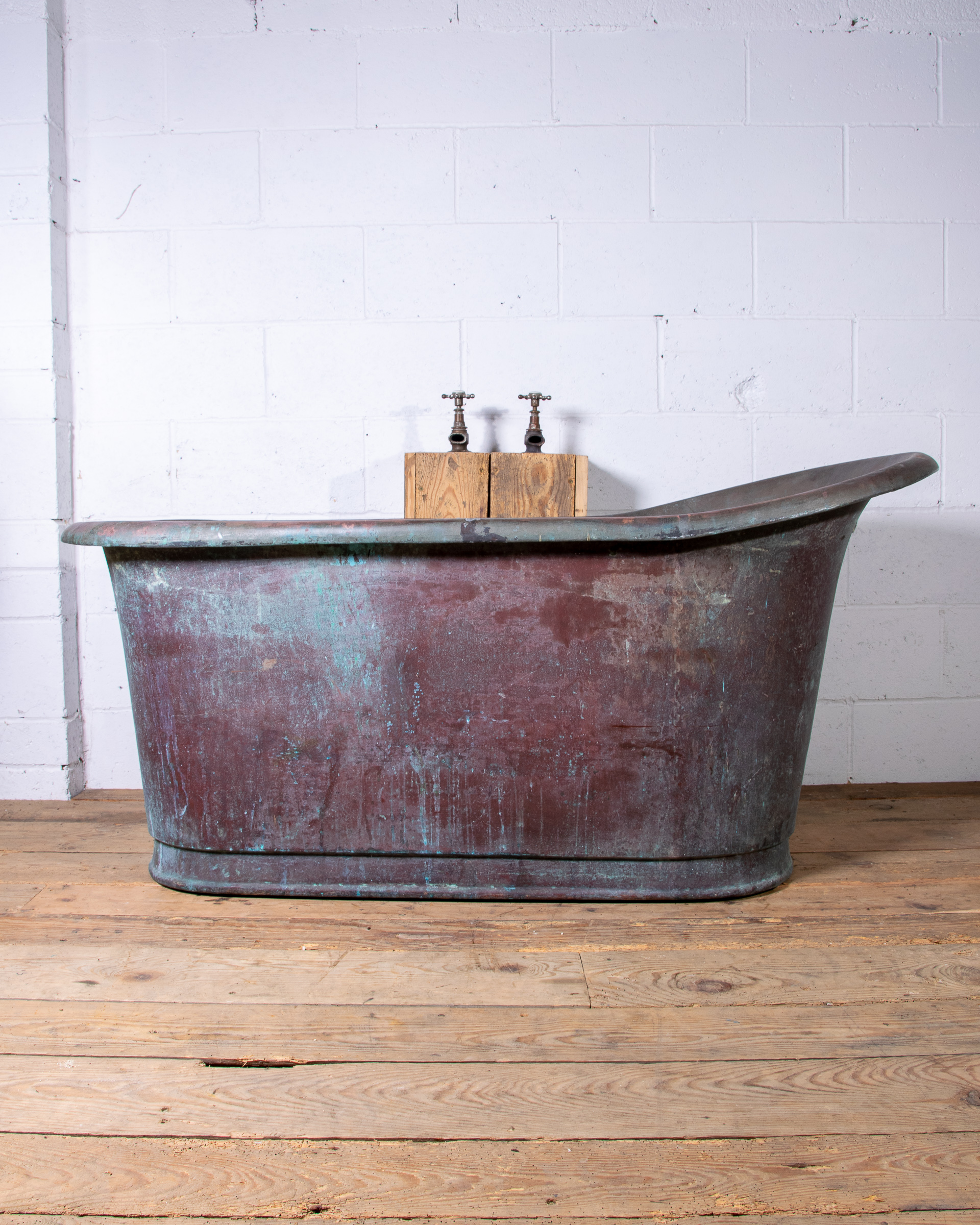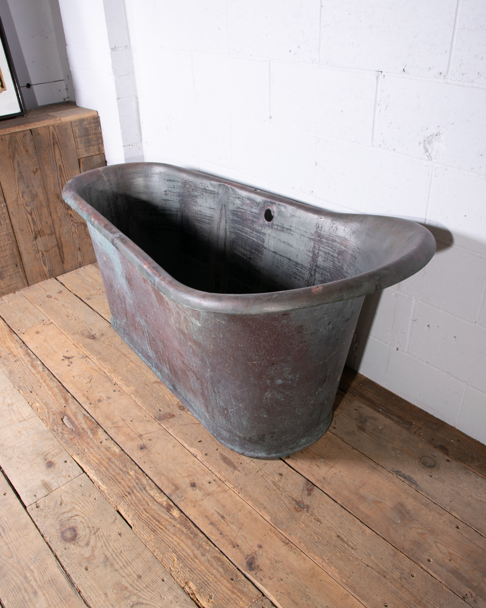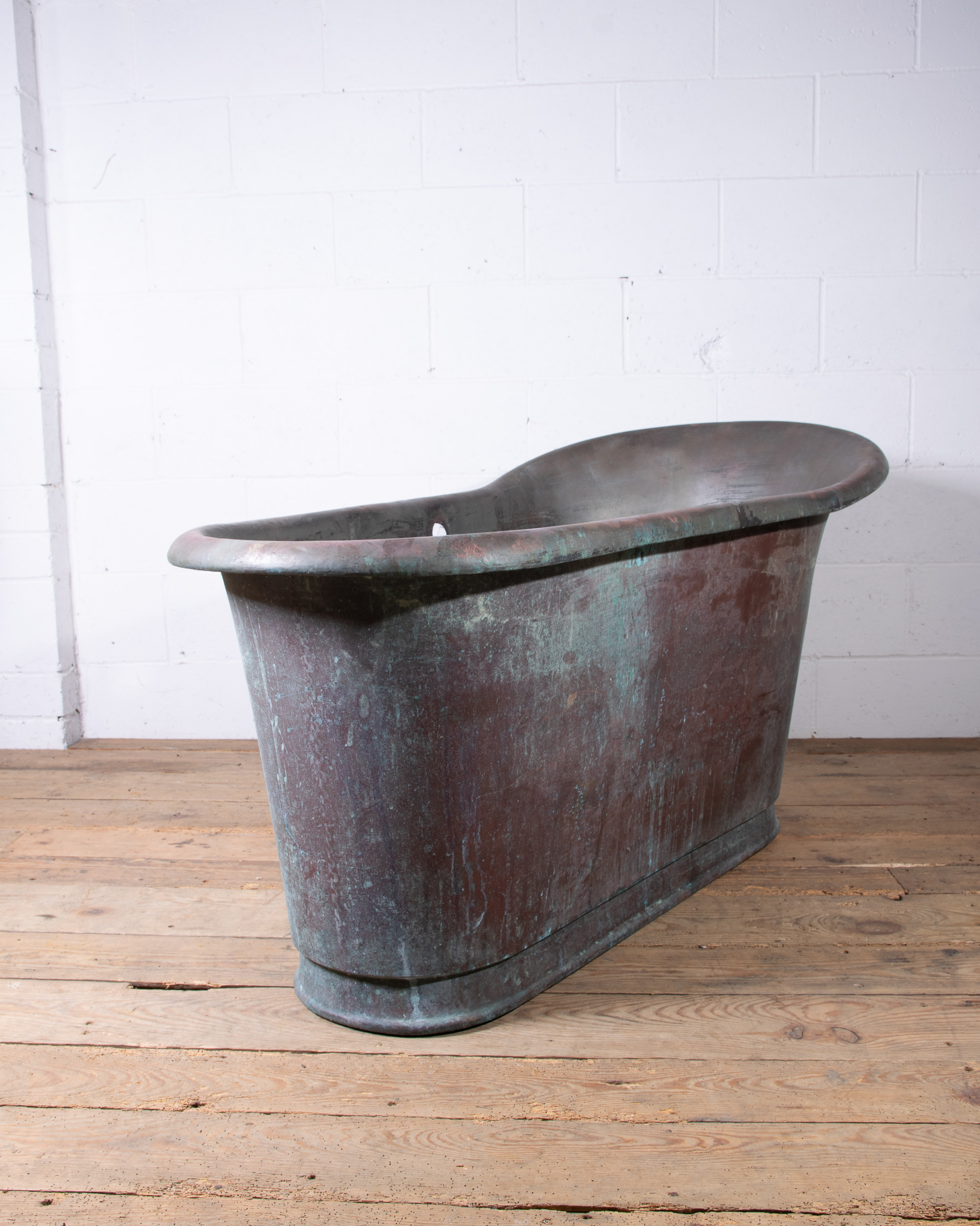 A stunning mid 19th century French copper slipper bathtub which would have once sat in a manor house. Large roll edge with tapering height and width, this bath has lovely comfortable proportions for modern use. Incredible patina inside and out.