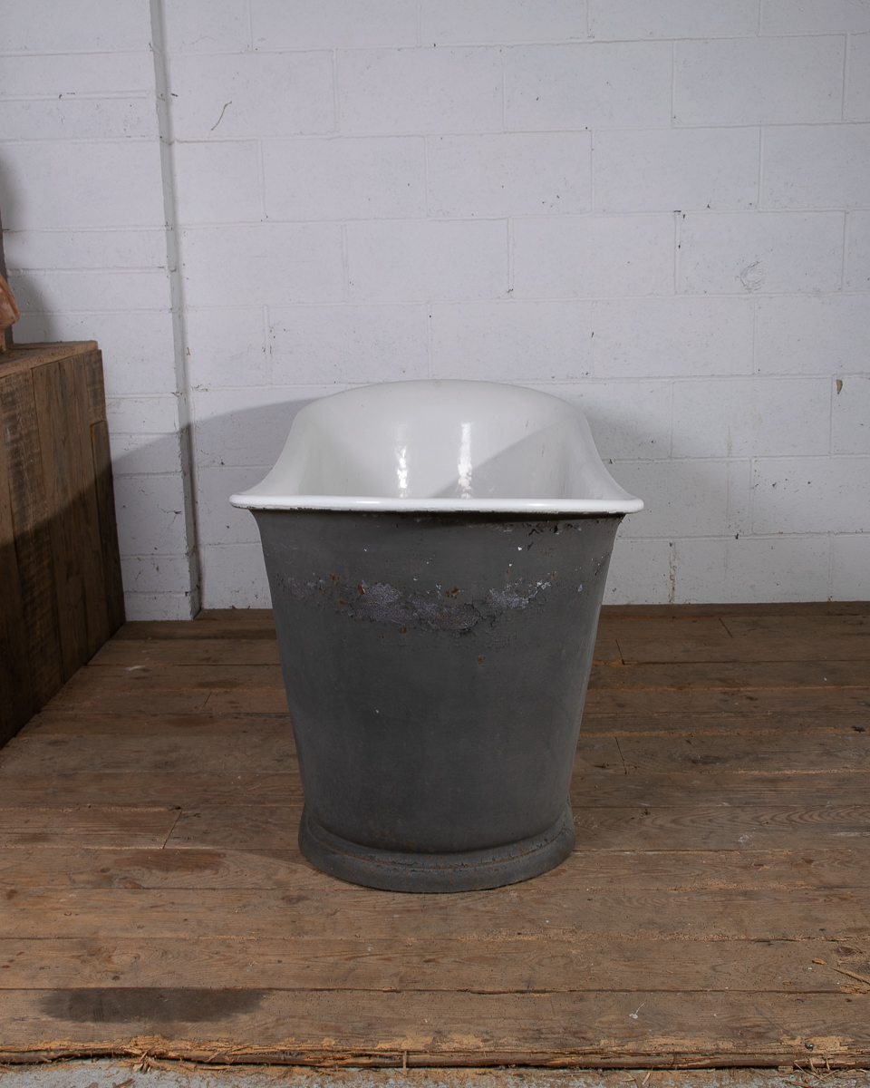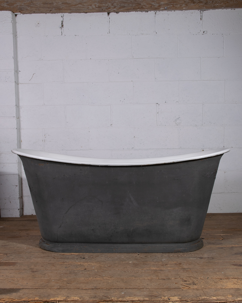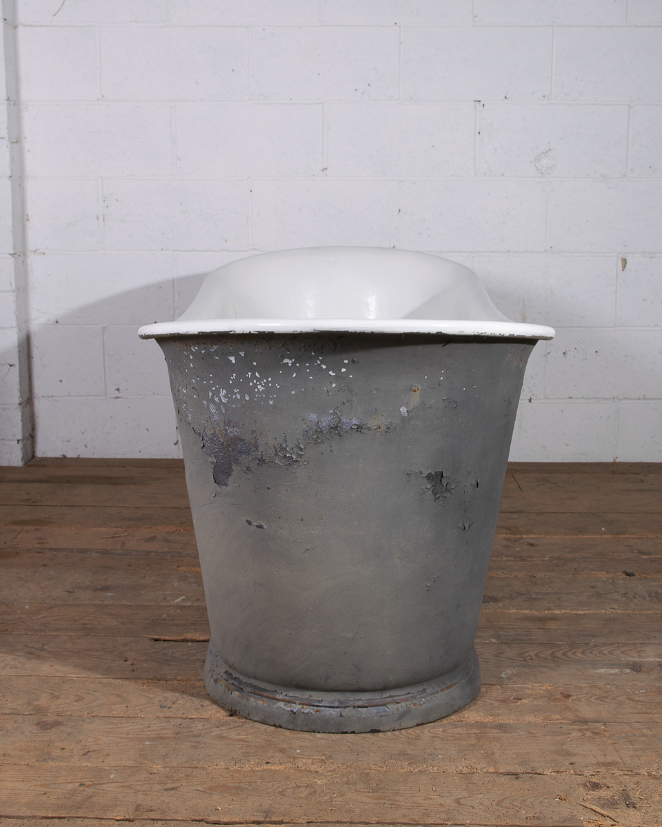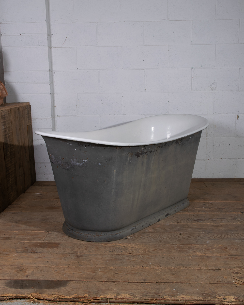 A beautifully shaped cast iron empire bathtub from around 1880 sitting on a plinth. Salvaged from a mas Provençal in Isle-sur-la sorgue this tub is currently in unrestored condition and is awaiting enamel resurfacing. Please contact us for enamel and exterior refurbishment options (not included in price).