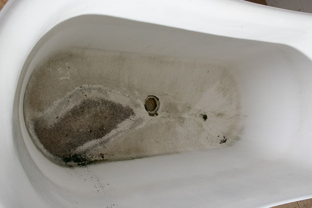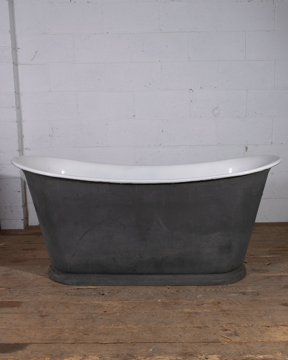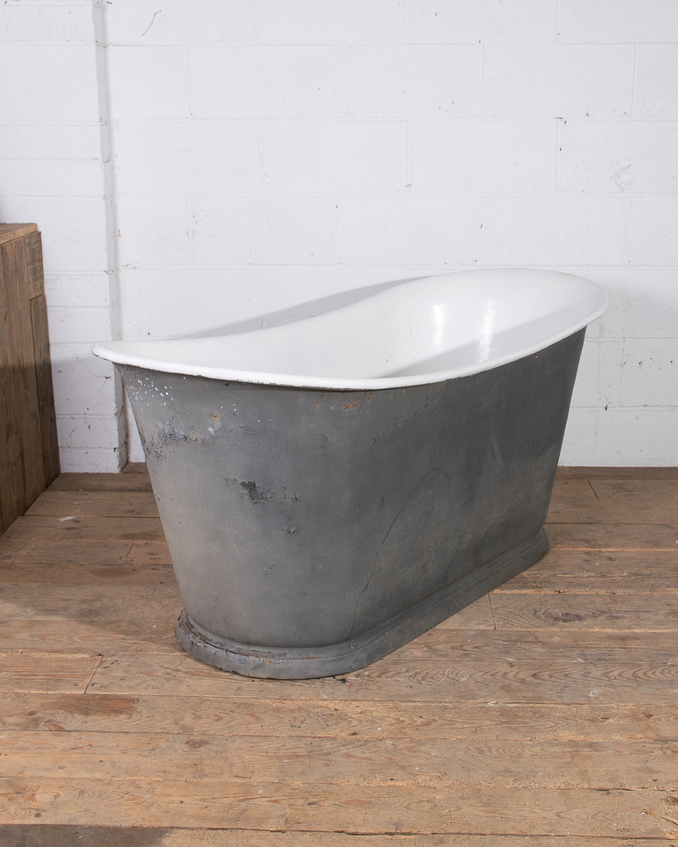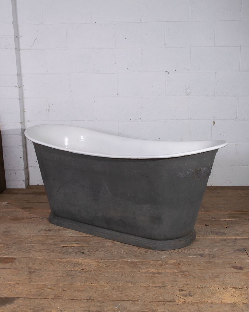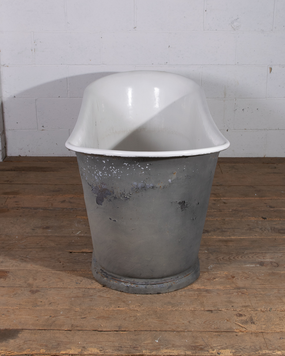 A beautifully shaped cast iron empire bathtub from around 1880 sitting on a plinth. Salvaged from a mas Provençal in Isle-sur-la sorgue this tub is currently in unrestored condition and is awaiting enamel resurfacing. Please contact us for enamel and exterior refurbishment options (not included in price).