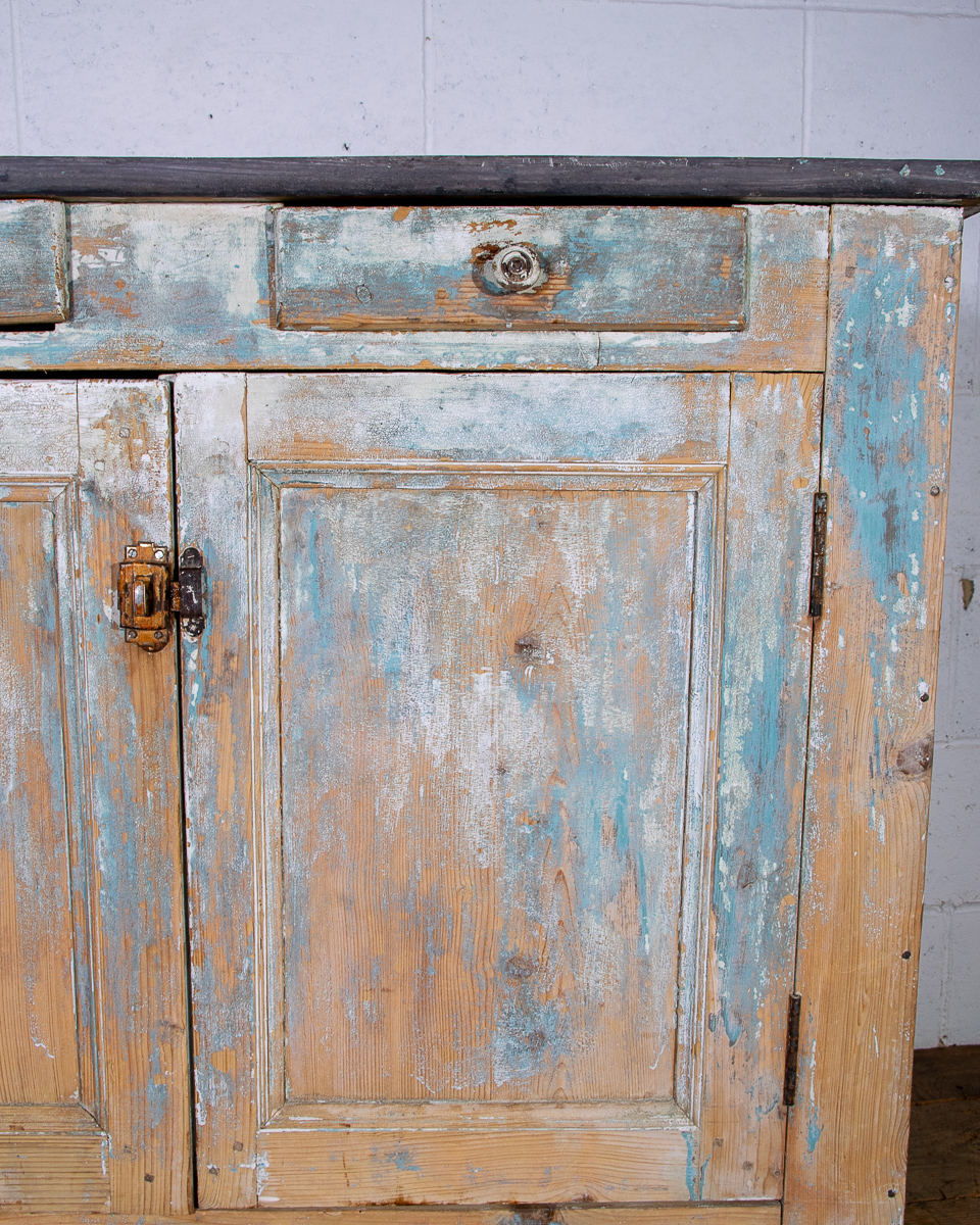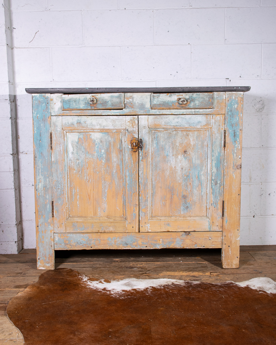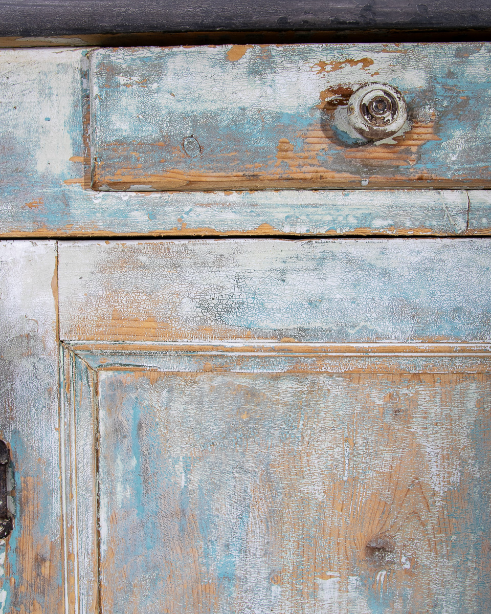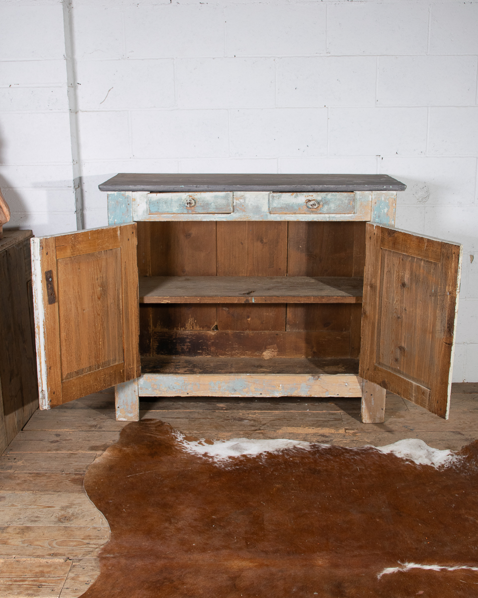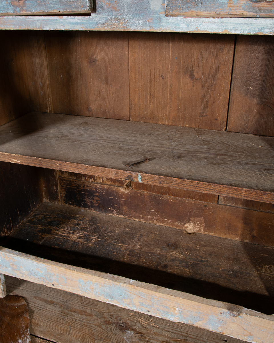 An early 20th century pitchpine French painted cupboard with 2 drawers and 1 shelf. Original light blue paintwork that has been partially stripped to enhance the patina.