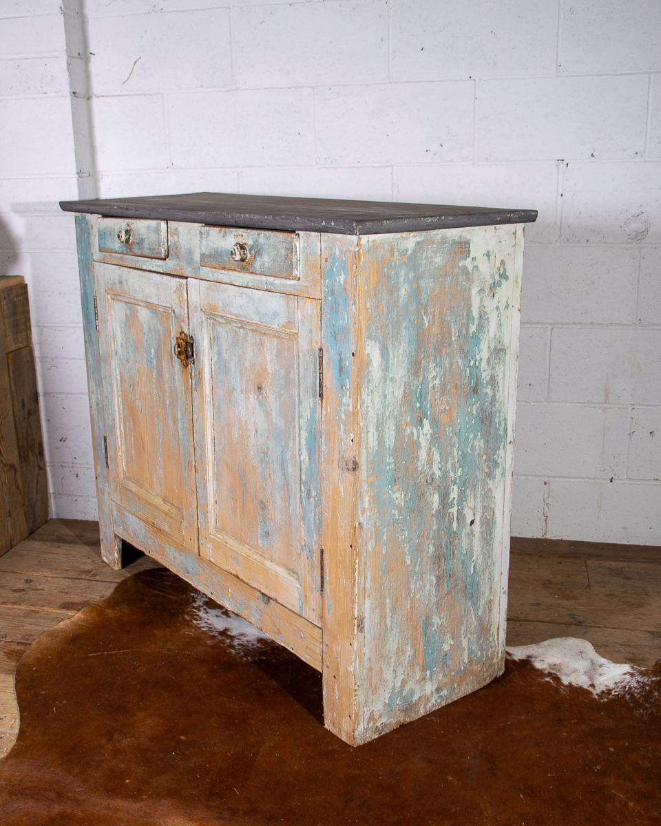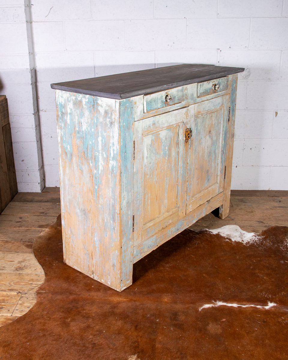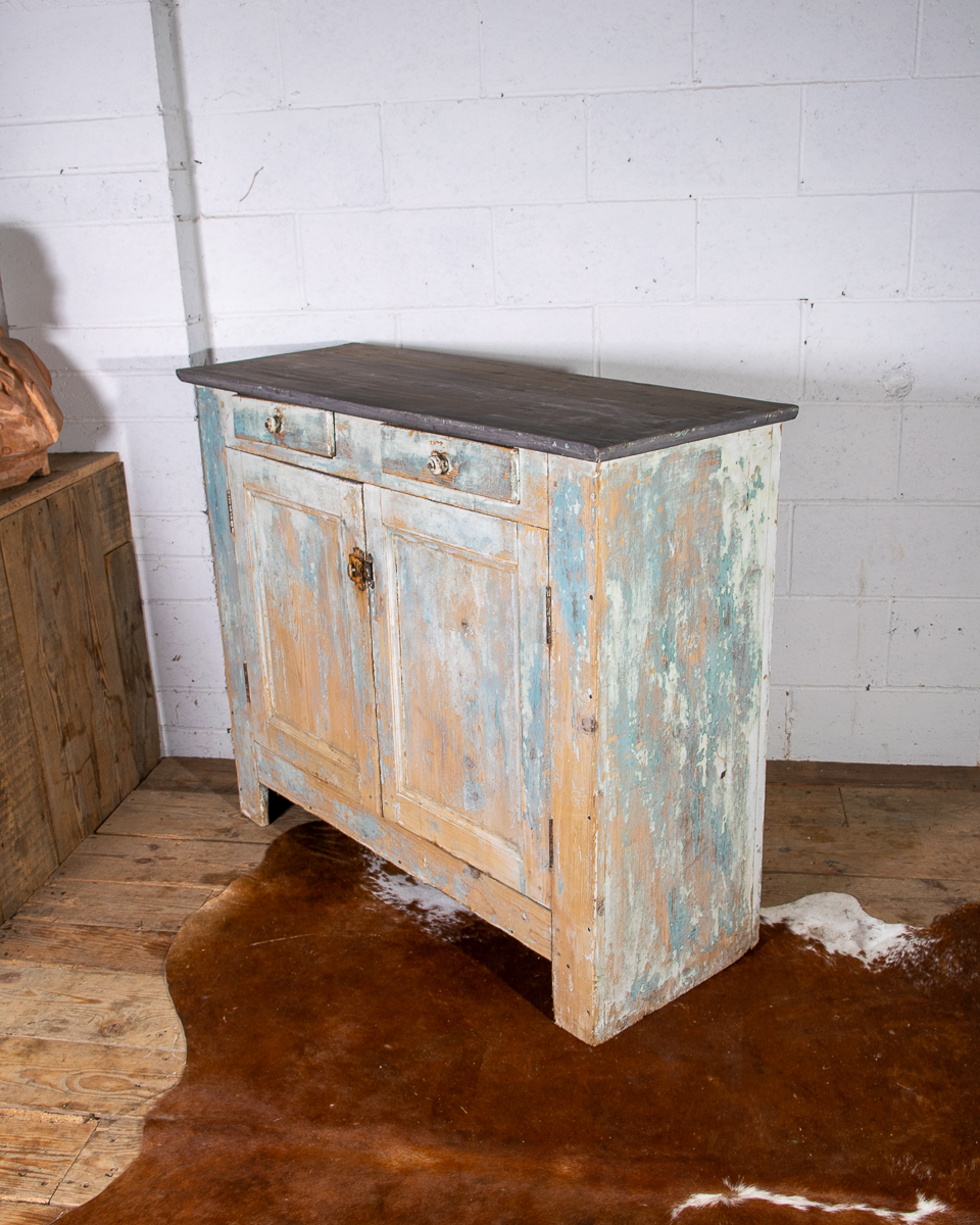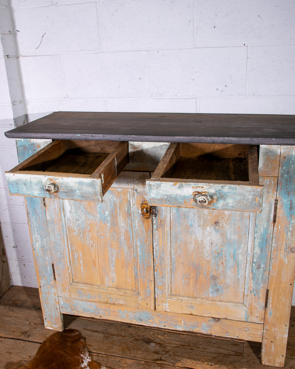An early 20th century pitchpine French painted cupboard with 2 drawers and 1 shelf. Original light blue paintwork that has been partially stripped to enhance the patina.