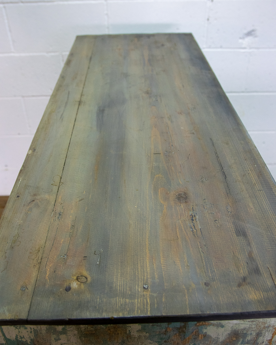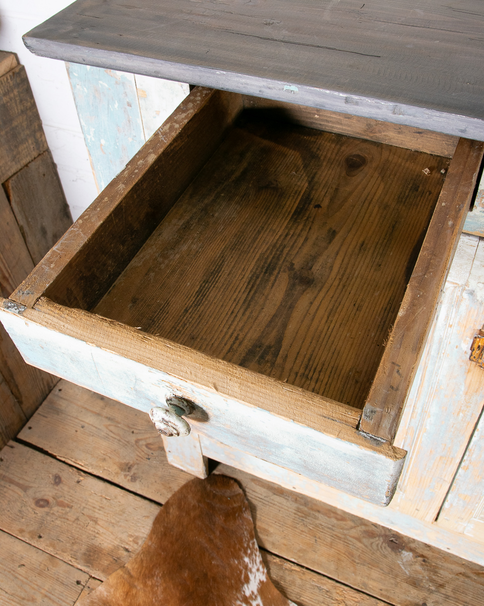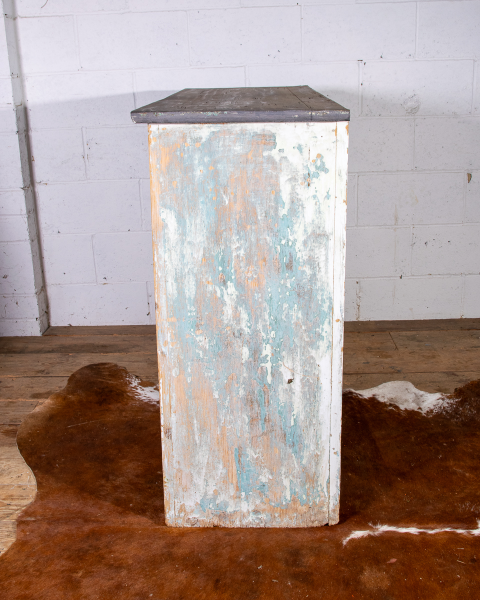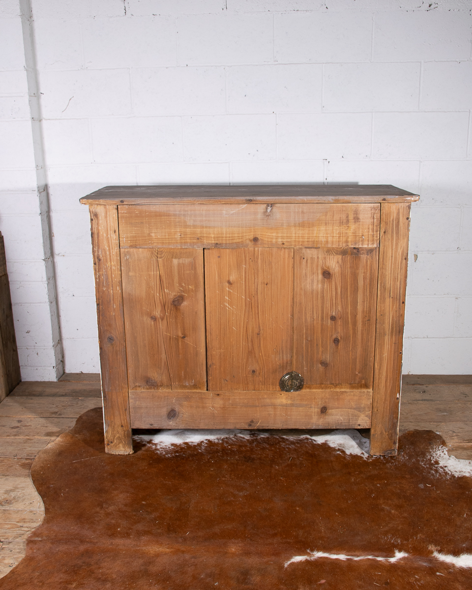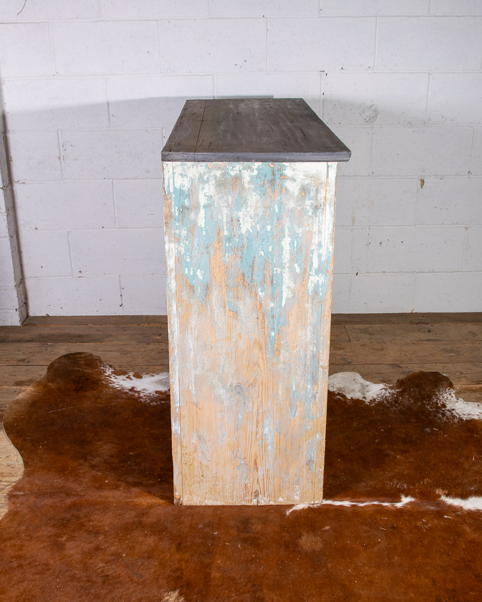 An early 20th century pitchpine French painted cupboard with 2 drawers and 1 shelf. Original light blue paintwork that has been partially stripped to enhance the patina.
