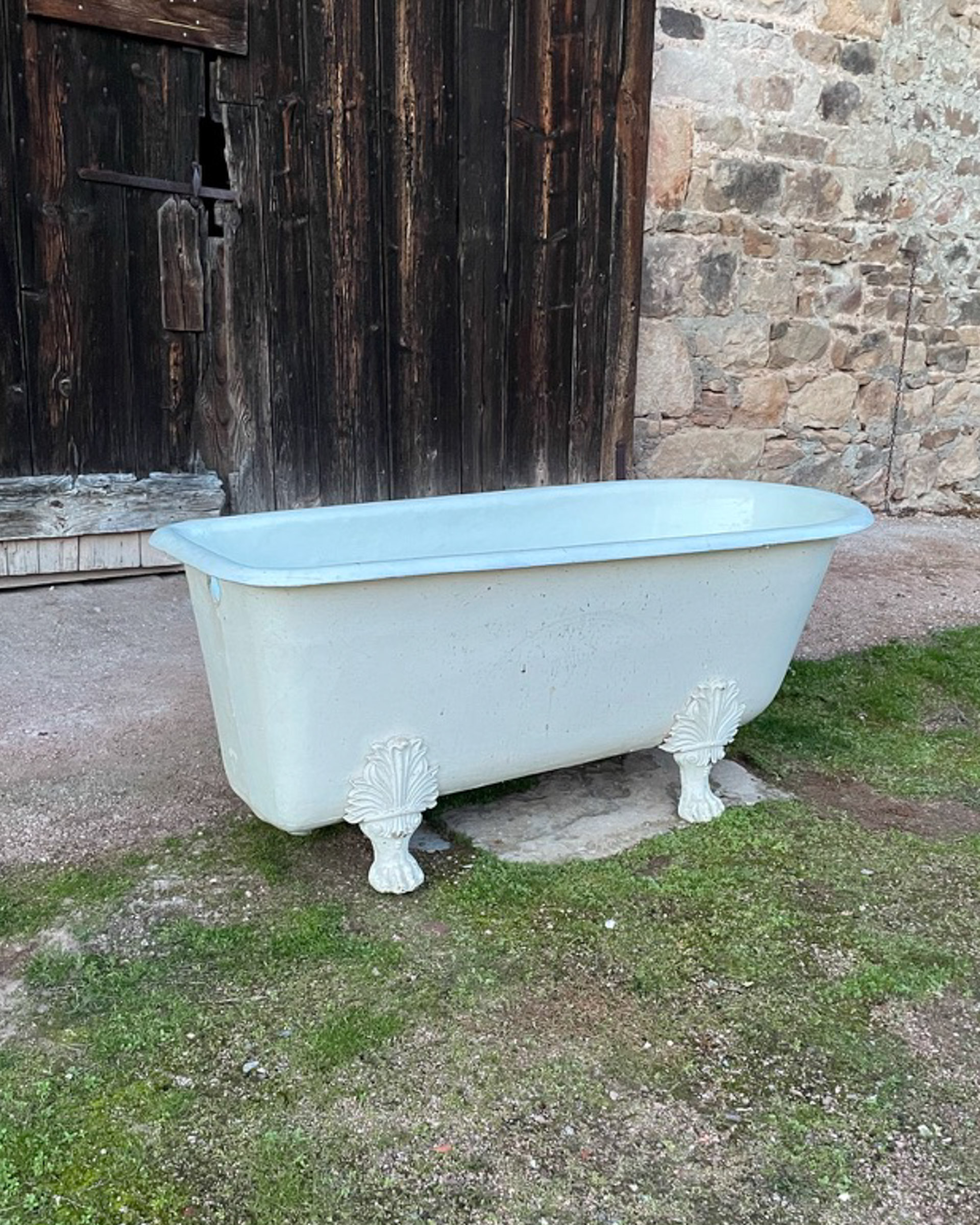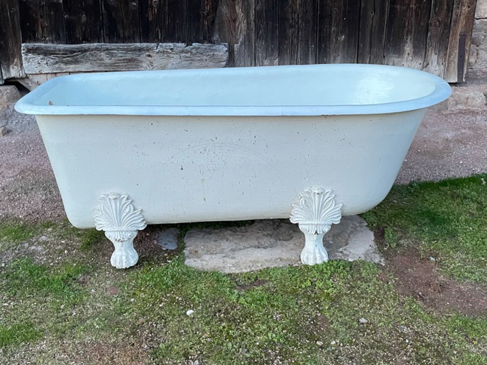 A generously proportioned 19th century French cast iron lionfoot bathtub. The tub is wider and deeper than usual with thick rolled and imposing lionfeet. Reclaimed from a chateau near Tours (video available of the uplift to confirm its provenance).