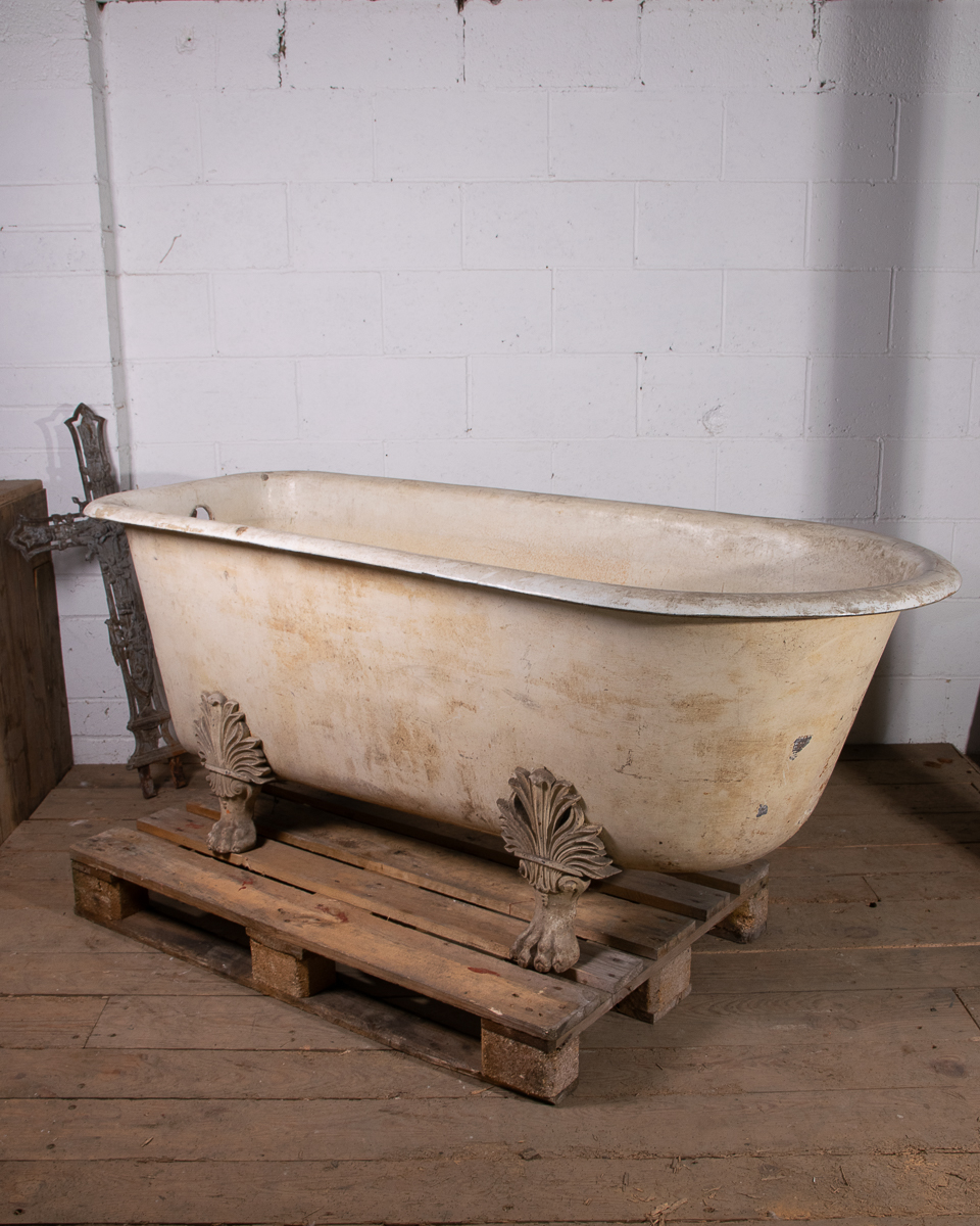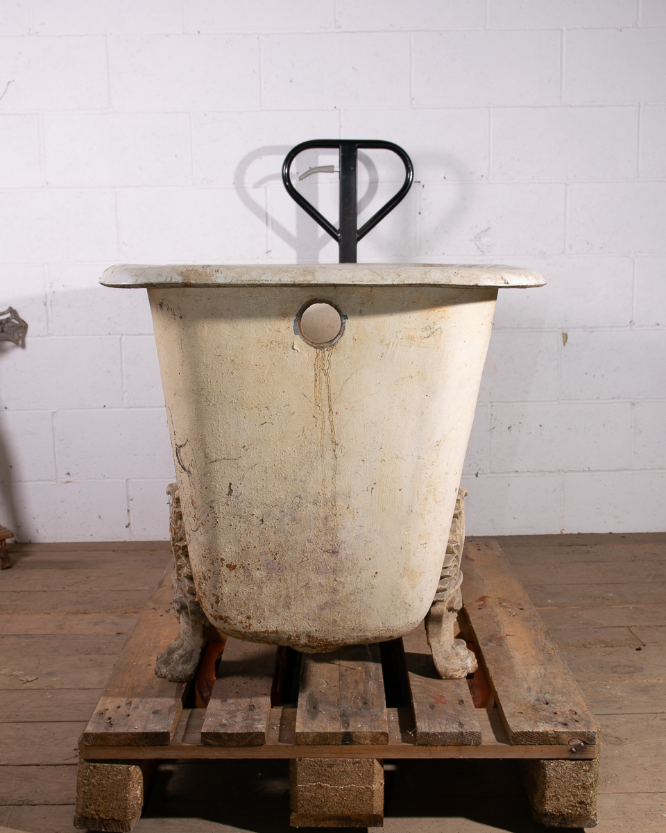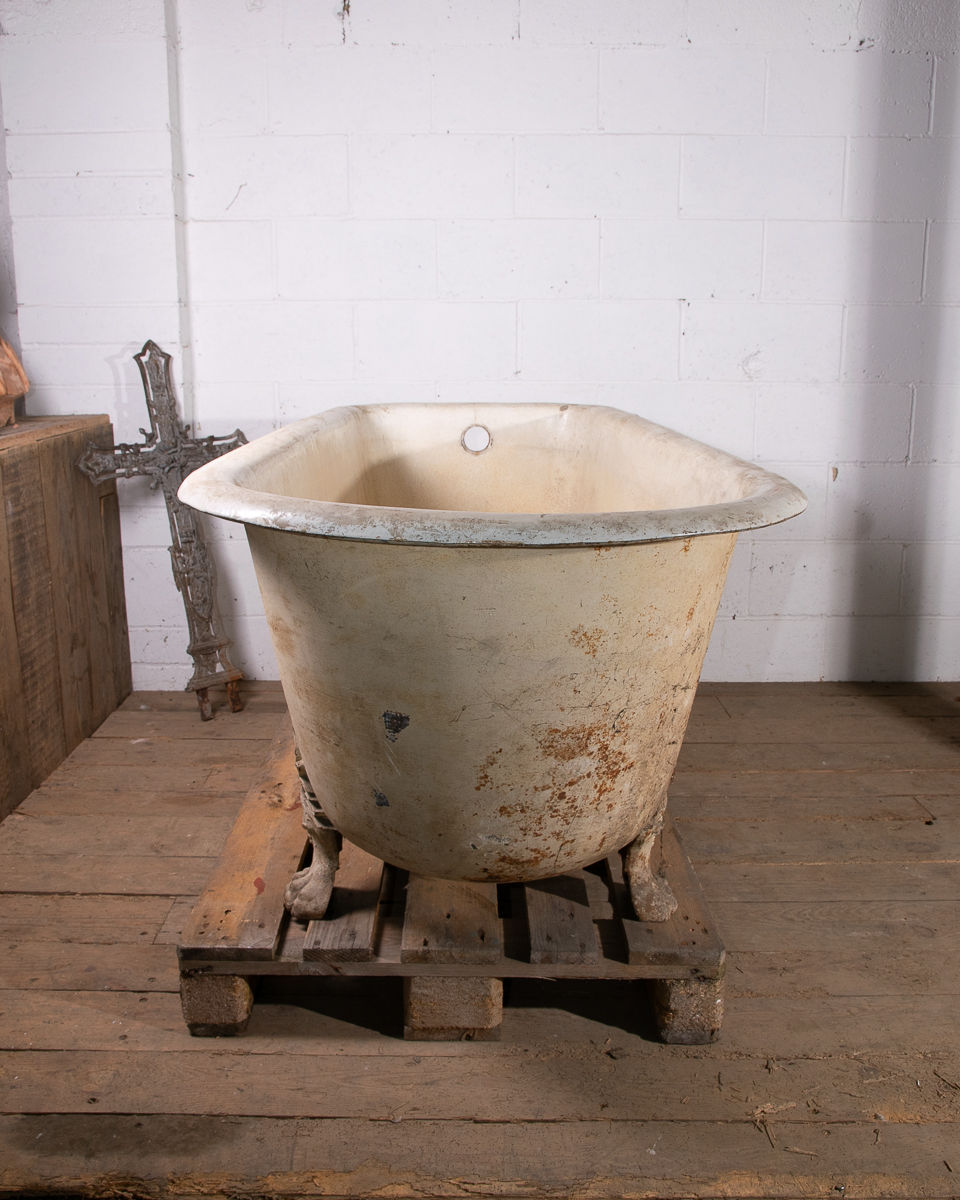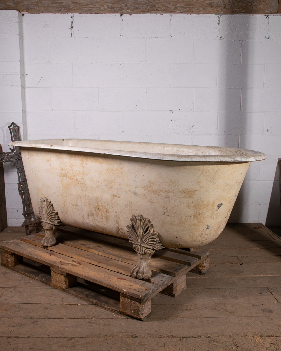 A single ended cast iron French bath from around 1900. The bath is generously proportioned being wide and deep, 169cm long and sitting on imposing lion feet. Salvaged from a Maison bourgeoise near Paris, France. The tub is currently in unrestored condition and is awaiting enamel resurfacing and repainting. Please contact us for refurbishment options (not included in price).