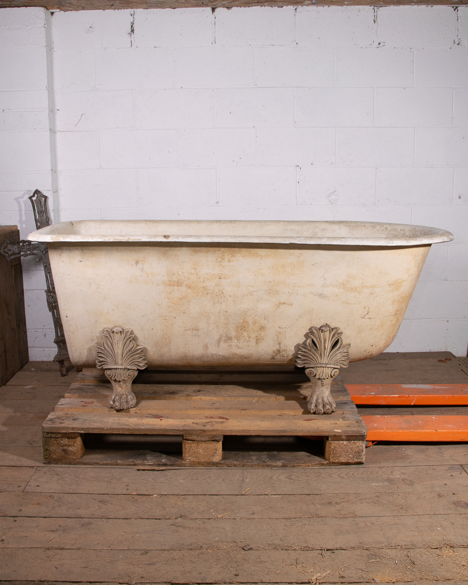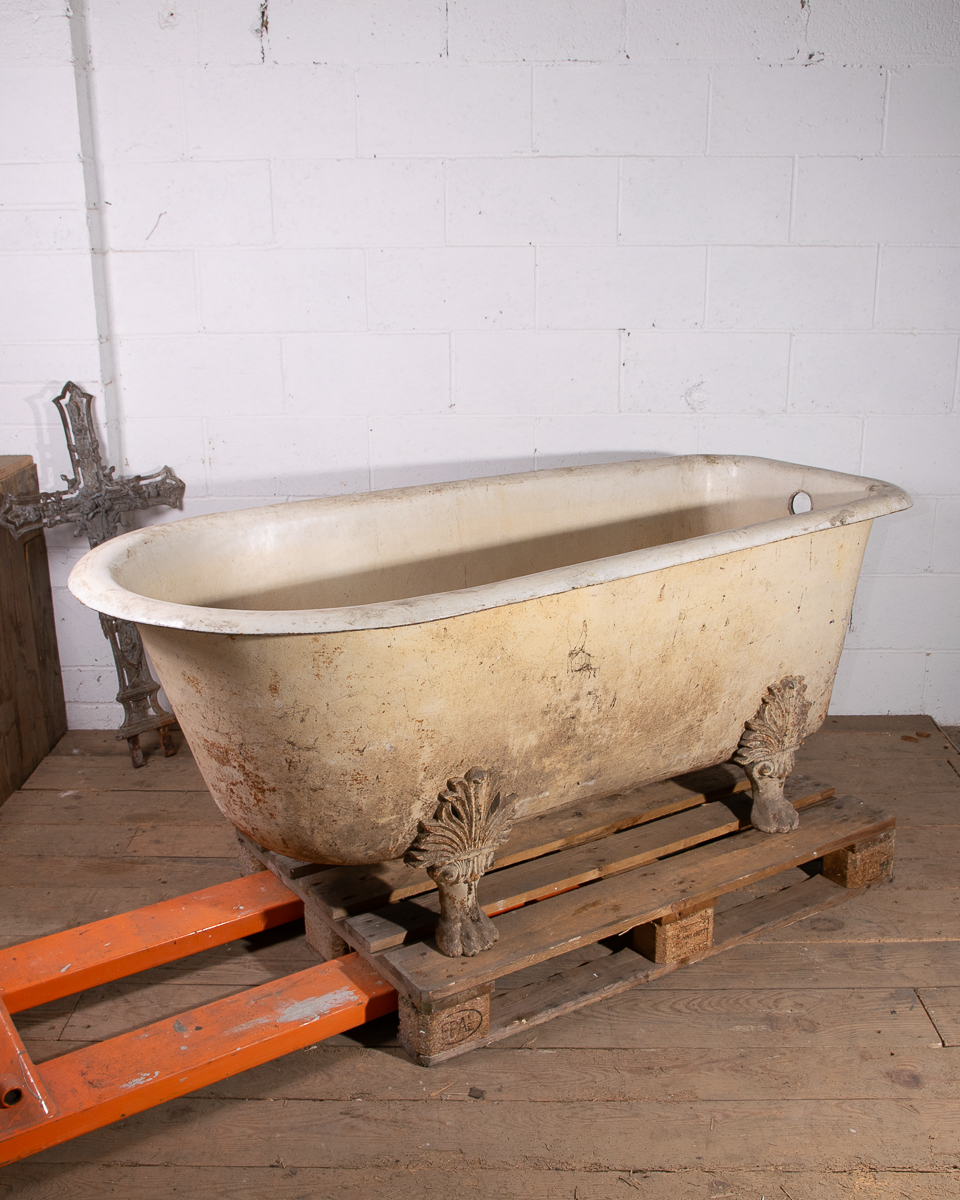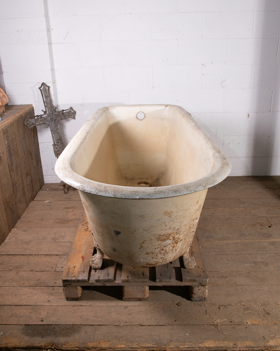 A single ended cast iron French bath from around 1900. The bath is generously proportioned being wide and deep, 169cm long and sitting on imposing lion feet. Salvaged from a Maison bourgeoise near Paris, France. The tub is currently in unrestored condition and is awaiting enamel resurfacing and repainting. Please contact us for refurbishment options (not included in price).