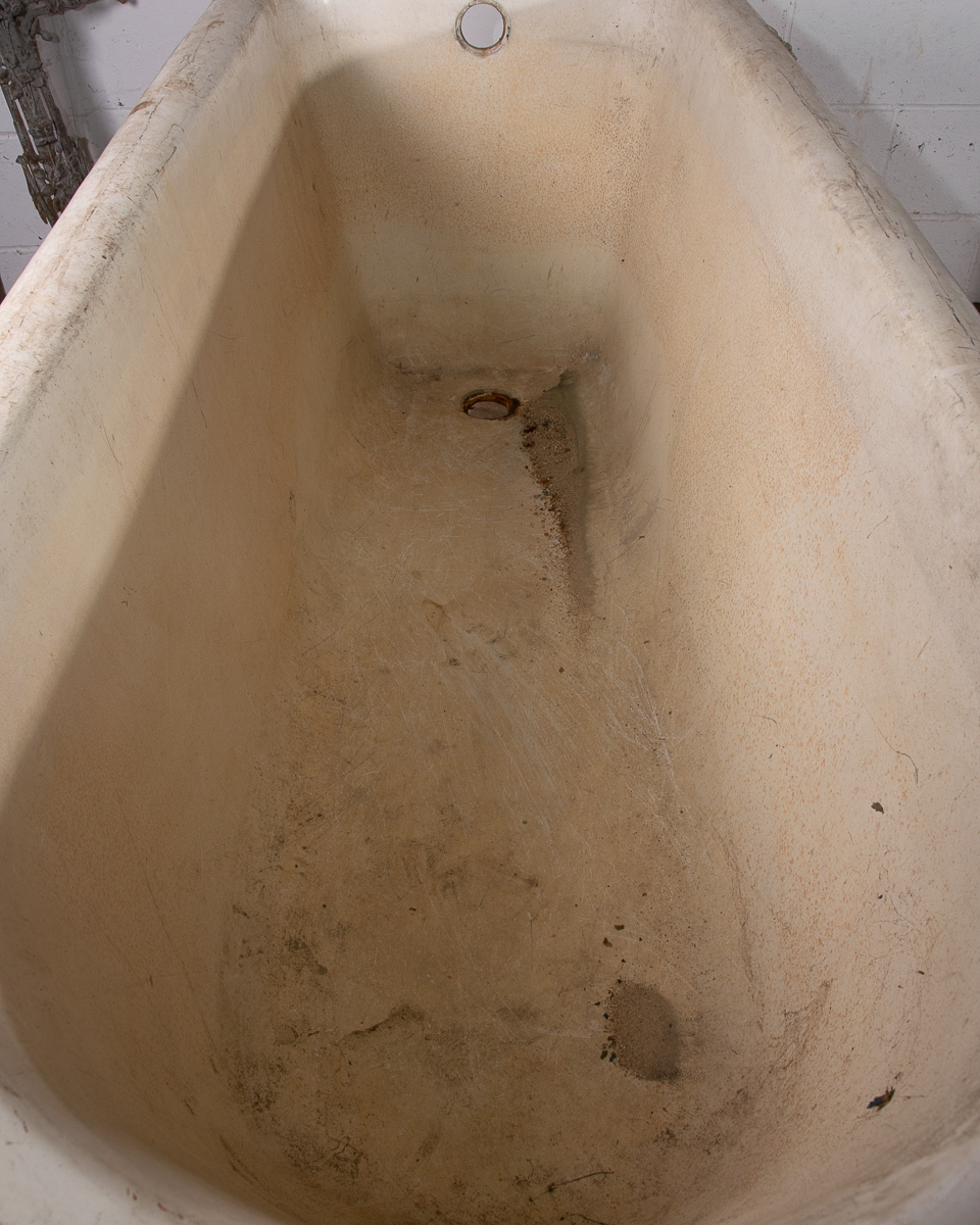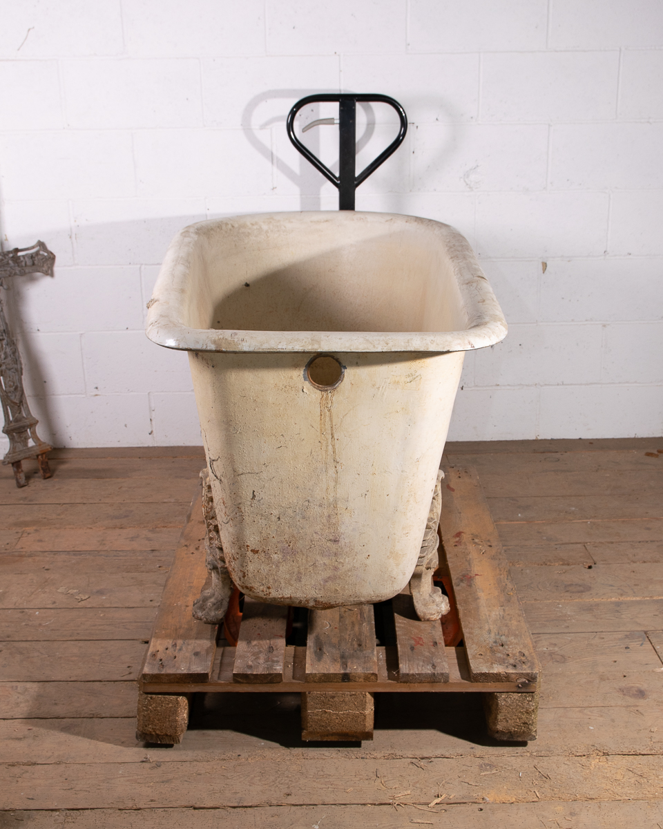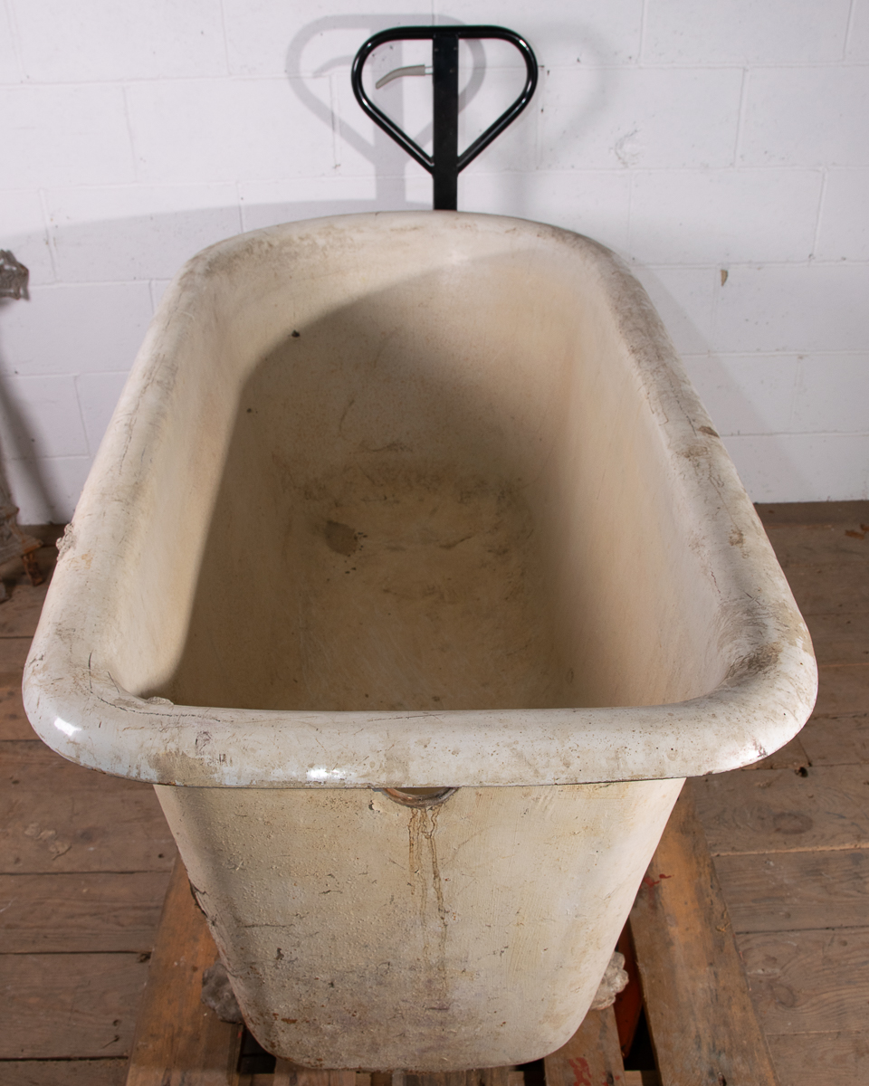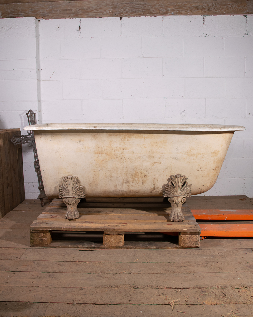 A single ended cast iron French bath from around 1900. The bath is generously proportioned being wide and deep, 169cm long and sitting on imposing lion feet. Salvaged from a Maison bourgeoise near Paris, France. The tub is currently in unrestored condition and is awaiting enamel resurfacing and repainting. Please contact us for refurbishment options (not included in price).