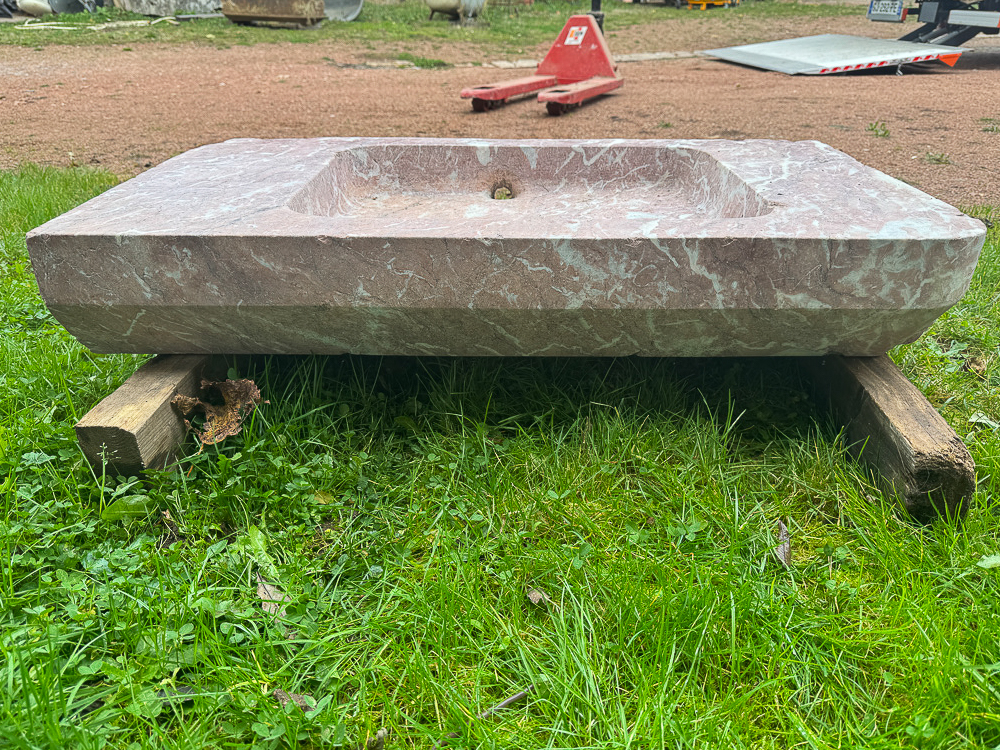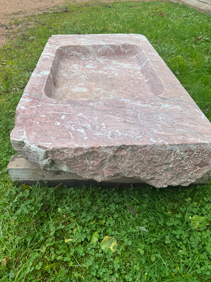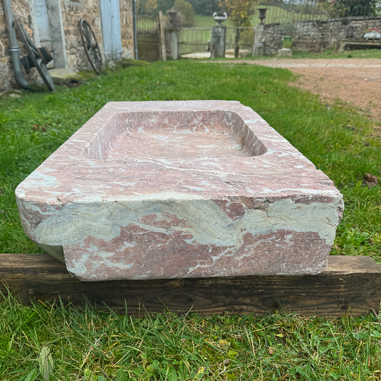 A late 18th century / early 19th century hand-antique marble basin made from Villefranche-de-Conflent marble from the mountains of Catalonia. Reclaimed from house outside Perpignan.