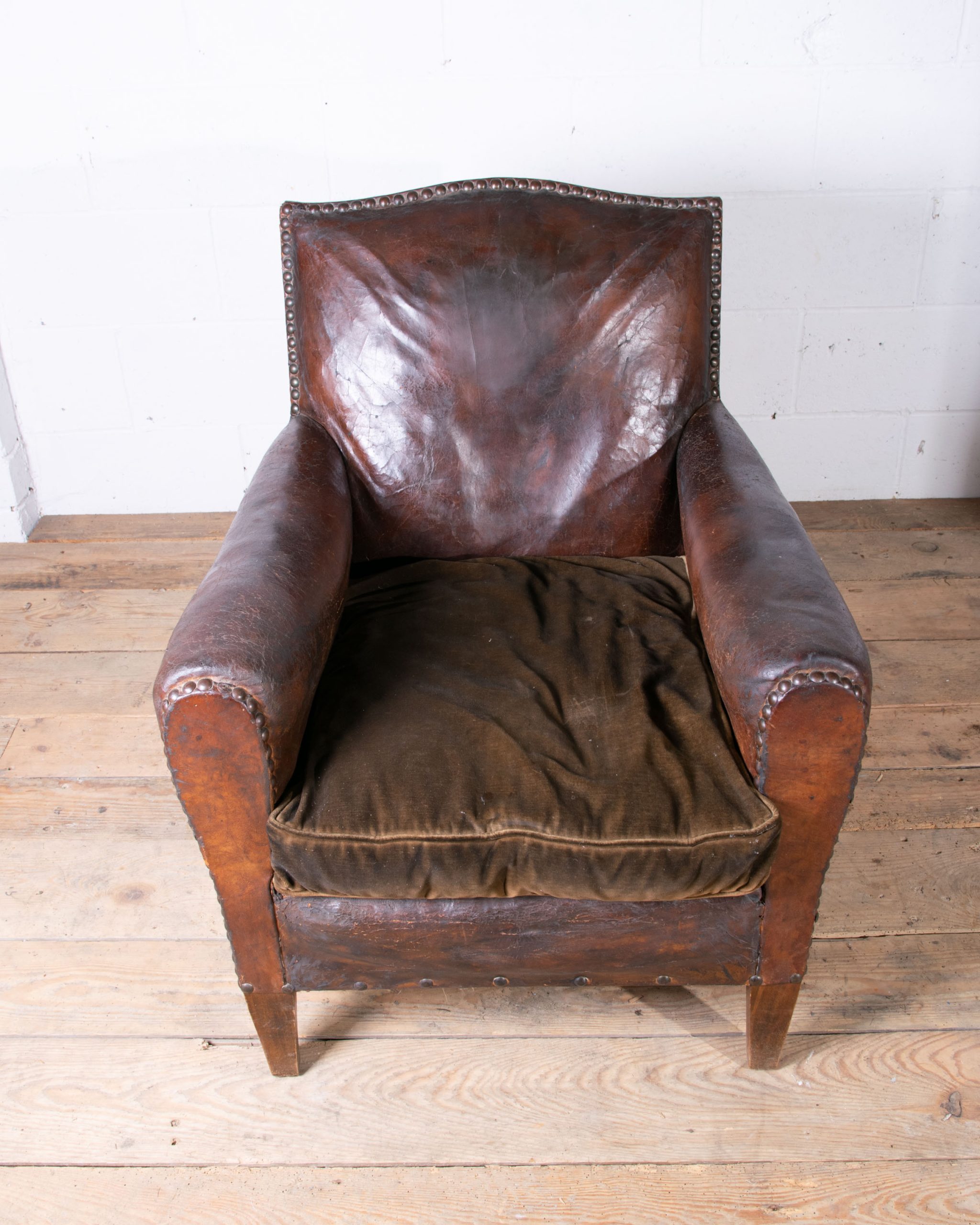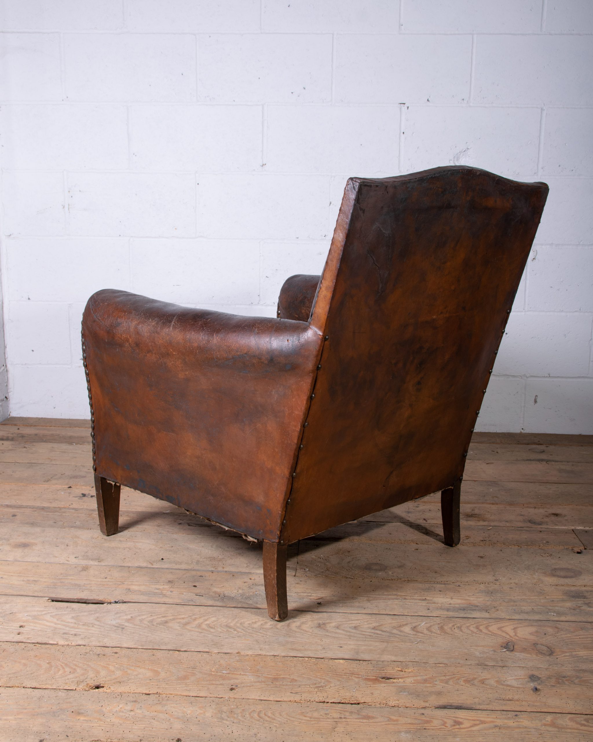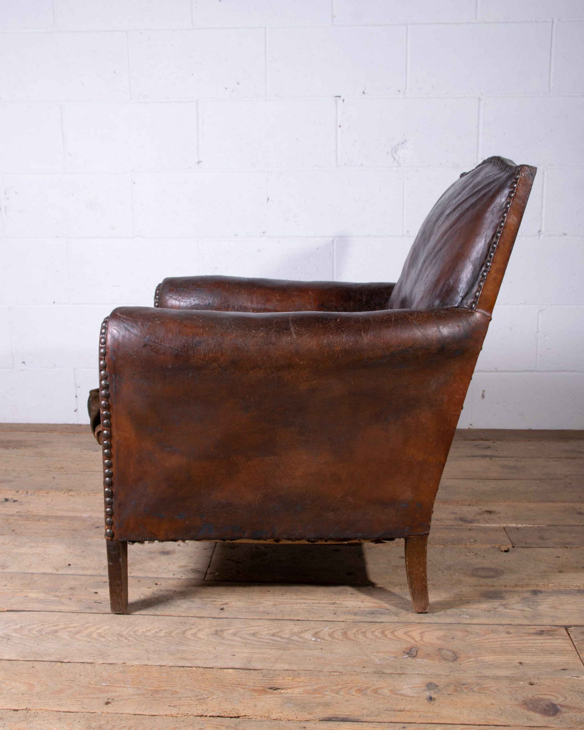 An early 20th century French studded brown leather club armchair.  Seat is firm and comfortable.  A new seat could be made up if preferred over the original.