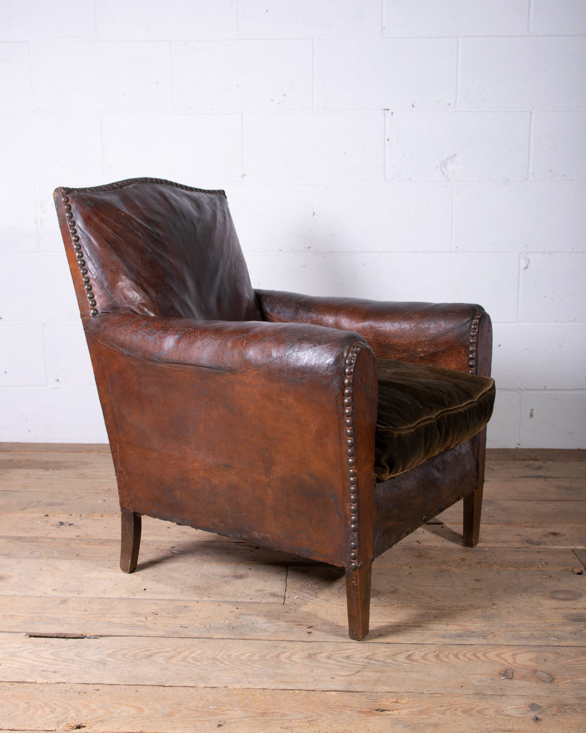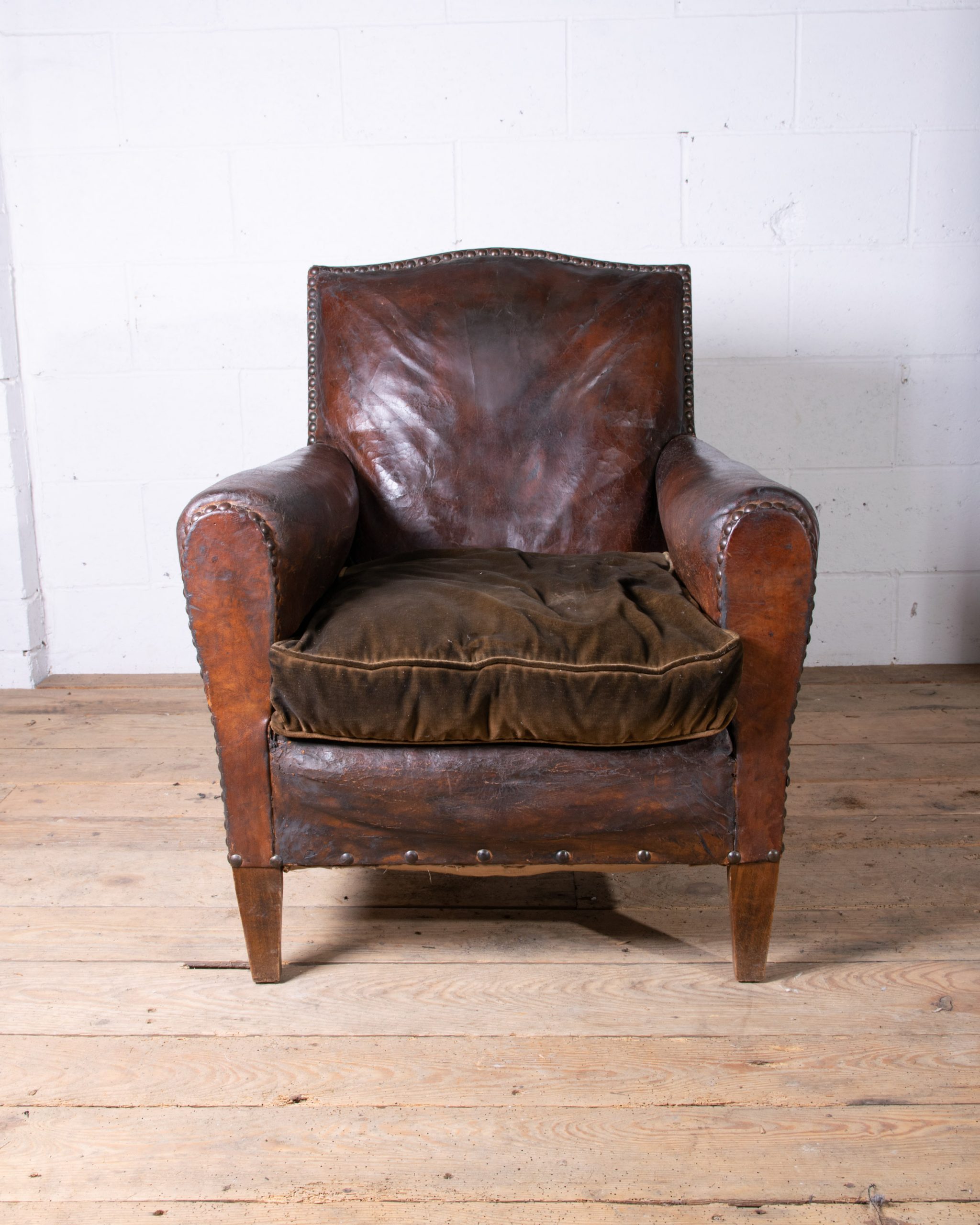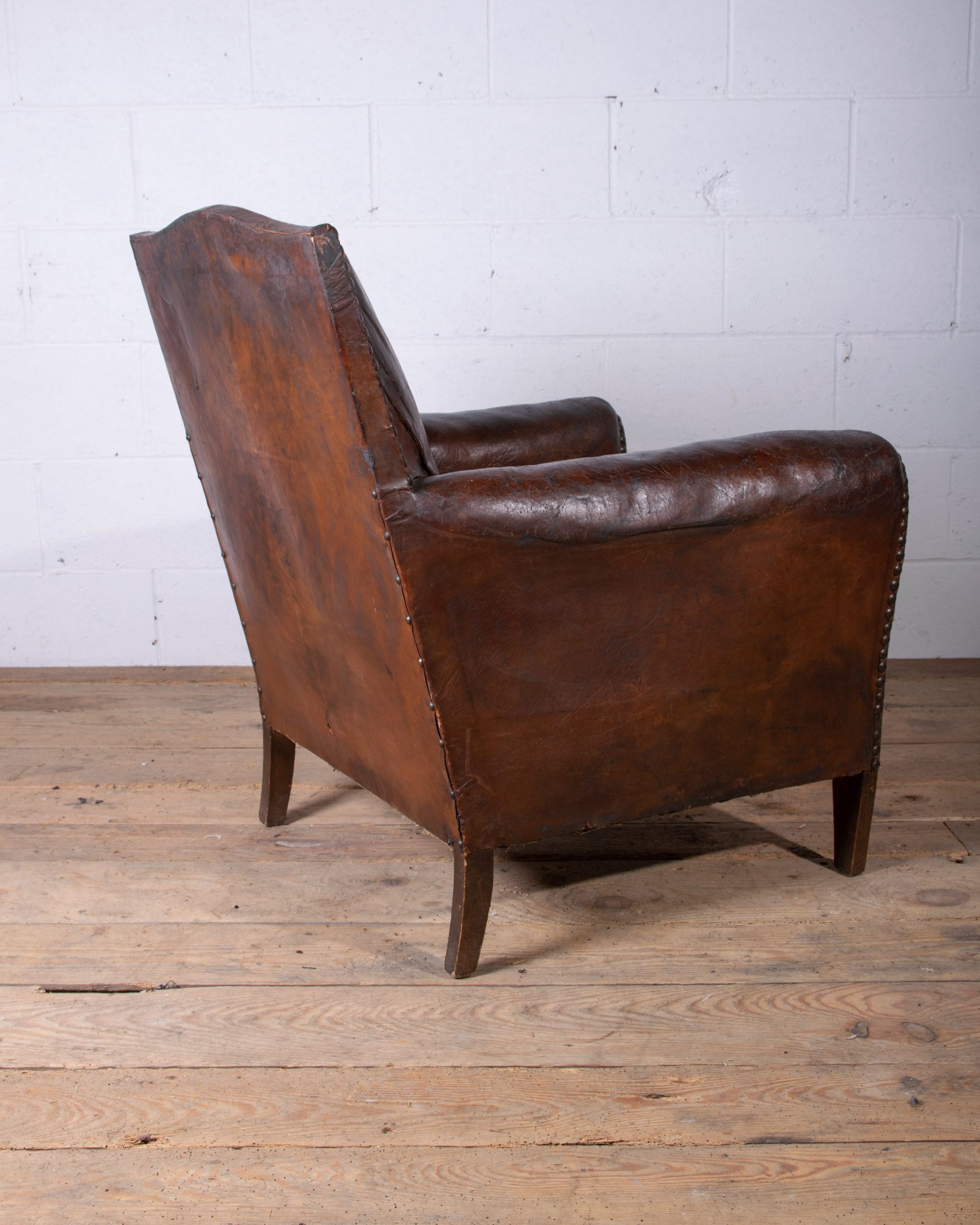 An early 20th century French studded brown leather club armchair.  Seat is firm and comfortable.  A new seat could be made up if preferred over the original.