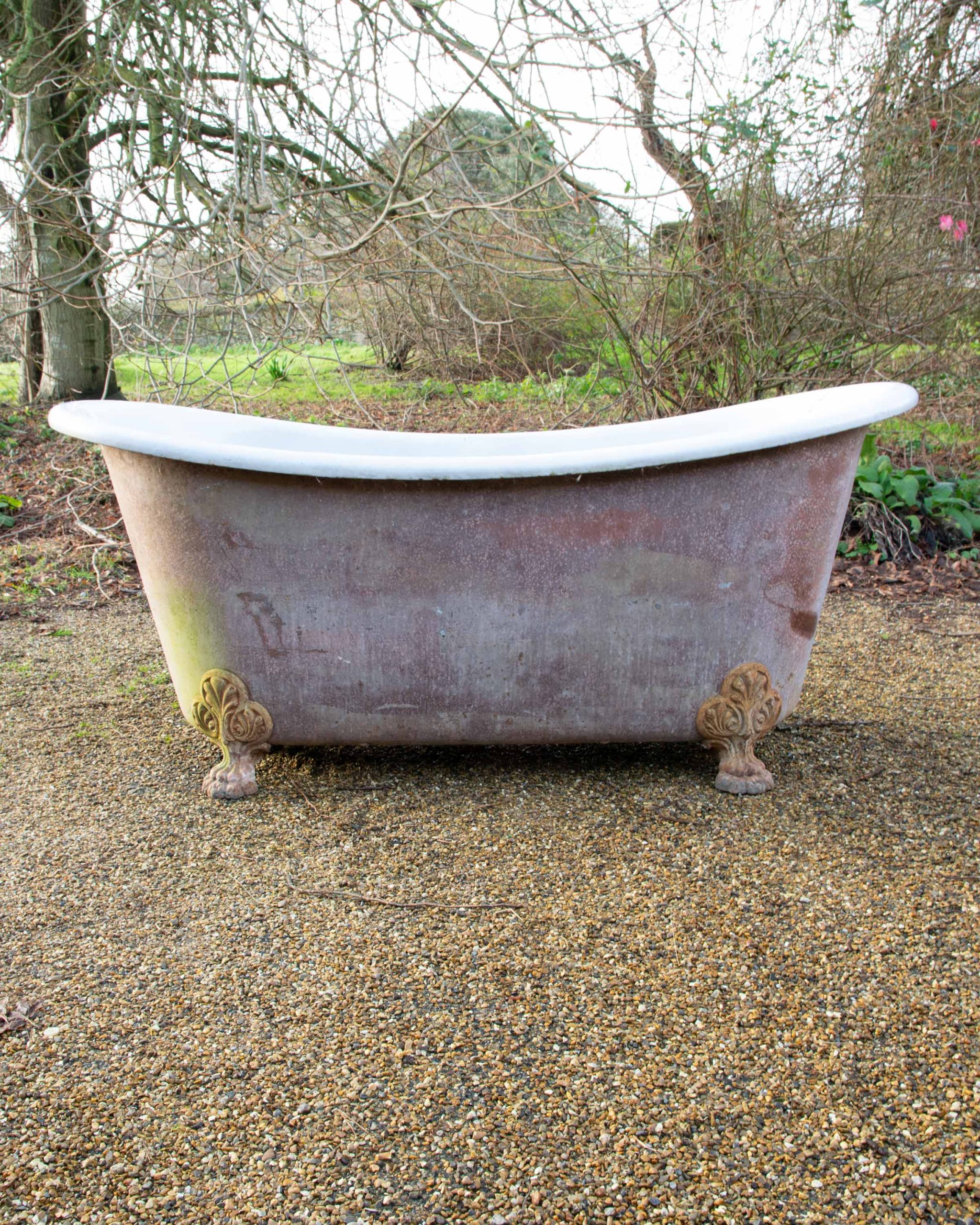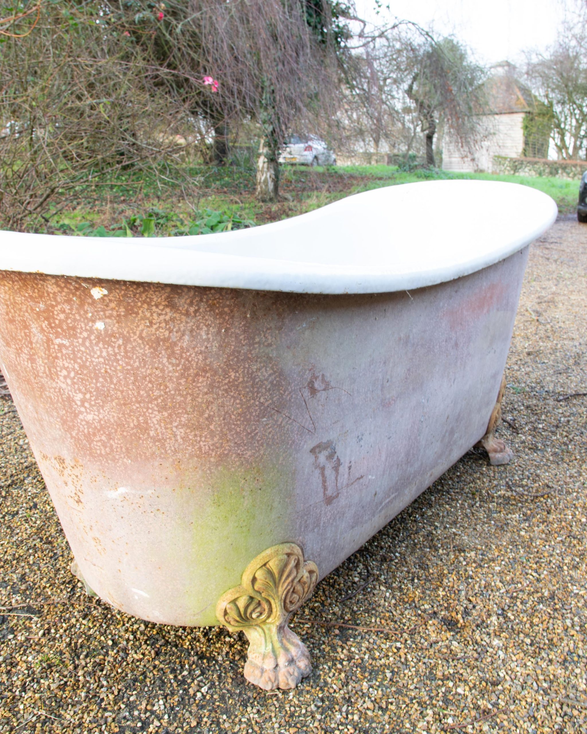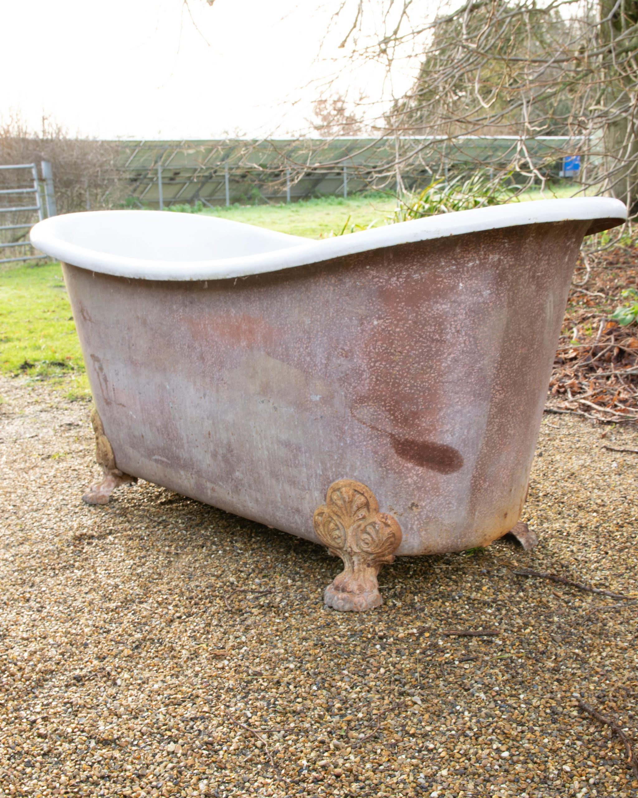 Late 19th century bateau bathtub on feet. In unrestored condition. Price includes resurfacing the interior enamel and shot blasting the exterior.