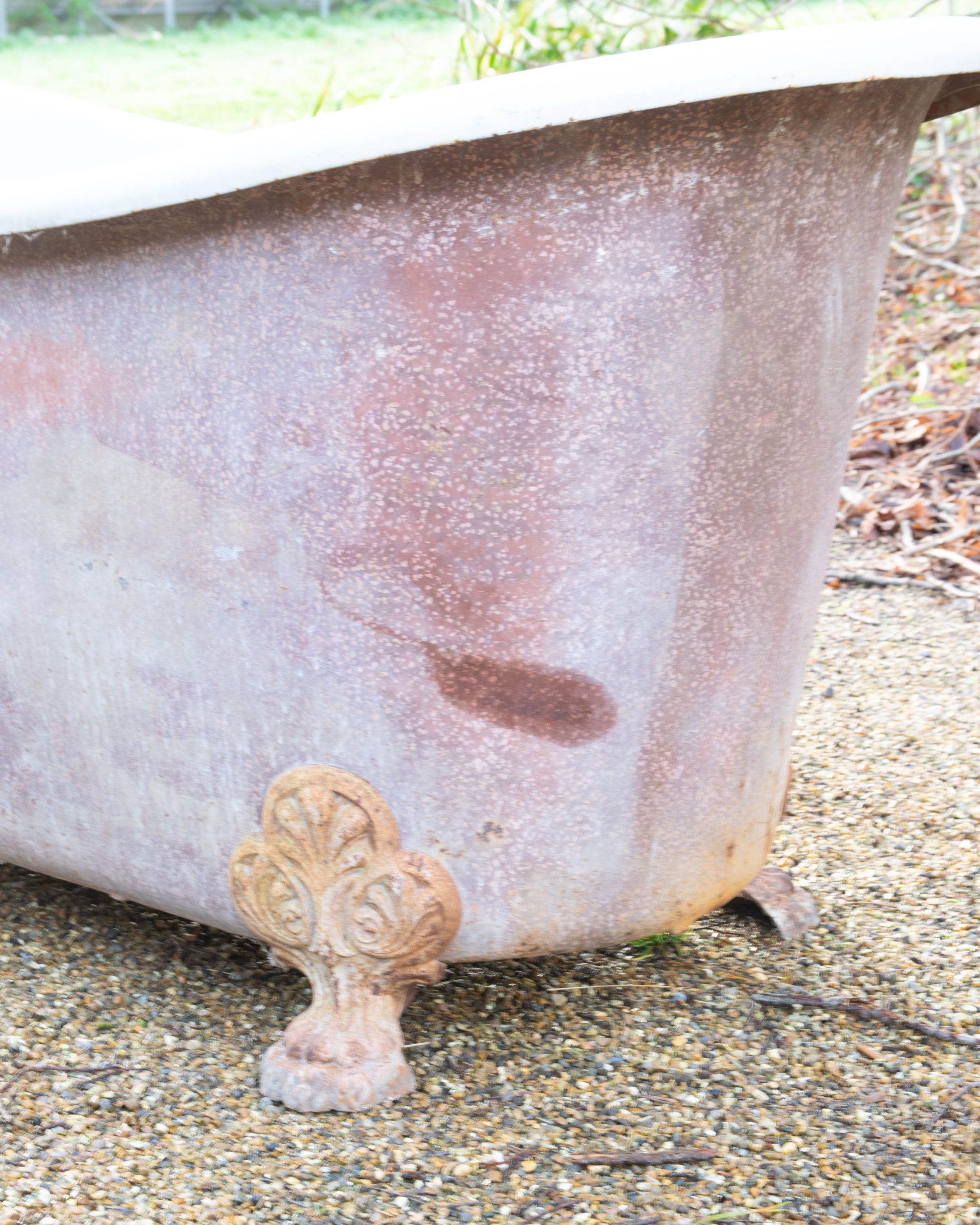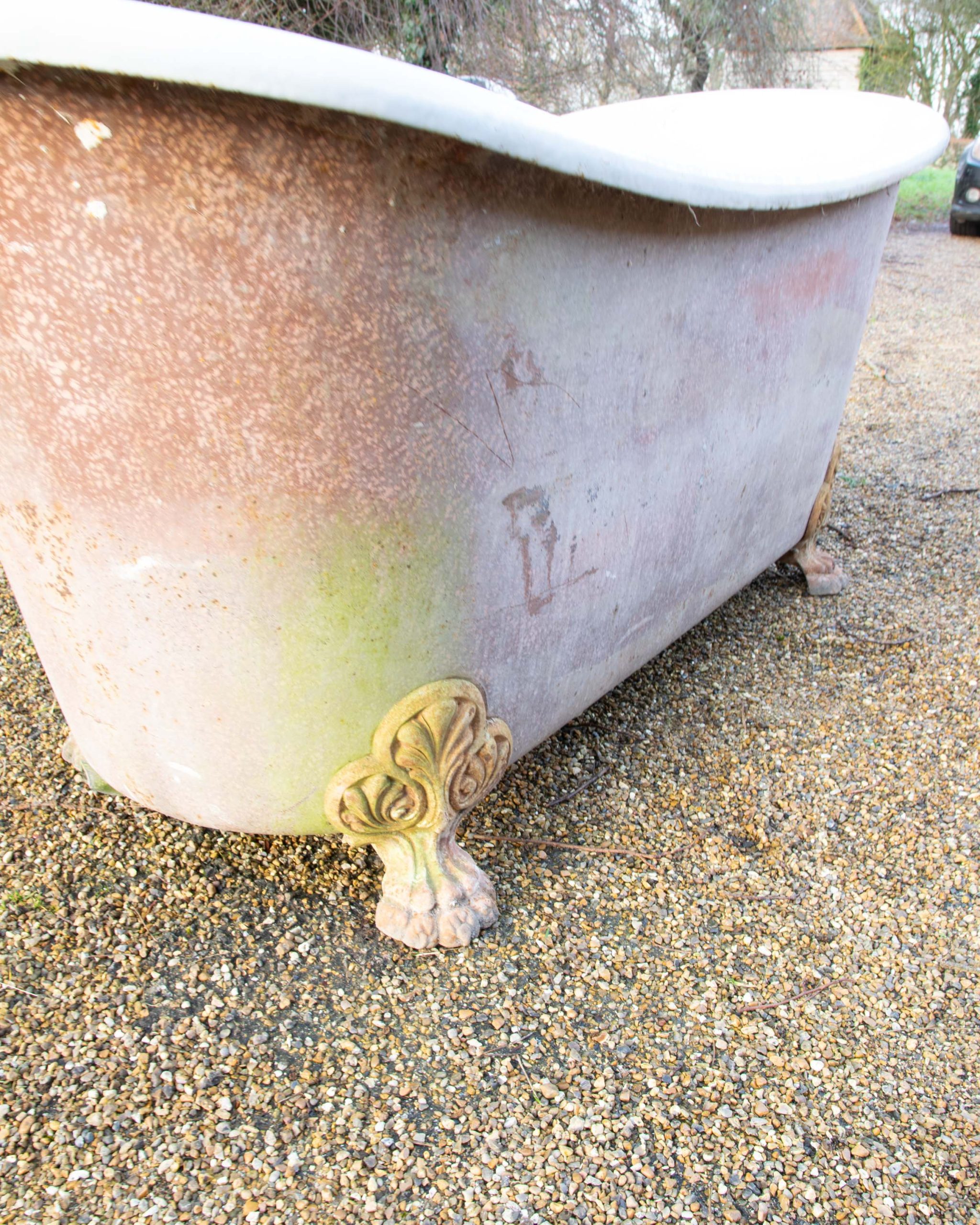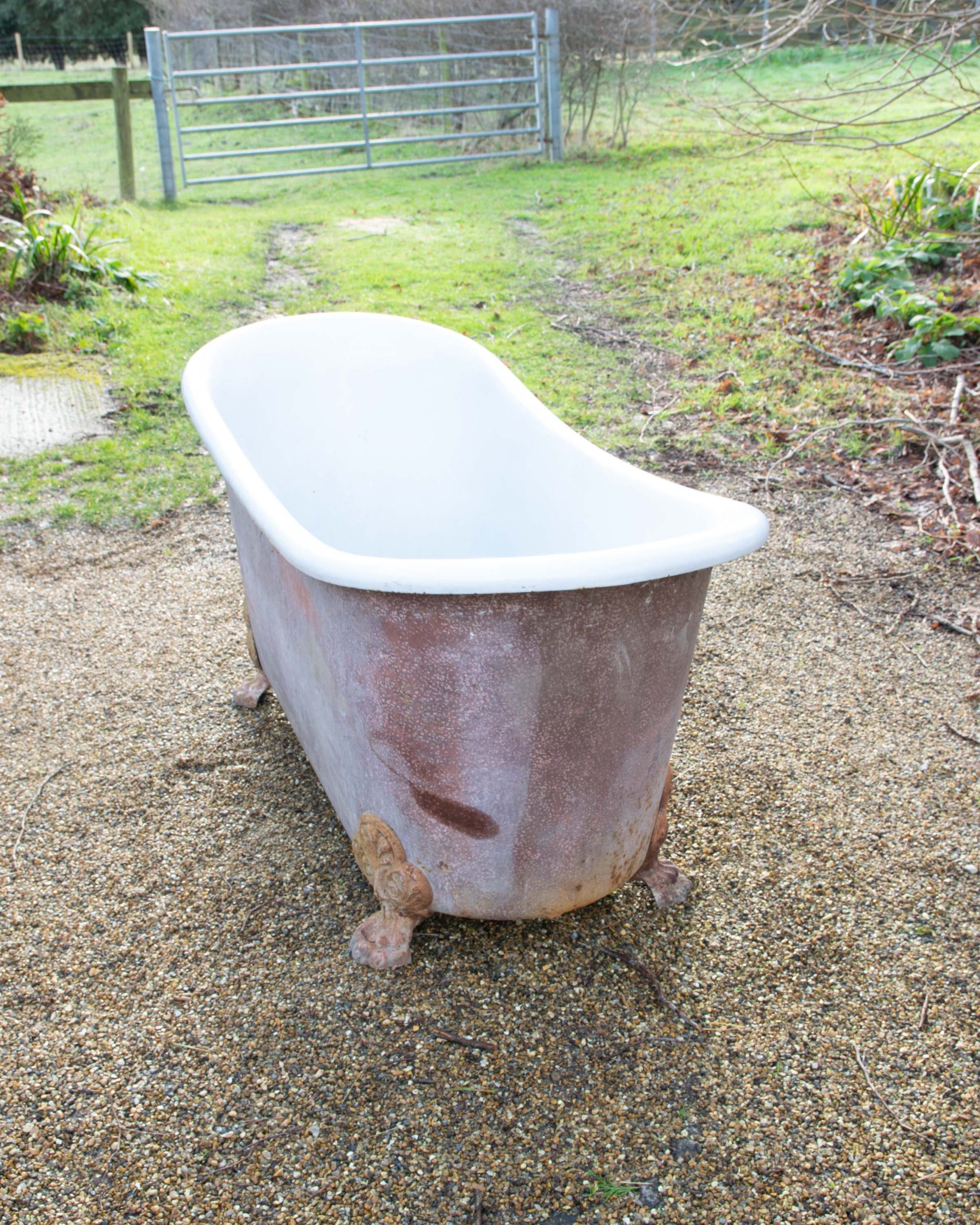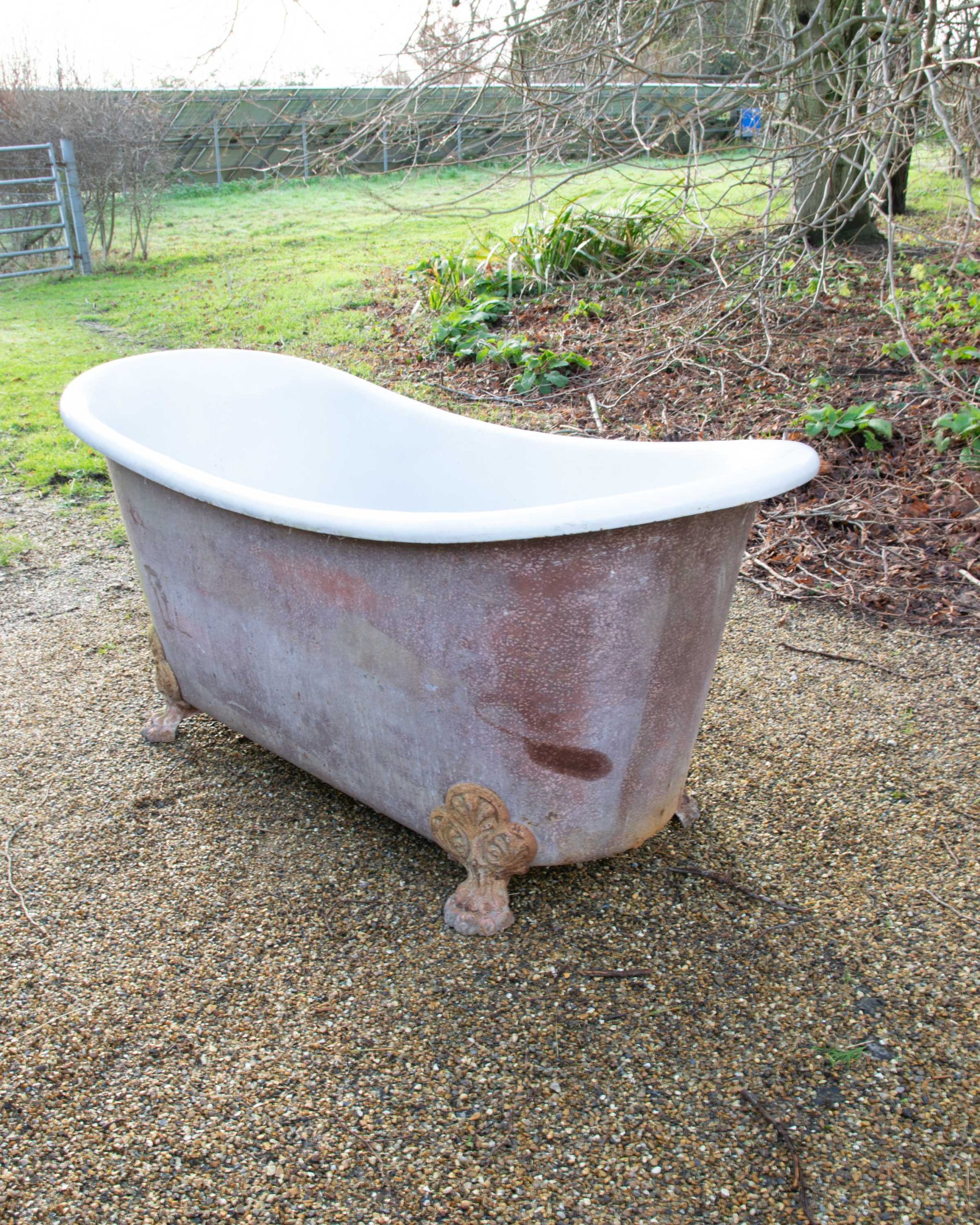 Late 19th century bateau bathtub on feet. In unrestored condition. Price includes resurfacing the interior enamel and shot blasting the exterior.
