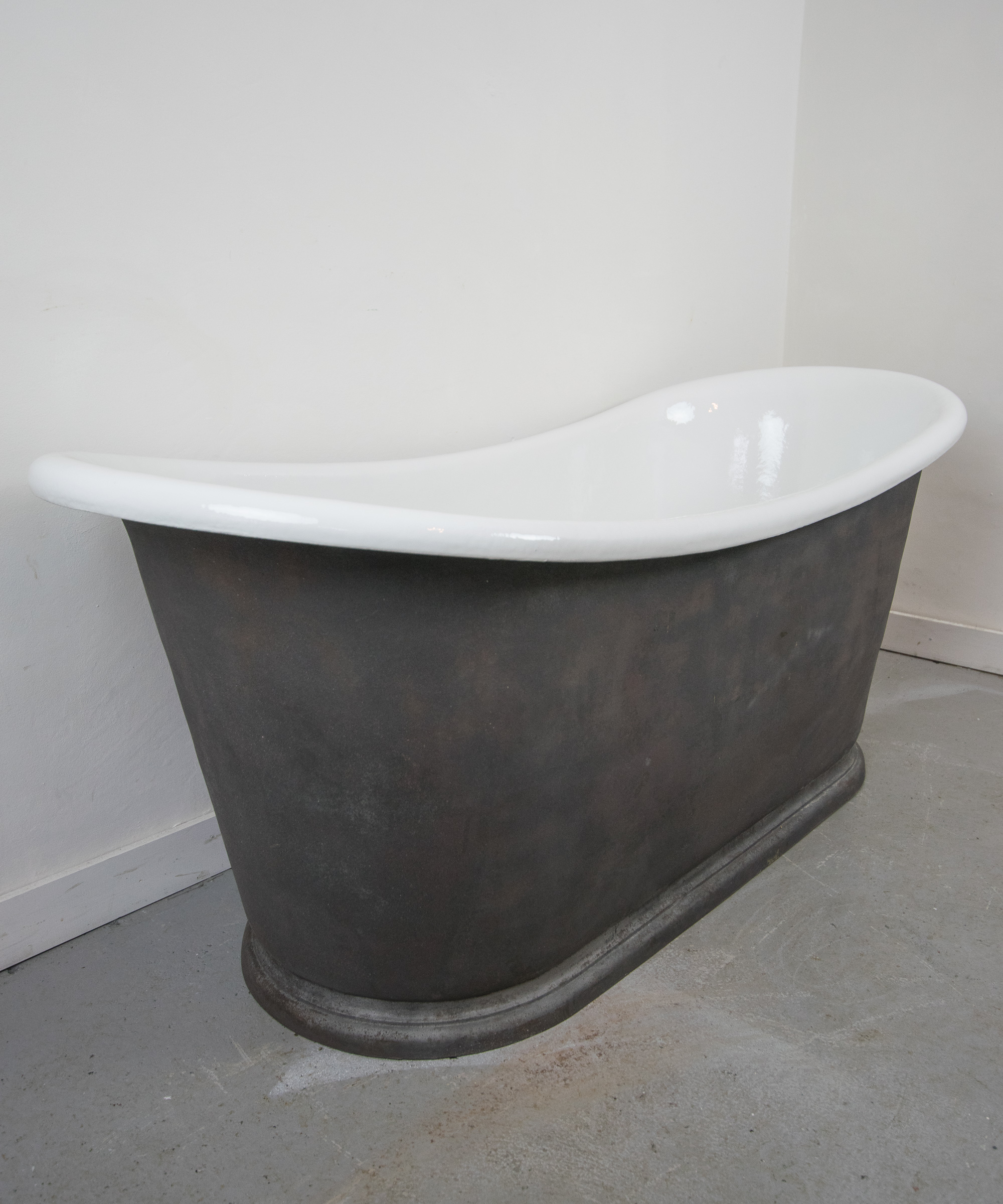 A stunning cast iron rolltop bateau bathtub on a plinth from around 1890. Central waste.