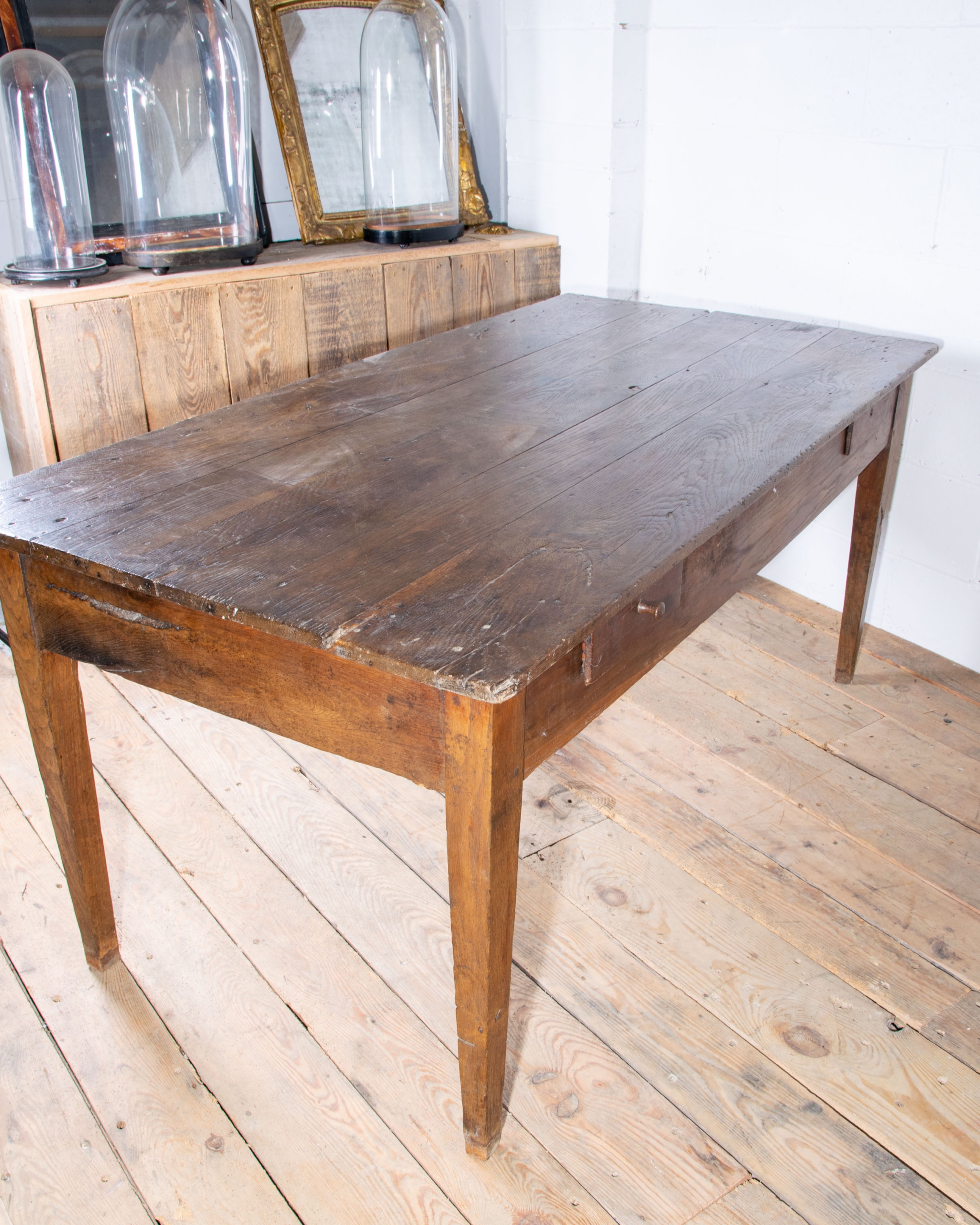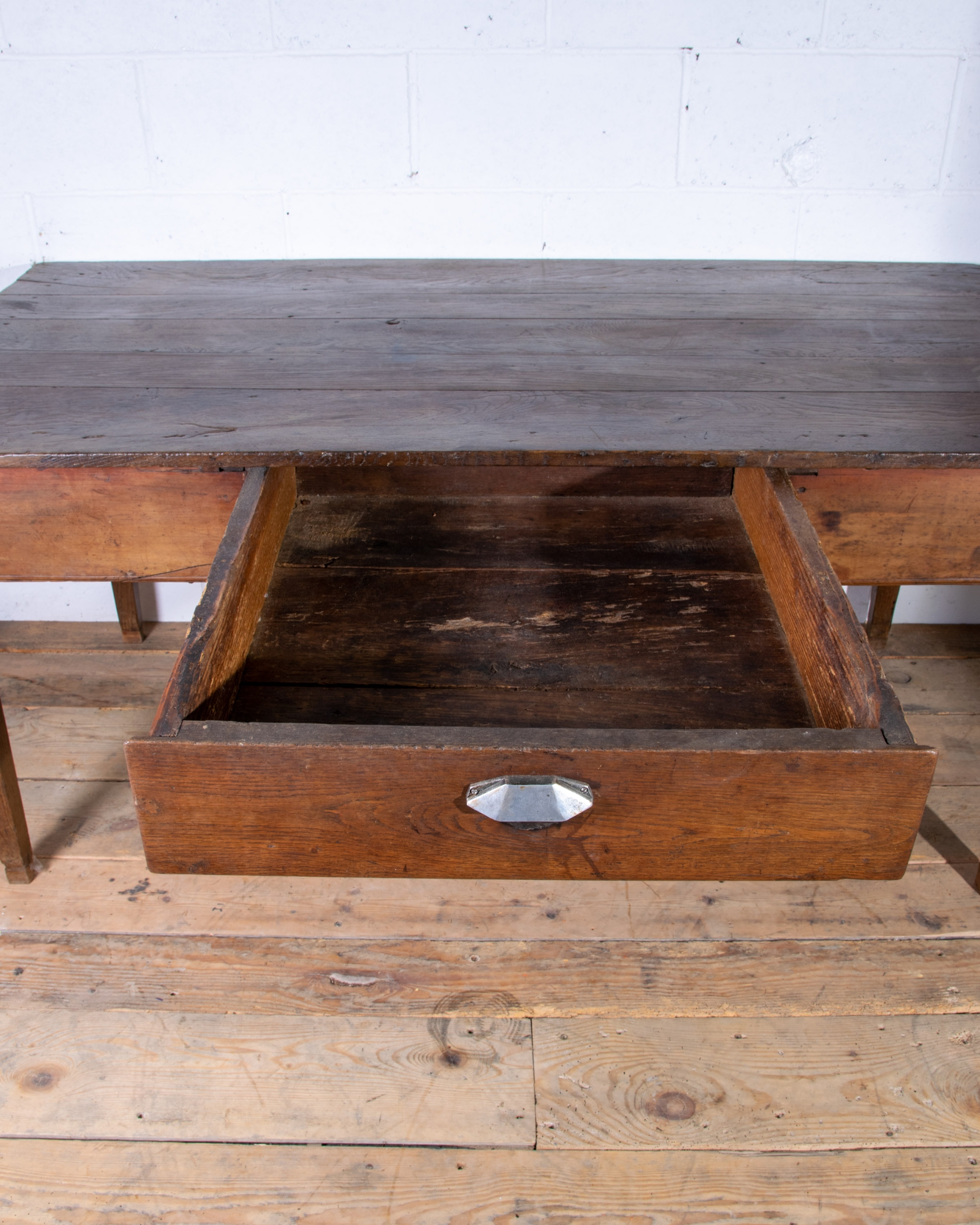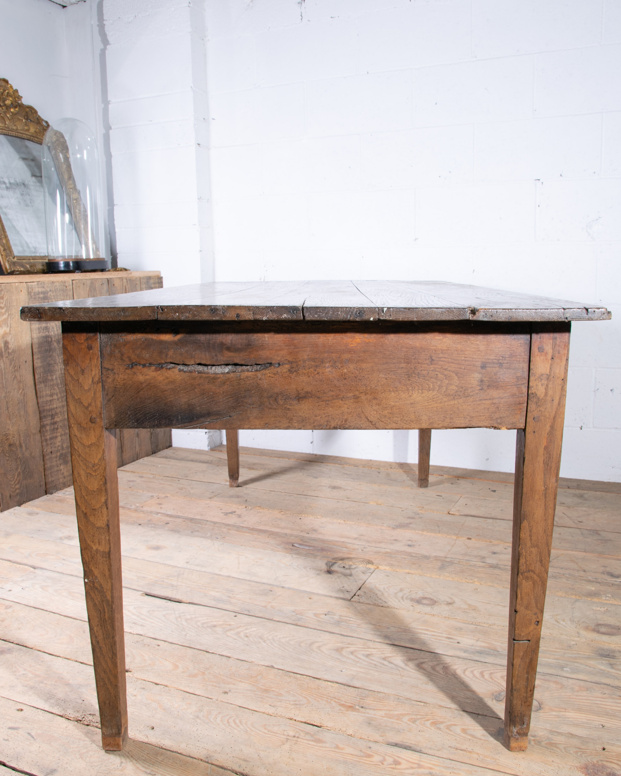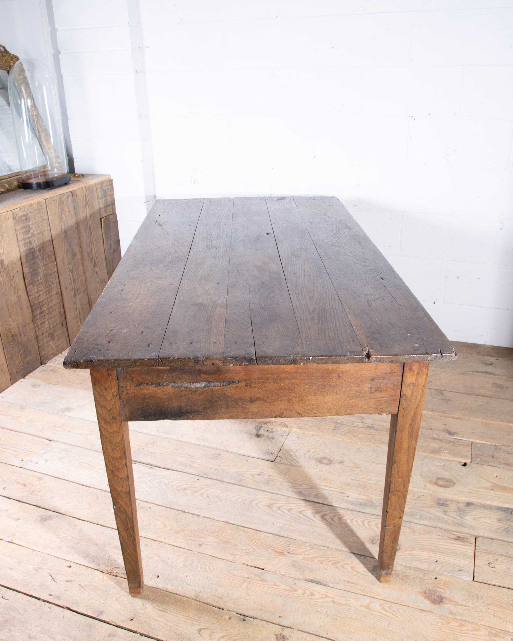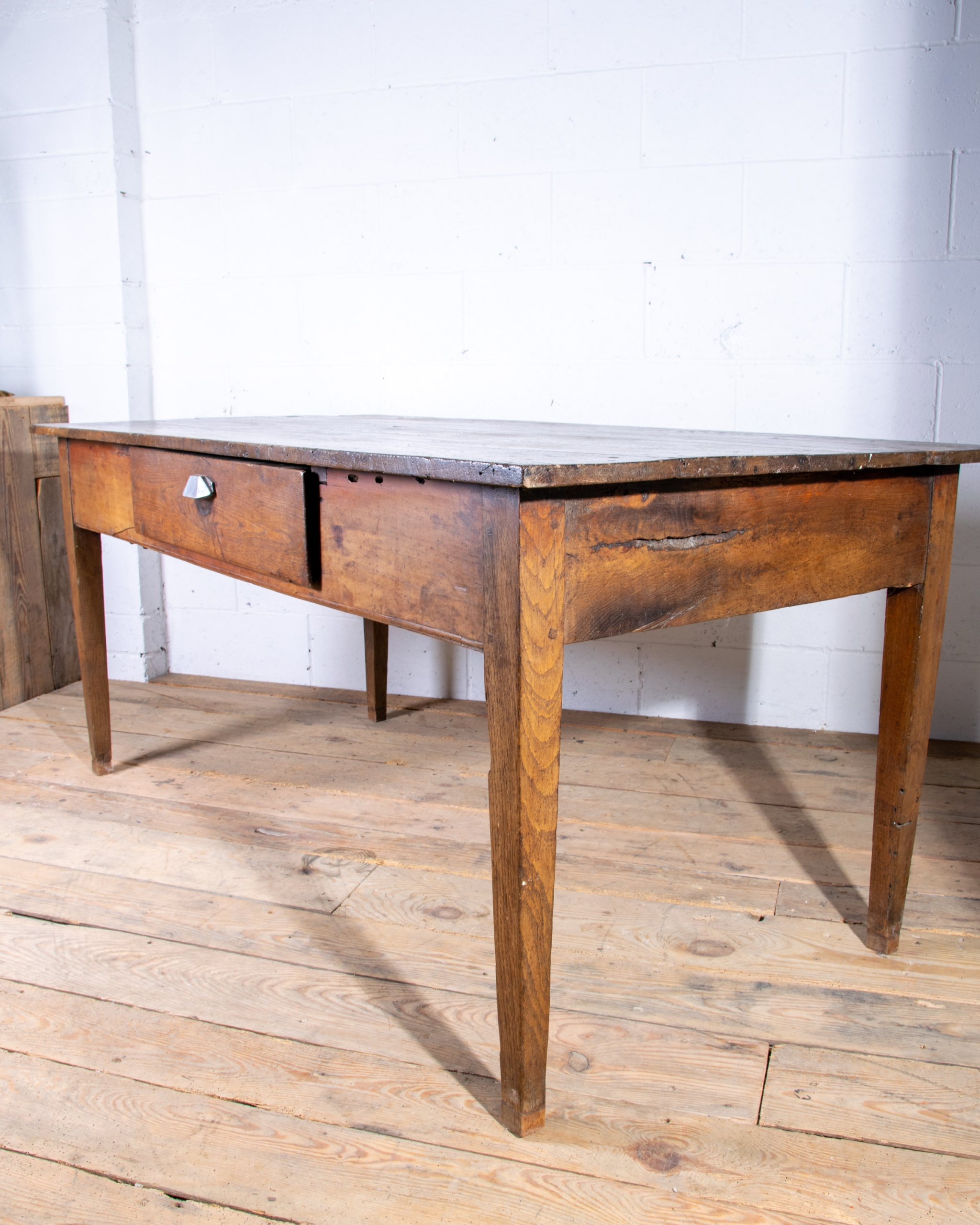 A late 19th century French farmhouse table. Oak base with tapered legs. Oak top. Peg construction. 1 big drawer, 2 small drawers on the other side. Seats upto 6.