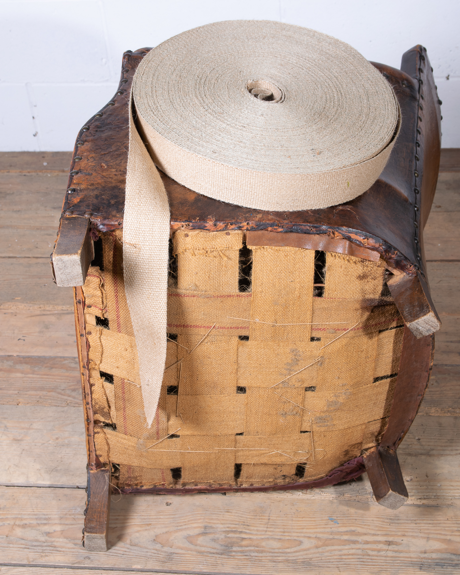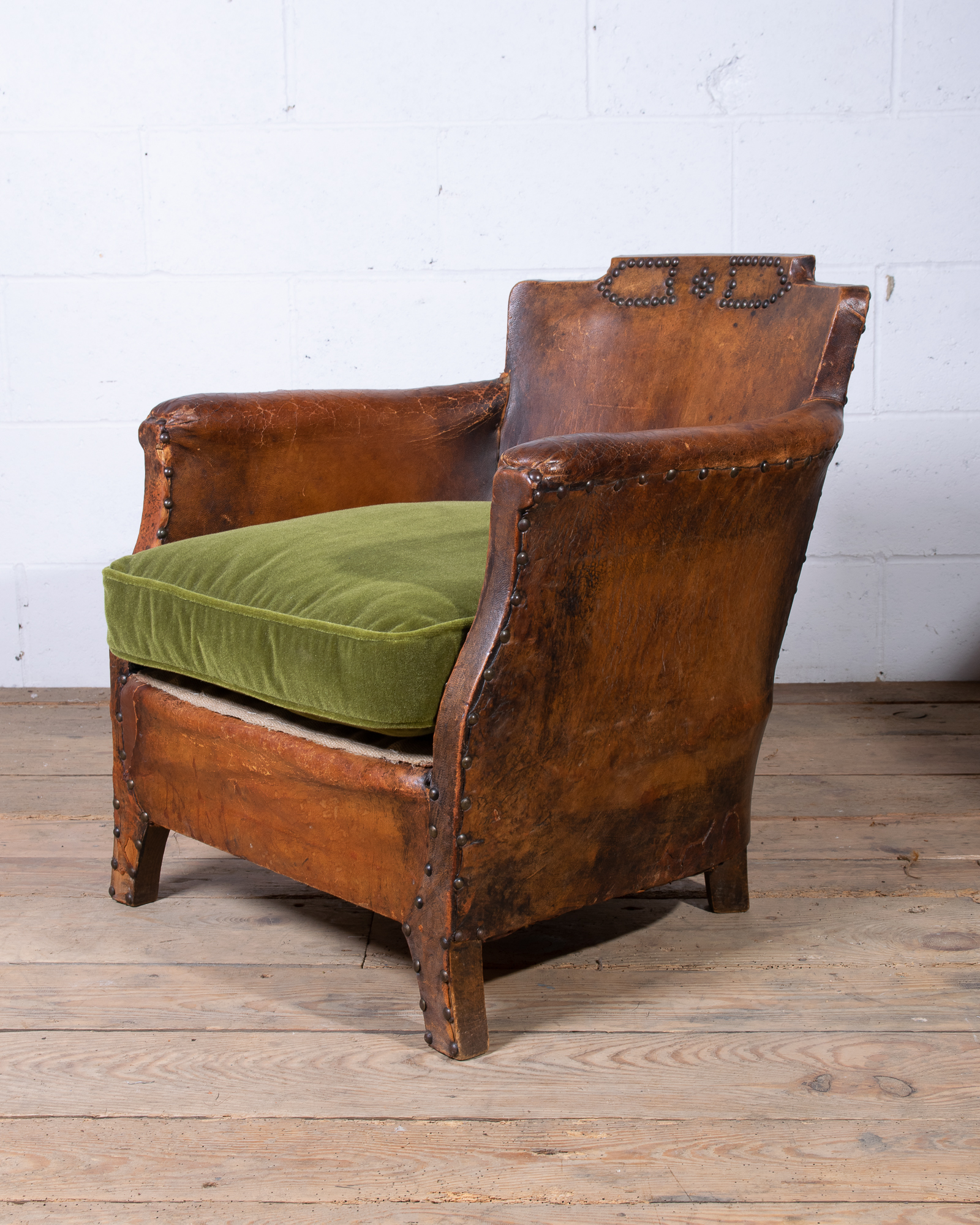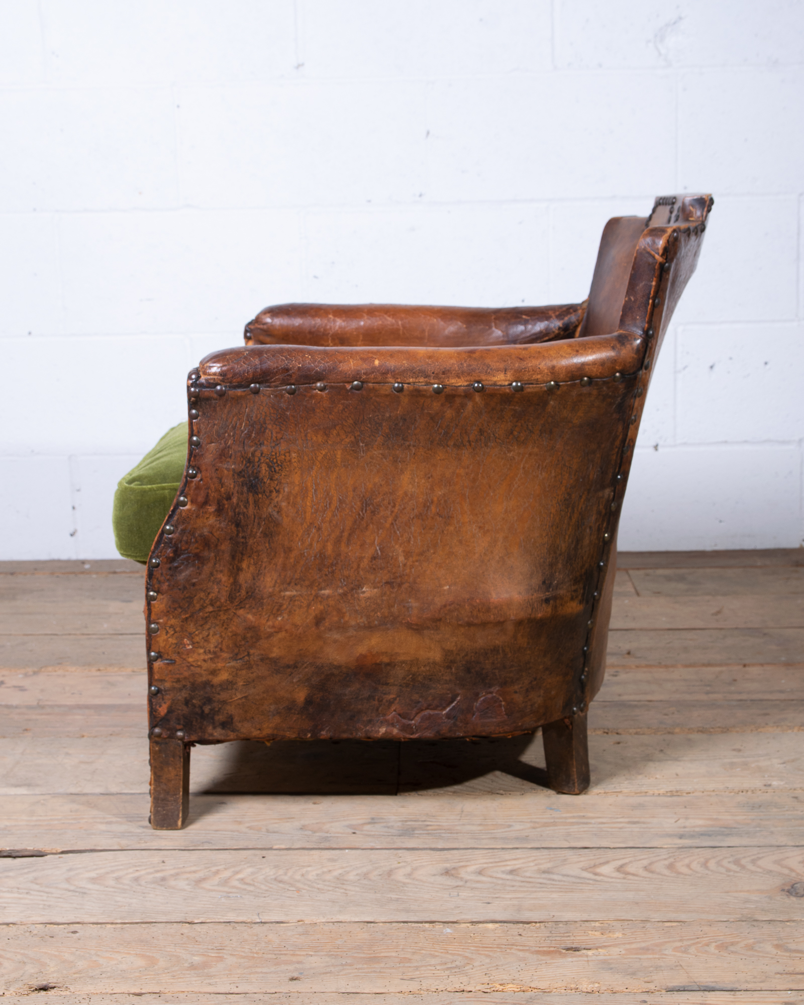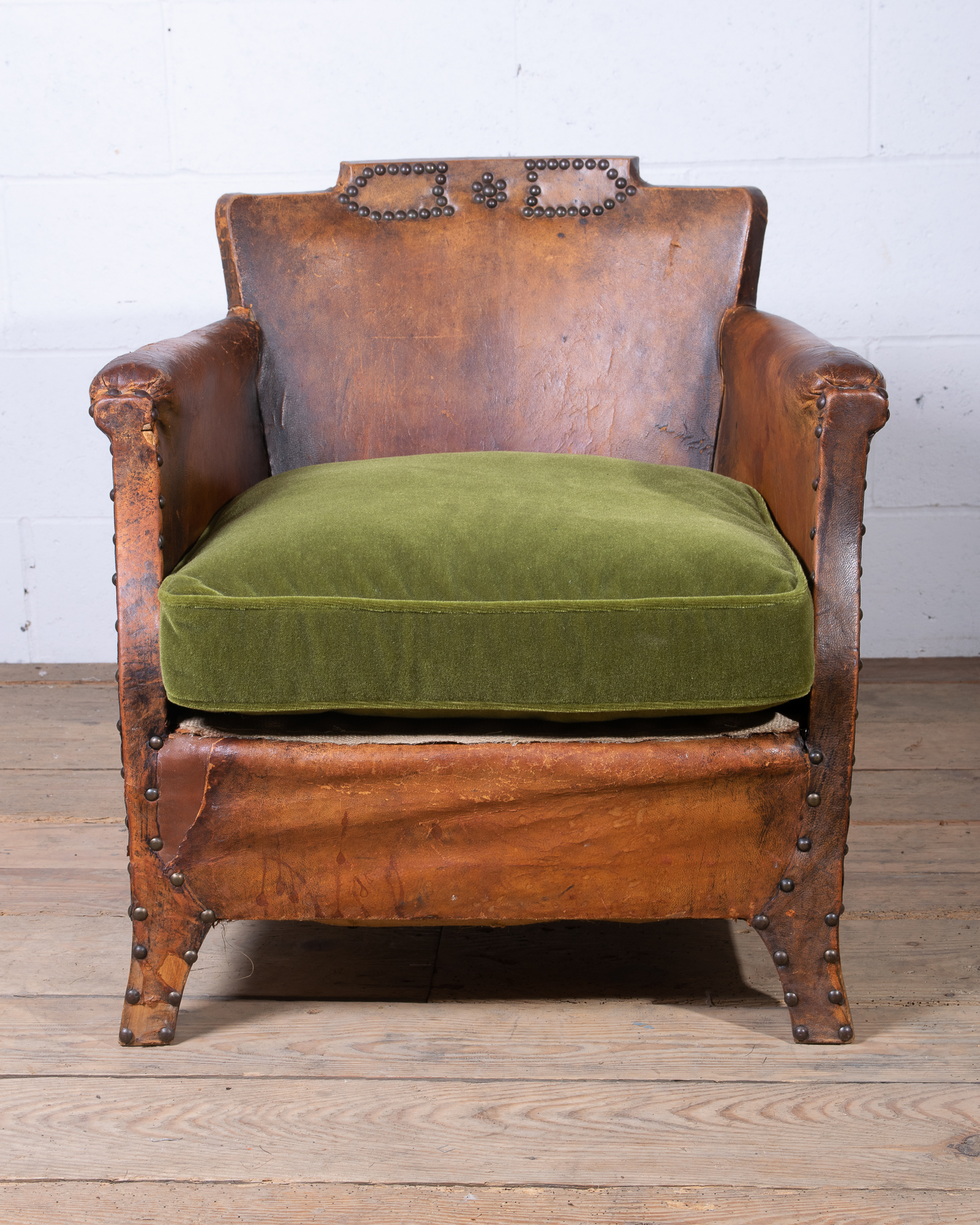 The leather is in pretty good condition but has been repaired by us in places. We’ve made a new feather cushion which has been covered in George Smith mohair velvet fabric (Fern). The webbing will be replaced with high quality French webbing and bottoming cloth prior to delivery.