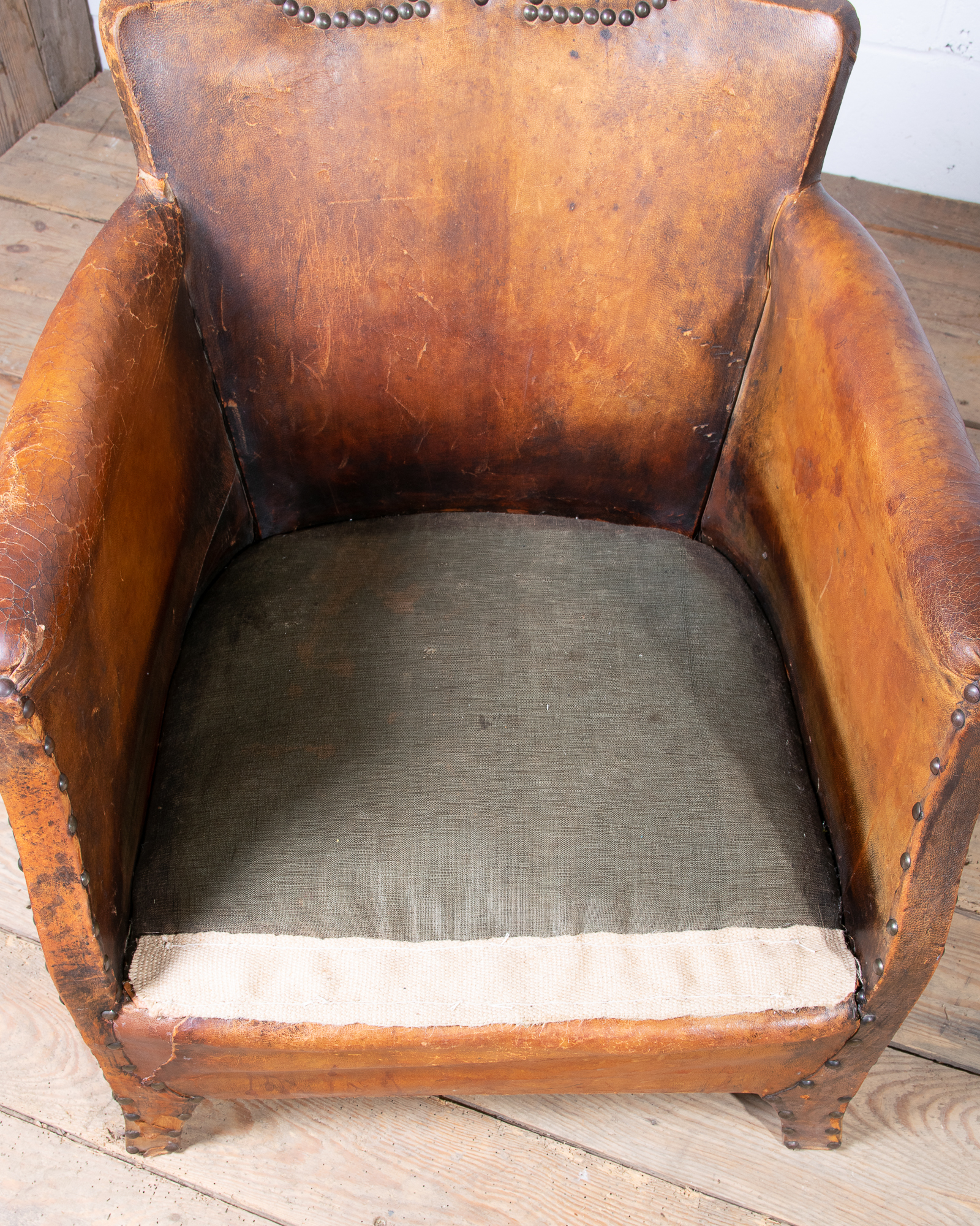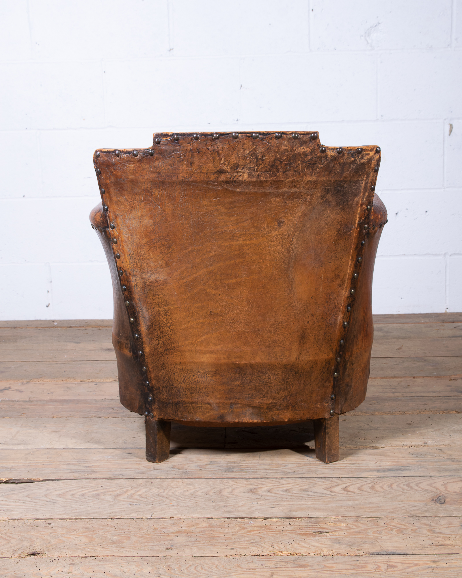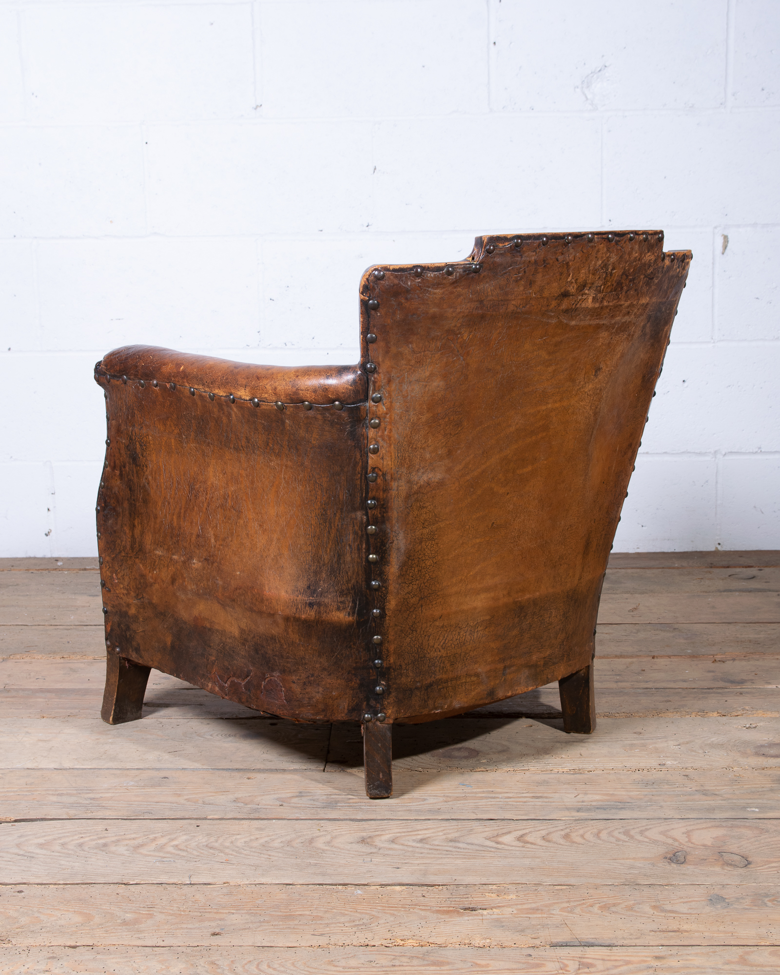 A low slung cigar coloured leather studded armchair manufactured around 1930.