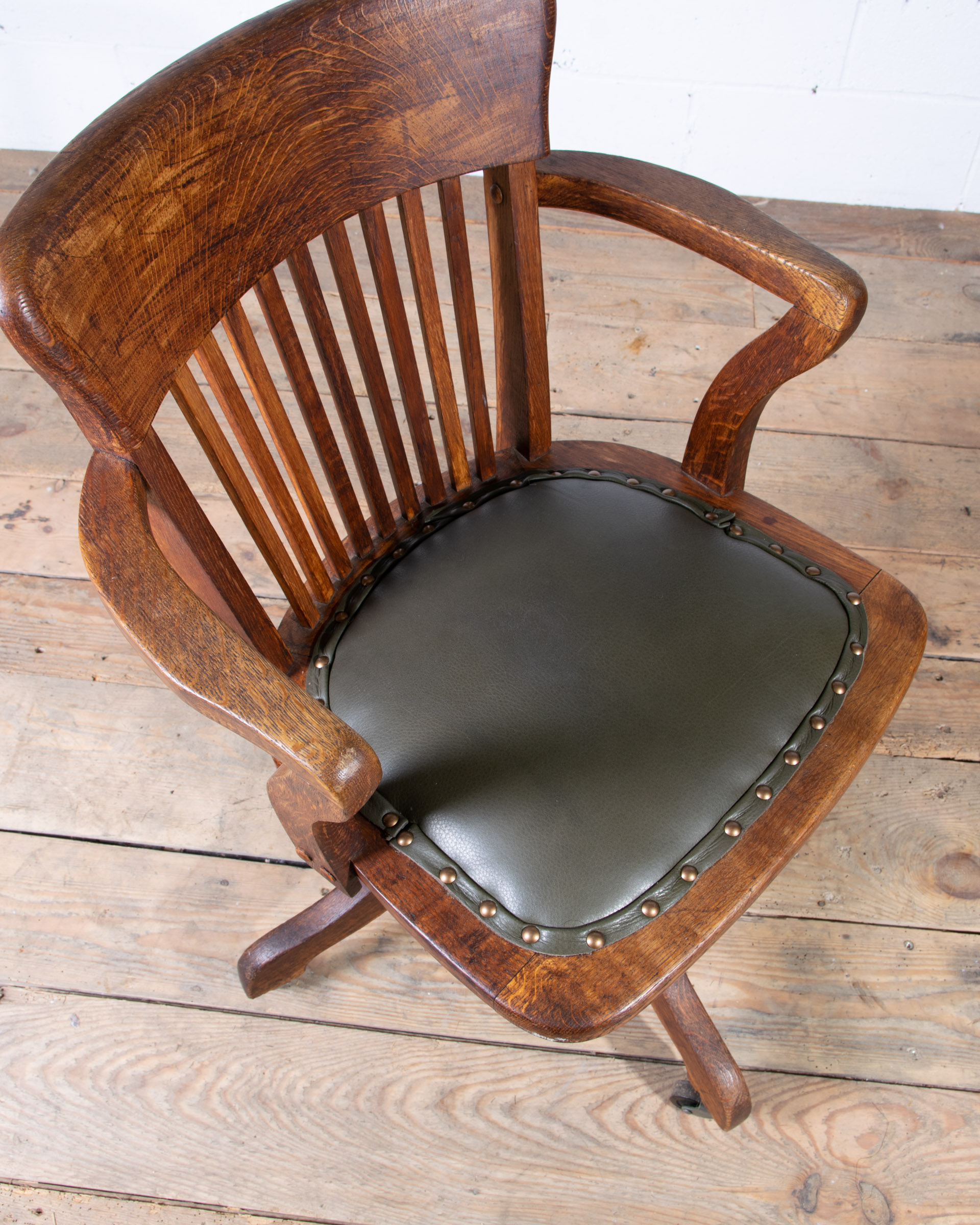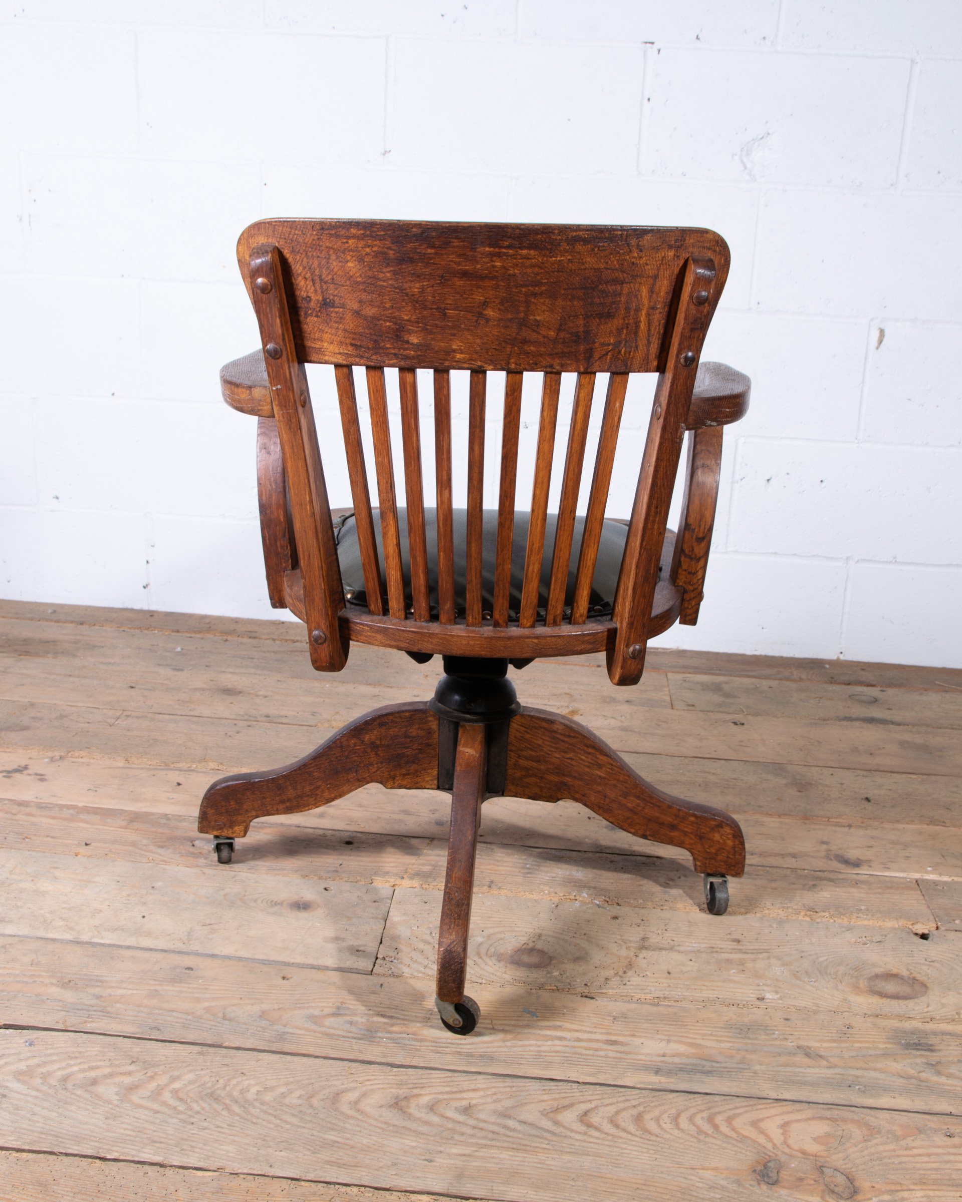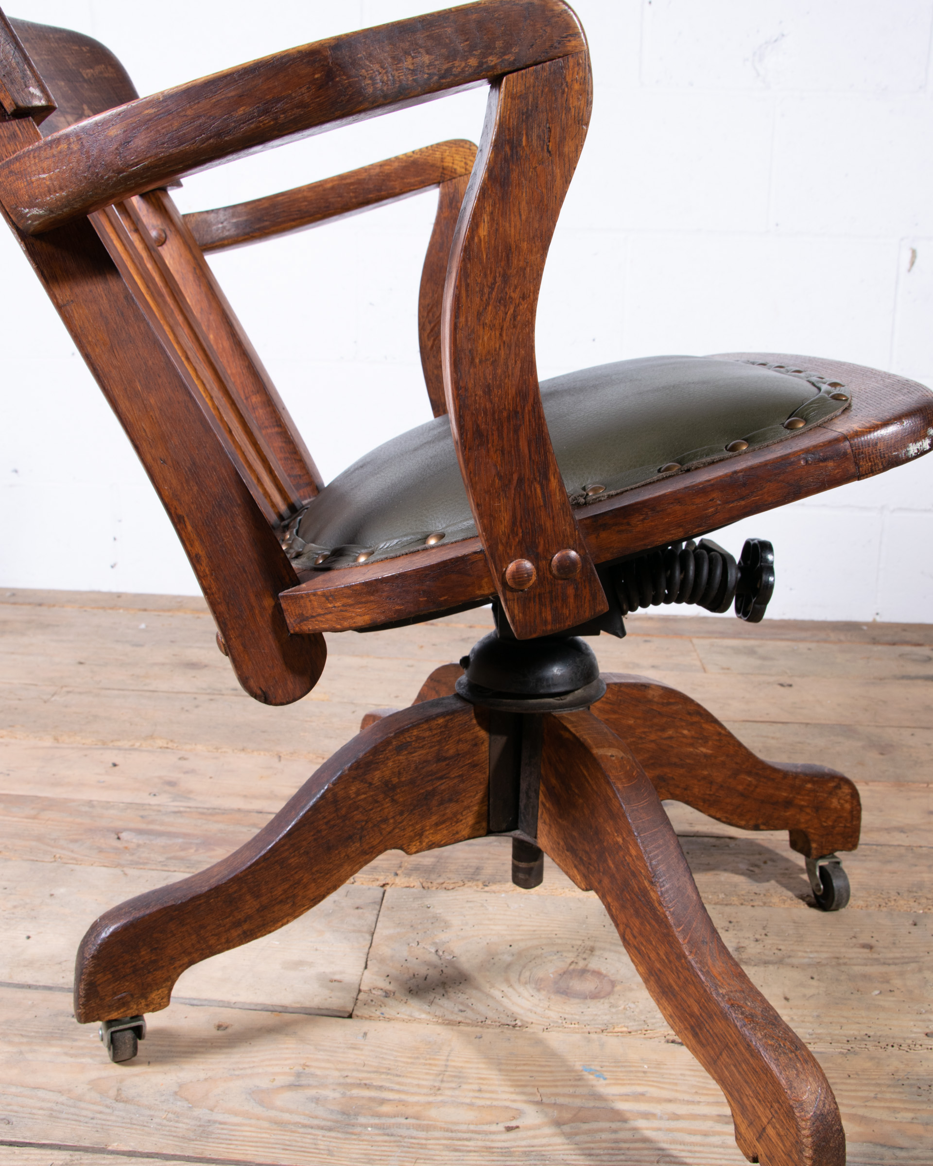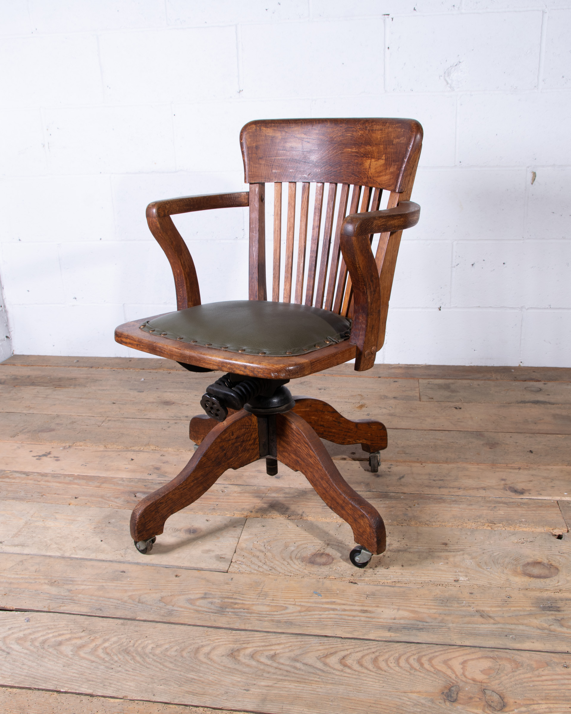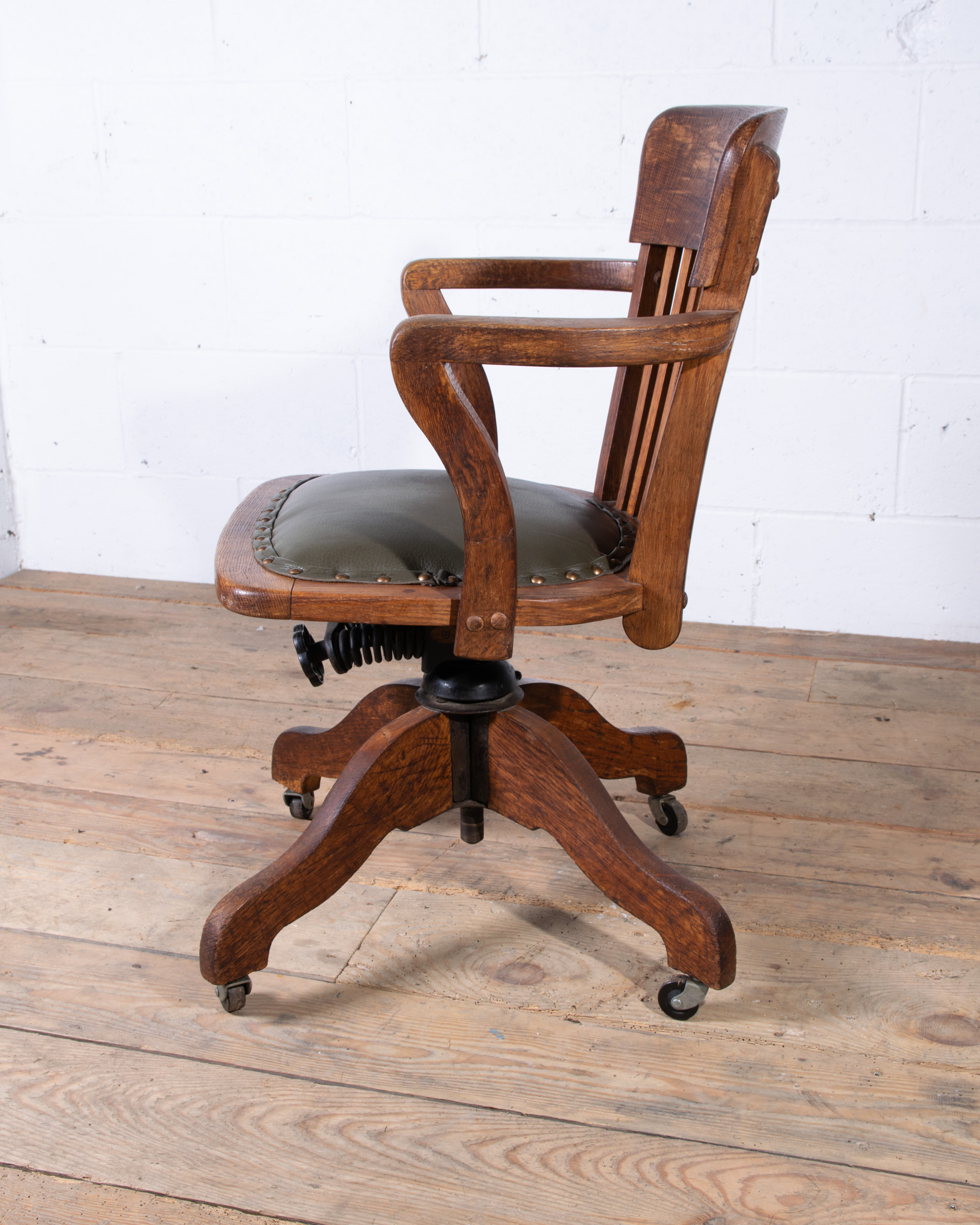 An early 20th century English captain’s desk office chair. Solid oak frame. Tilt / swivel / height adjustment mechanism all in good working order. The chair has been newly reupholstered in British racing green Italian leather with horsehair seat pad. Dimensions H75 W57 D57 cms Seat height adjustment 43-55 cms |