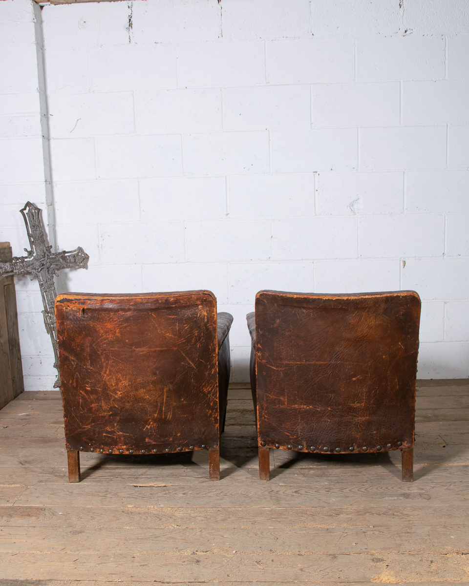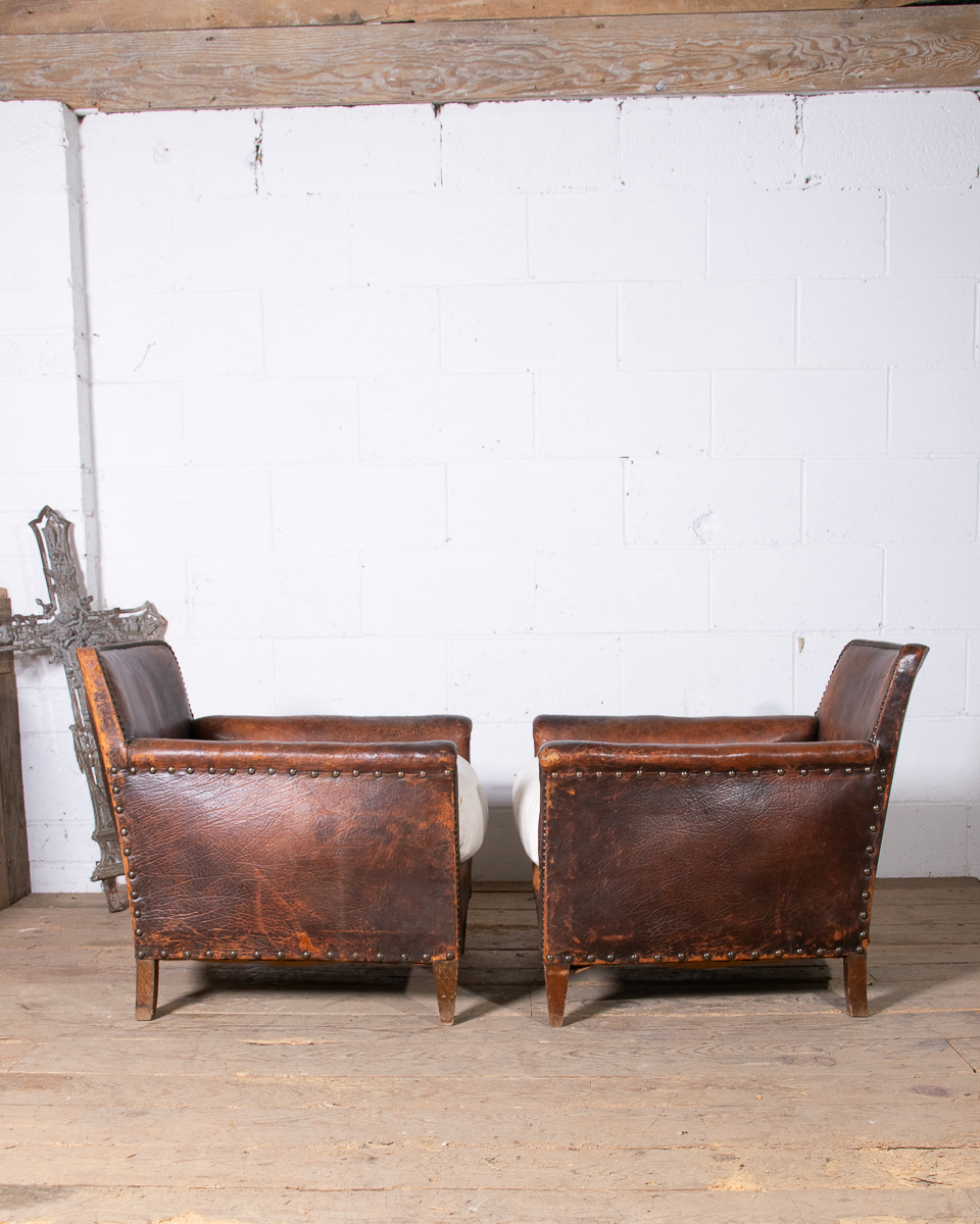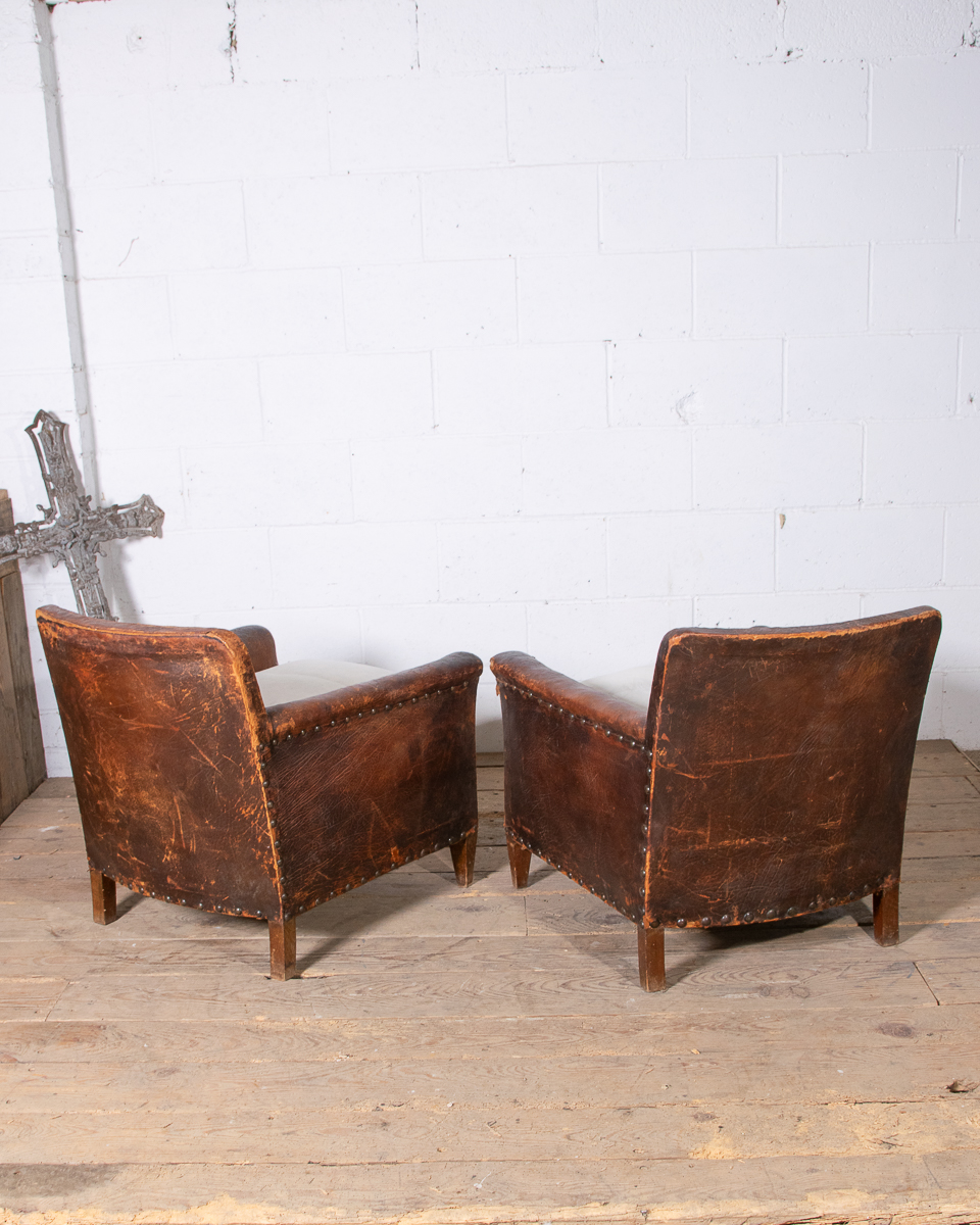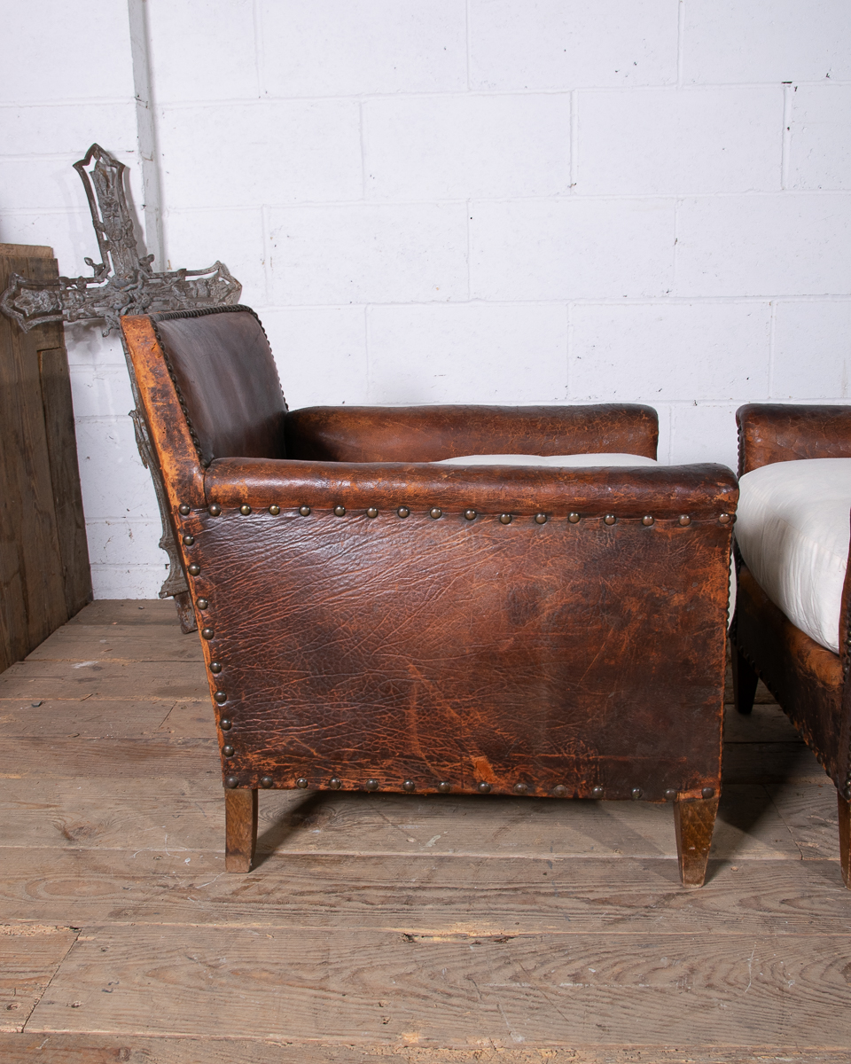 A pair of 1930’s French leather club armchairs. Cigar coloured bull’s leather with studded detailing.