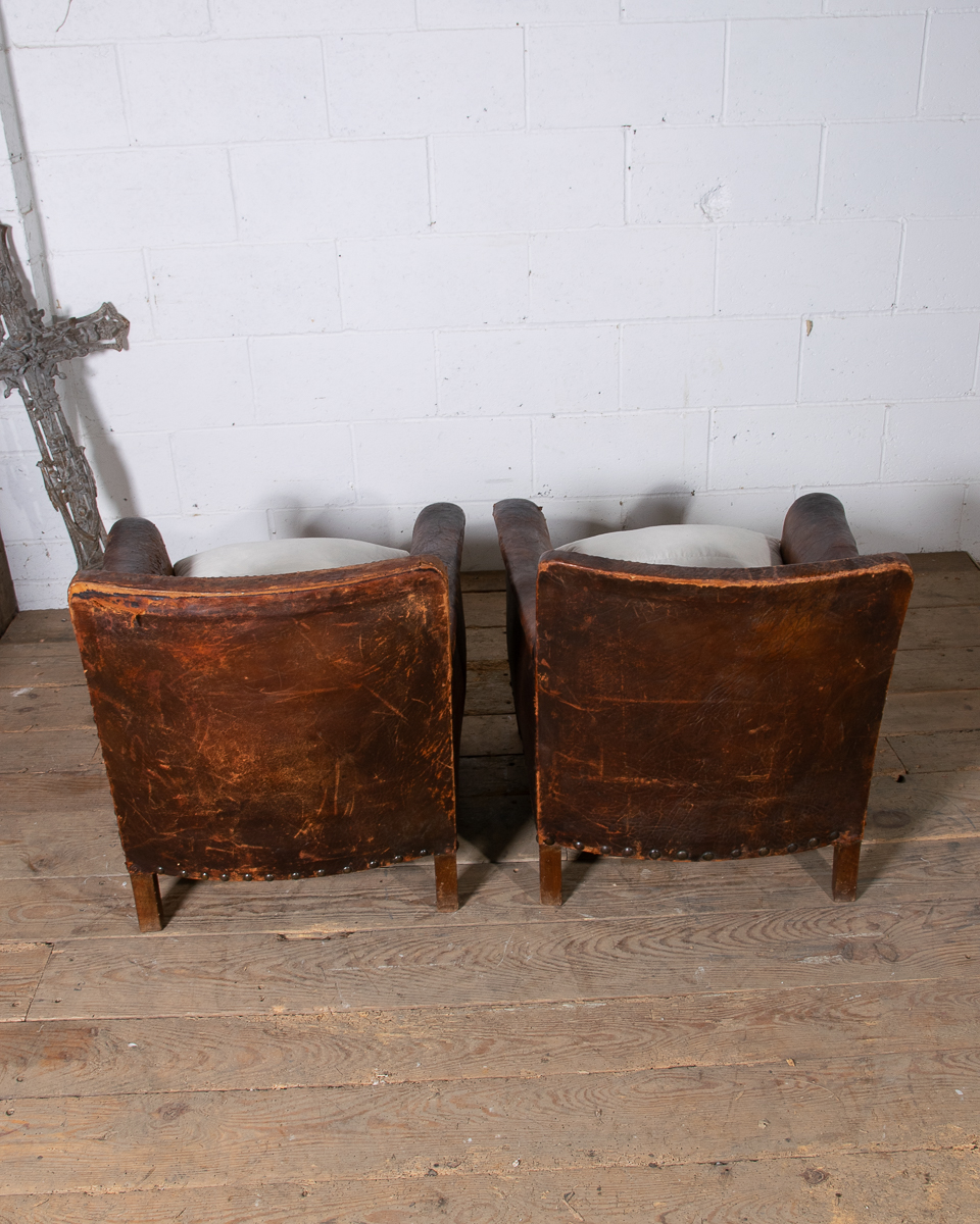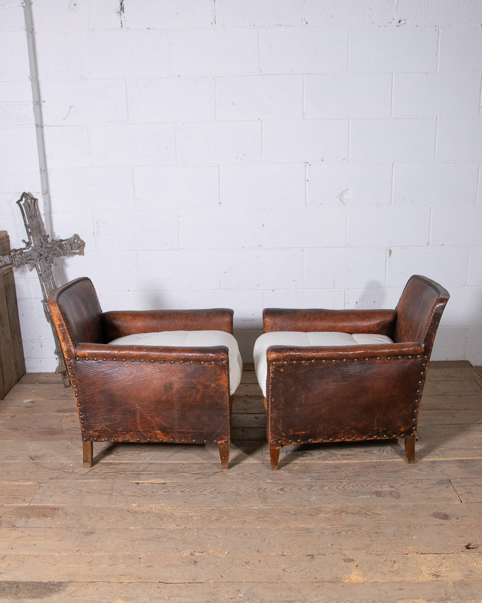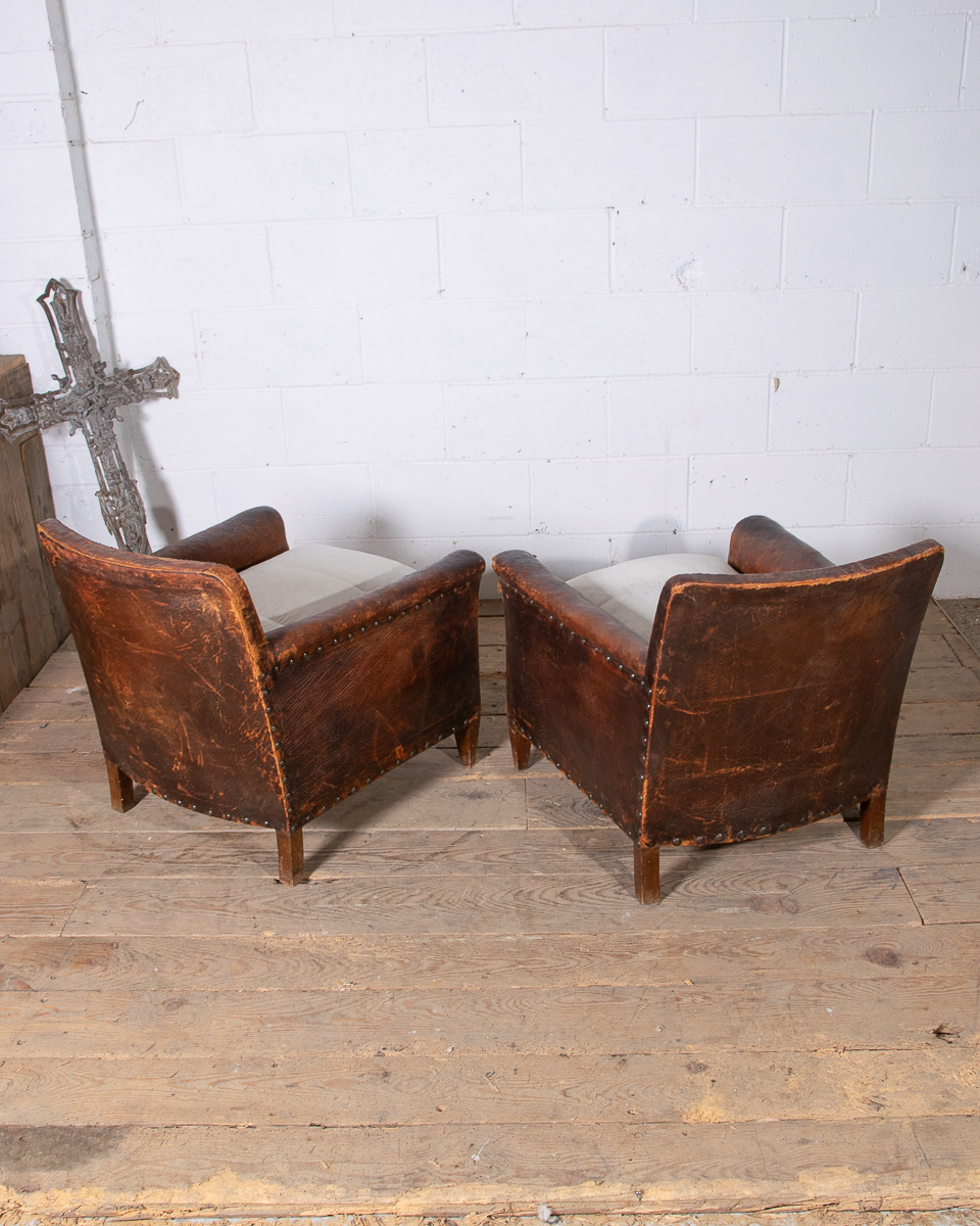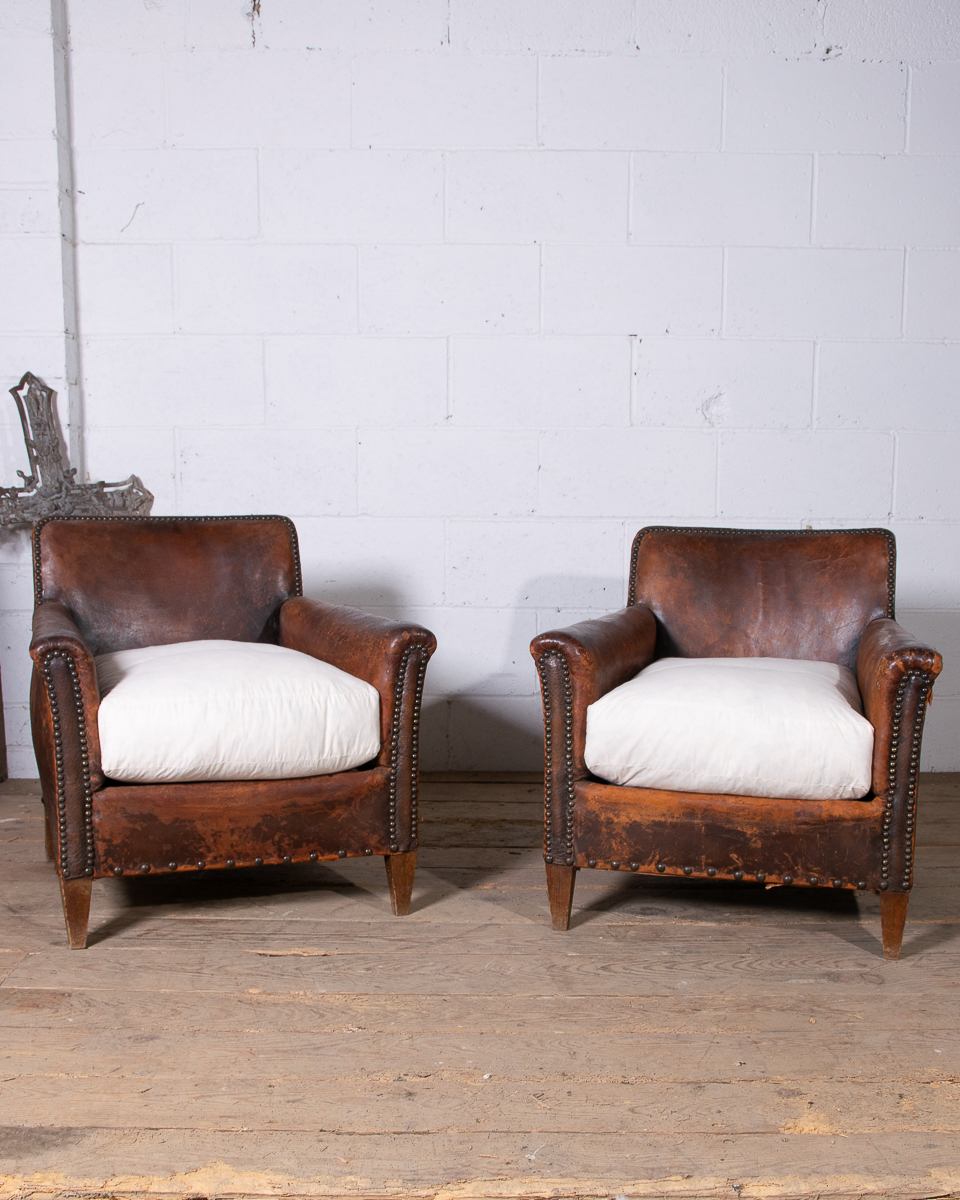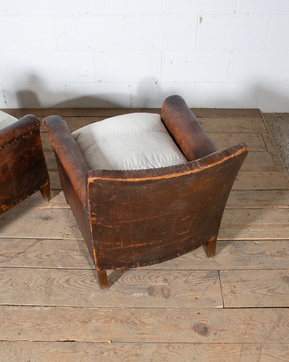 A pair of 1930’s French leather club armchairs. Cigar coloured bull’s leather with studded detailing.