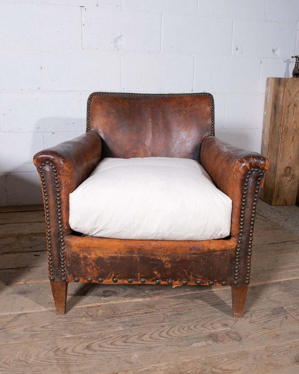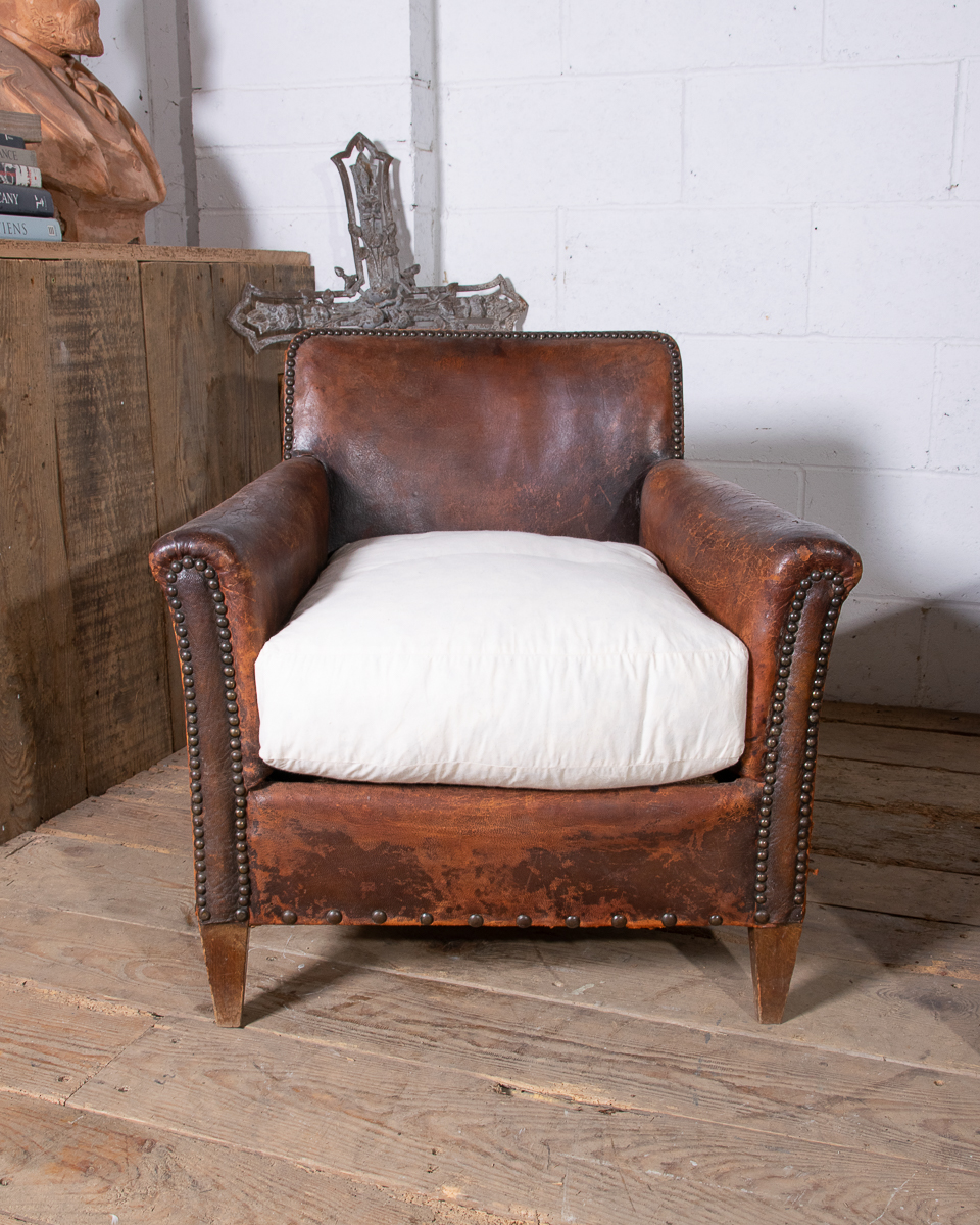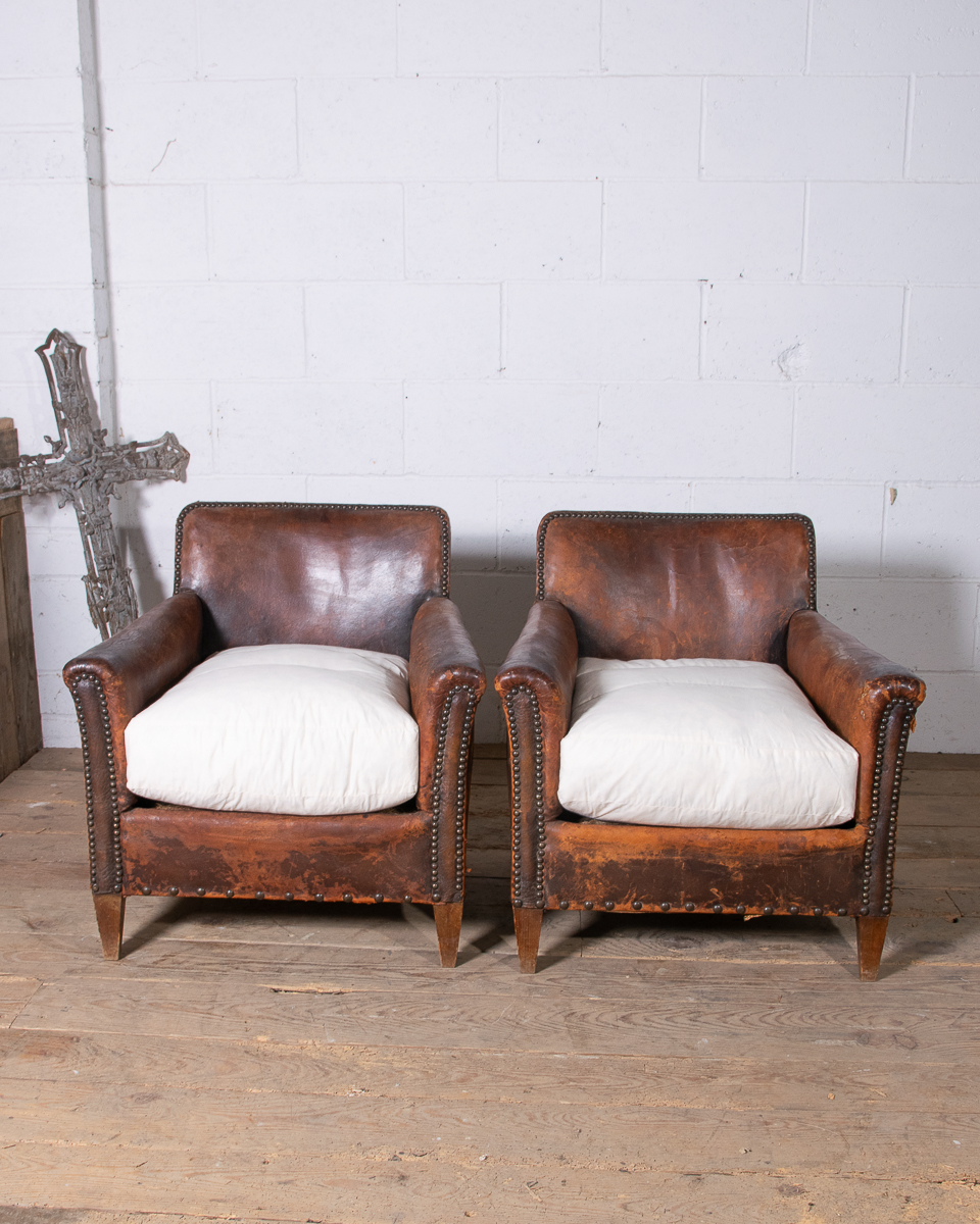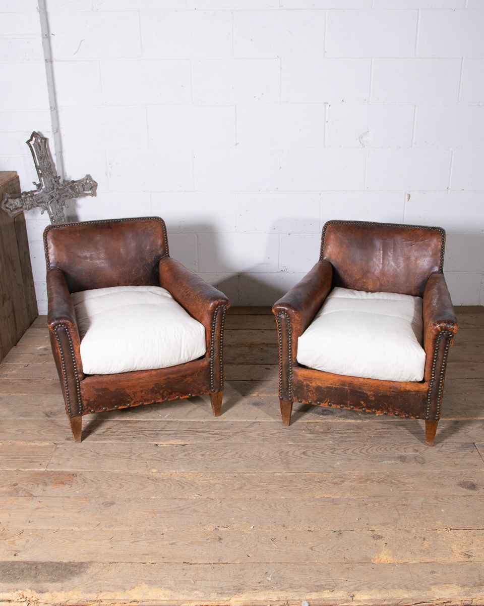 A pair of 1930’s French leather club armchairs. Cigar coloured bull’s leather with studded detailing.