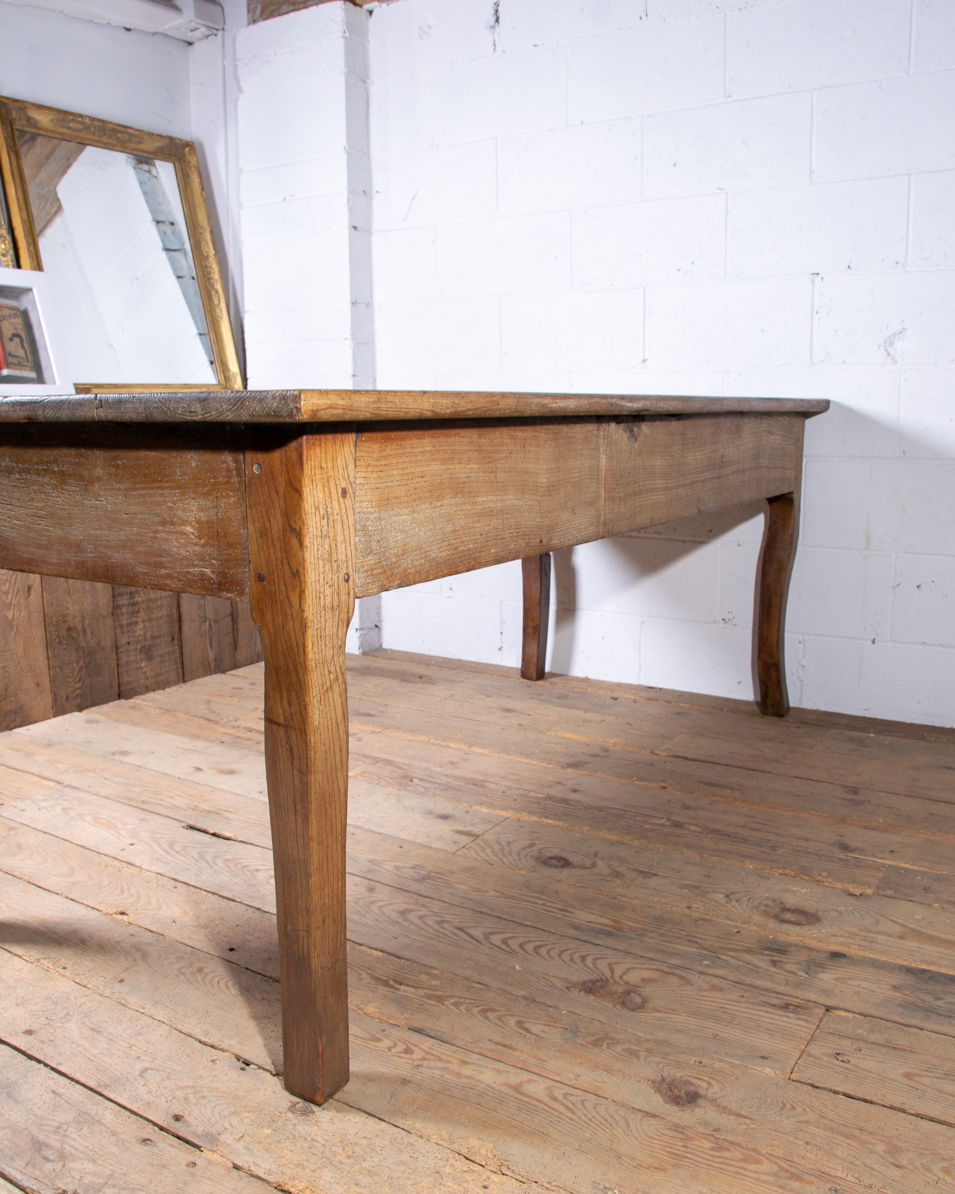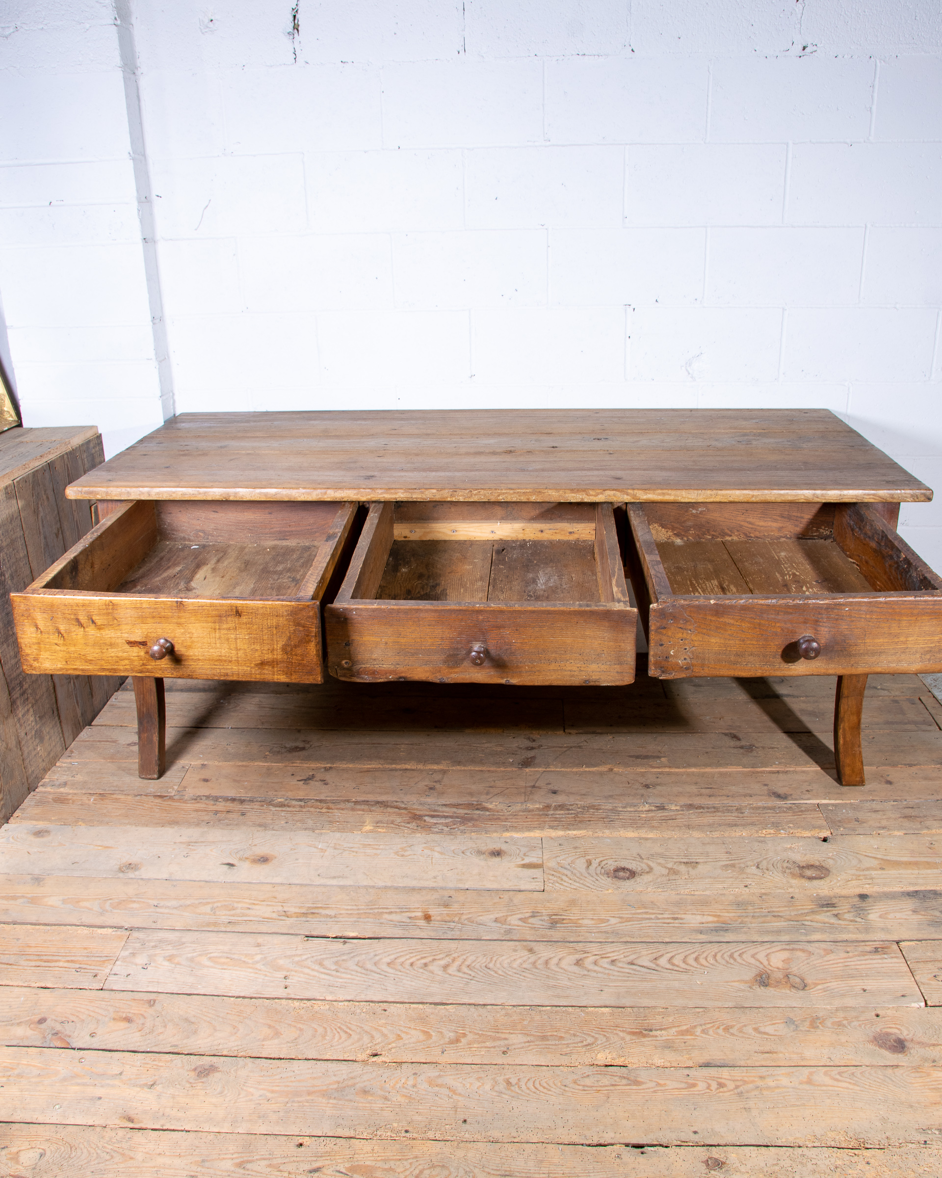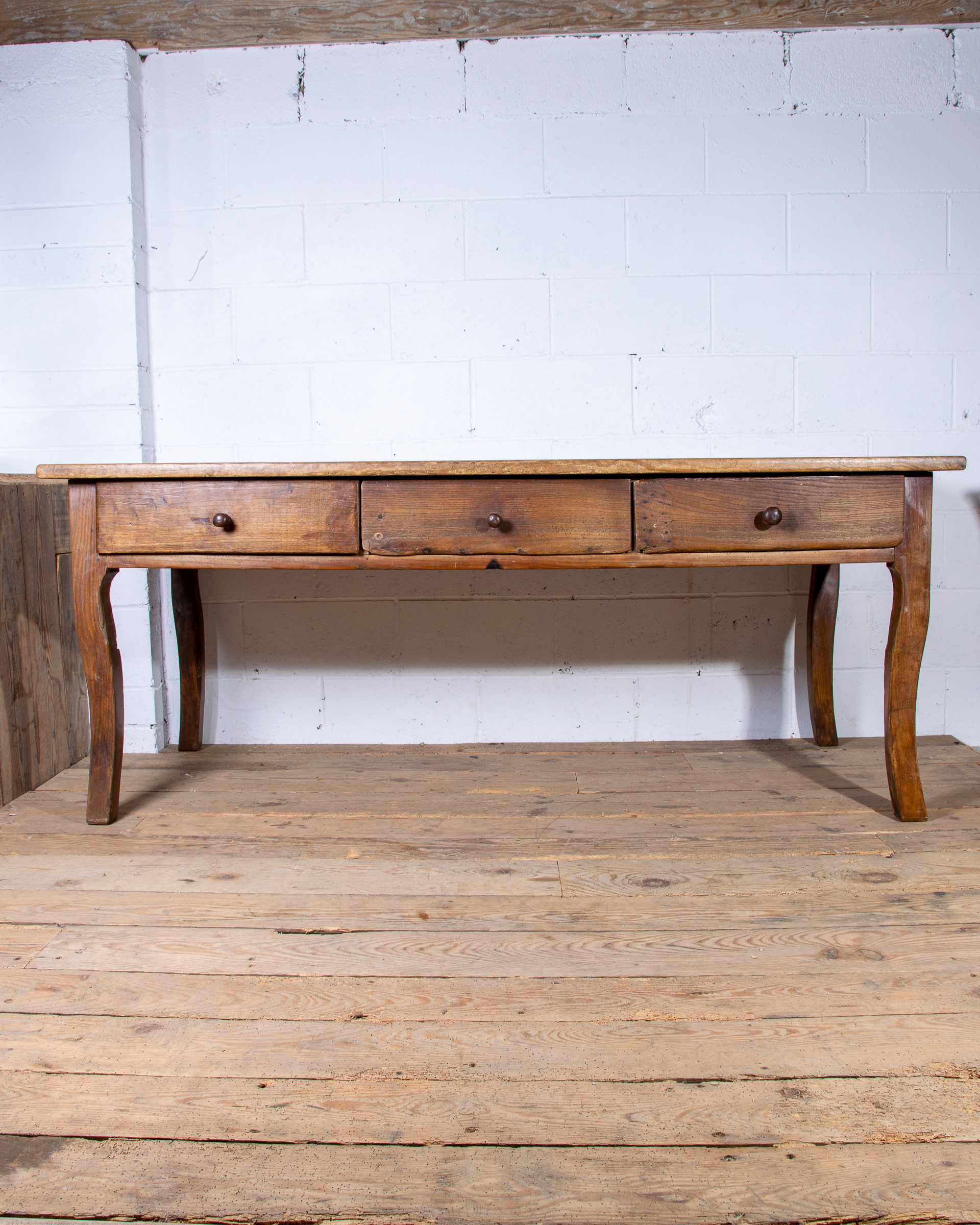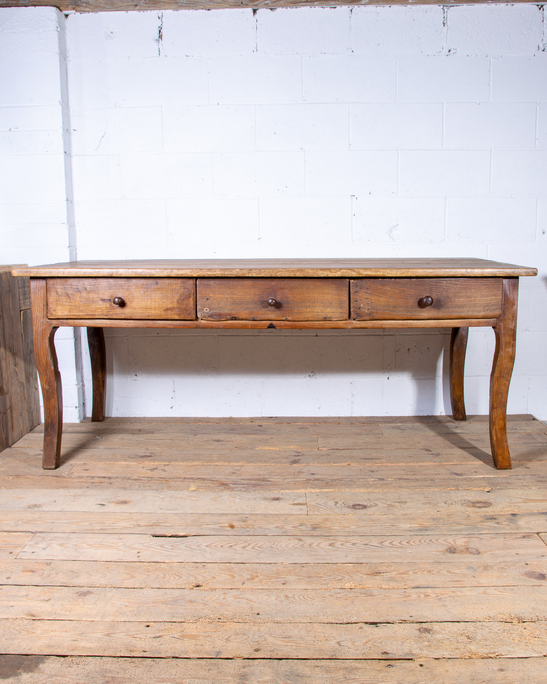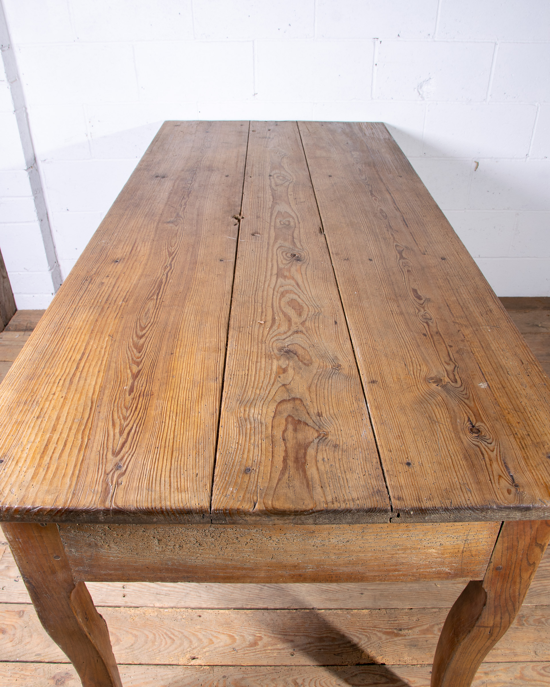 A very solid (and heavy) rustic late 19th century oak kitchen table. Probably originally used as a prepay table in a large country house. From the Frome region of France. 3 large drawers at the front, plain at the back. 3 plank thick pine top. Carved cabriol legs.