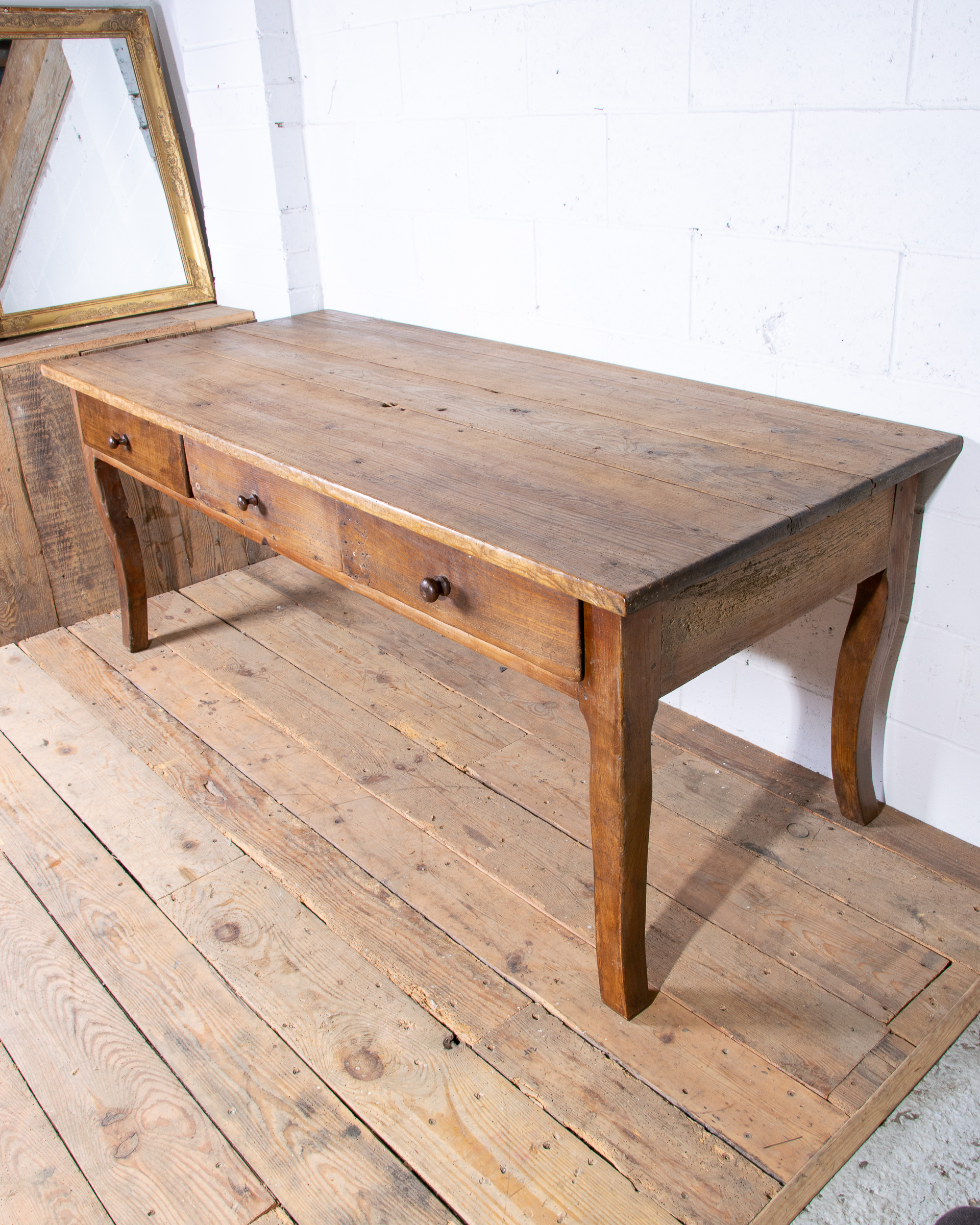 Overall in good condition. Very solid and stable. The table has recently undergone refurbishment including extending the legs and repairing the from of one of the drawers. There are still signs of inactive worm and some early repairs to the from of the drawers.