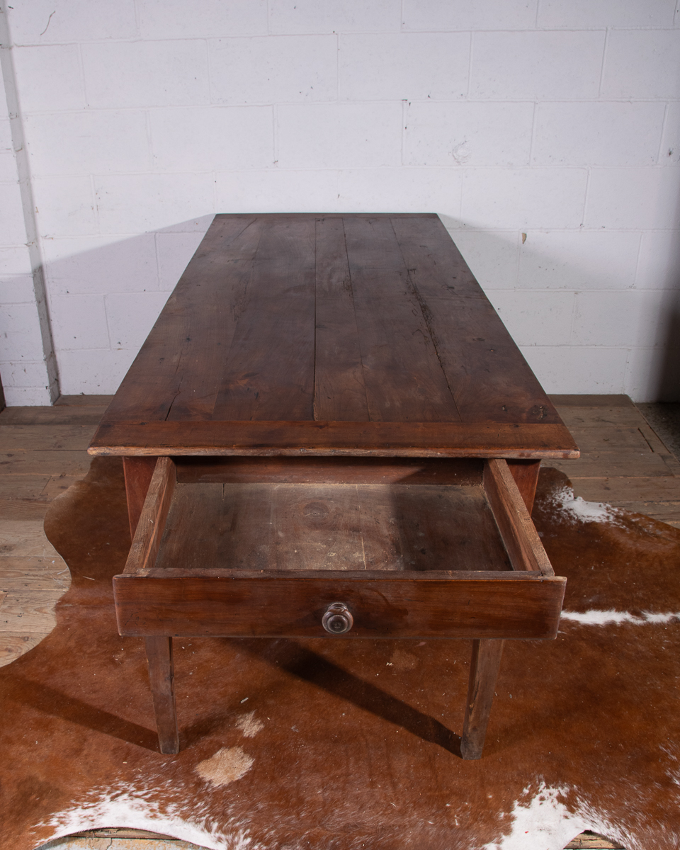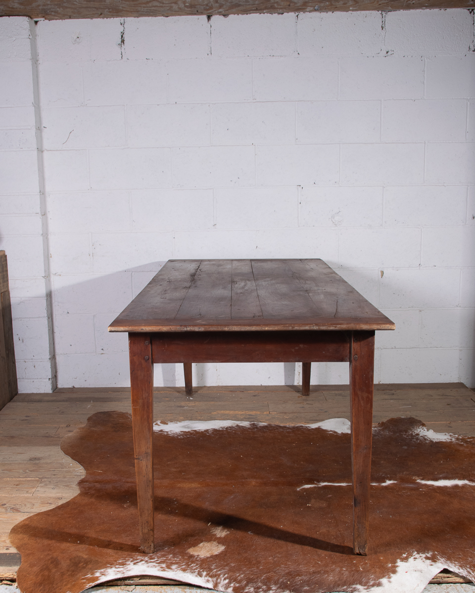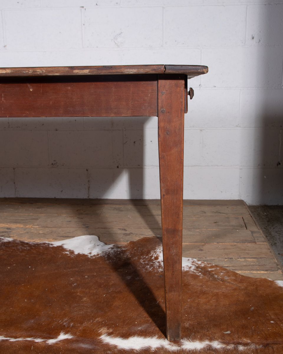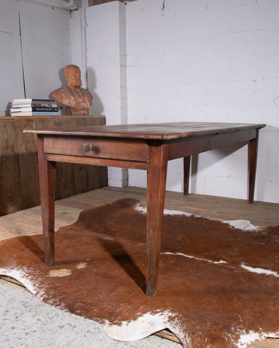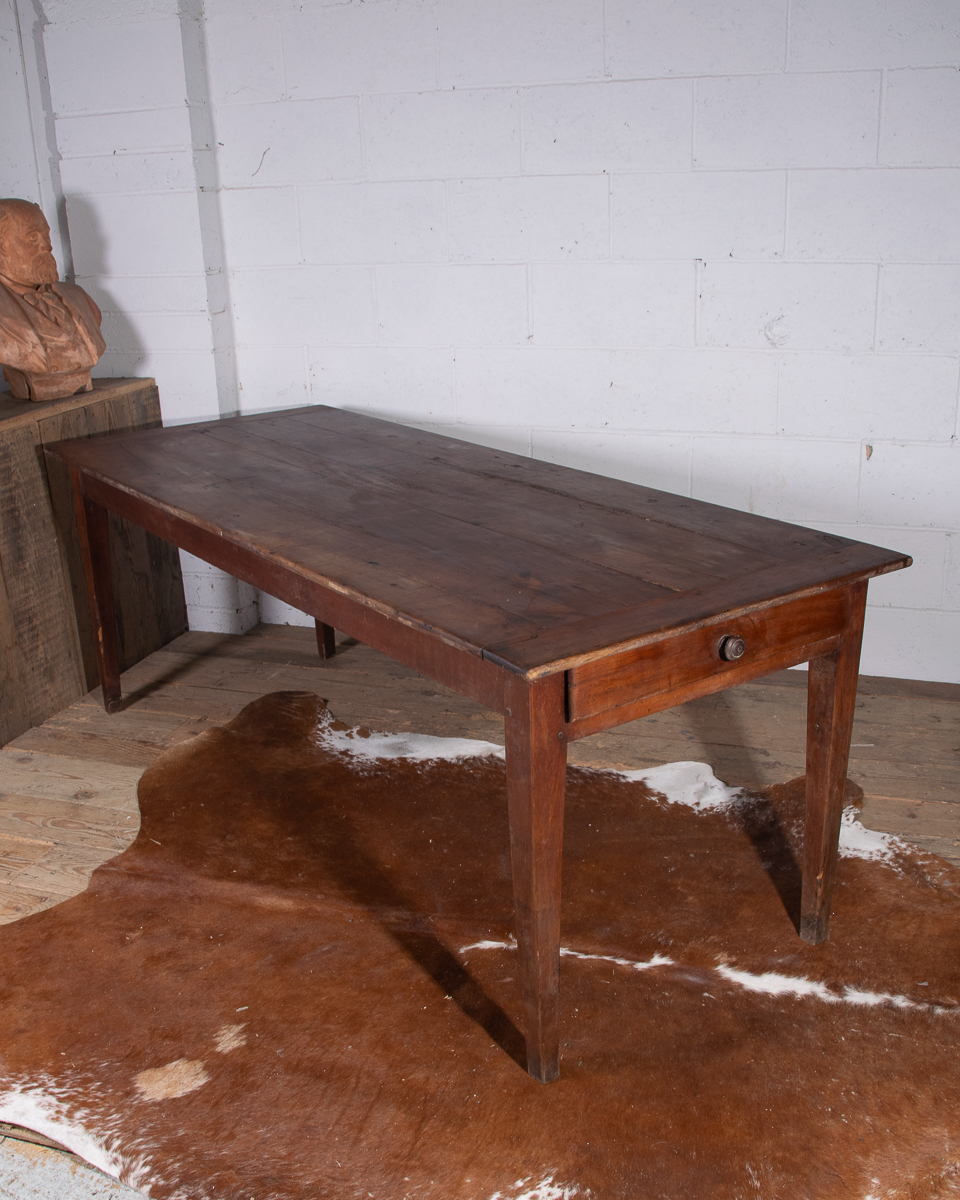 A 19th century French farmhouse dining table with pine scrub top, tapered legs and end drawer.