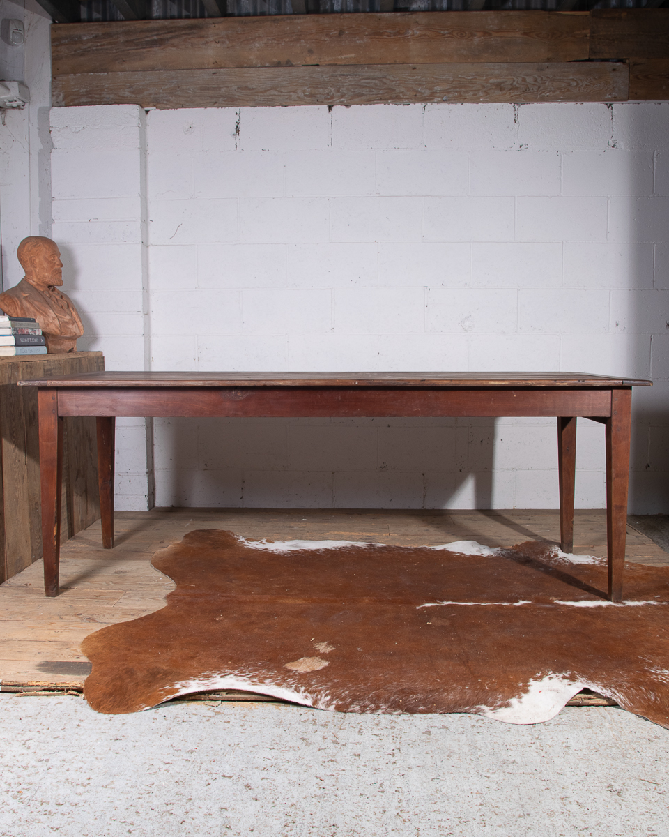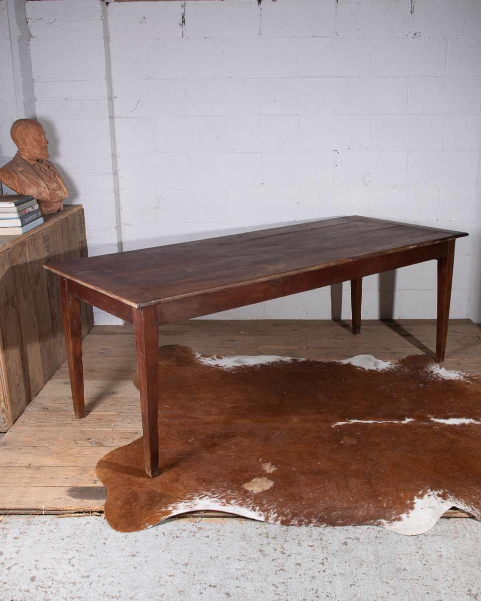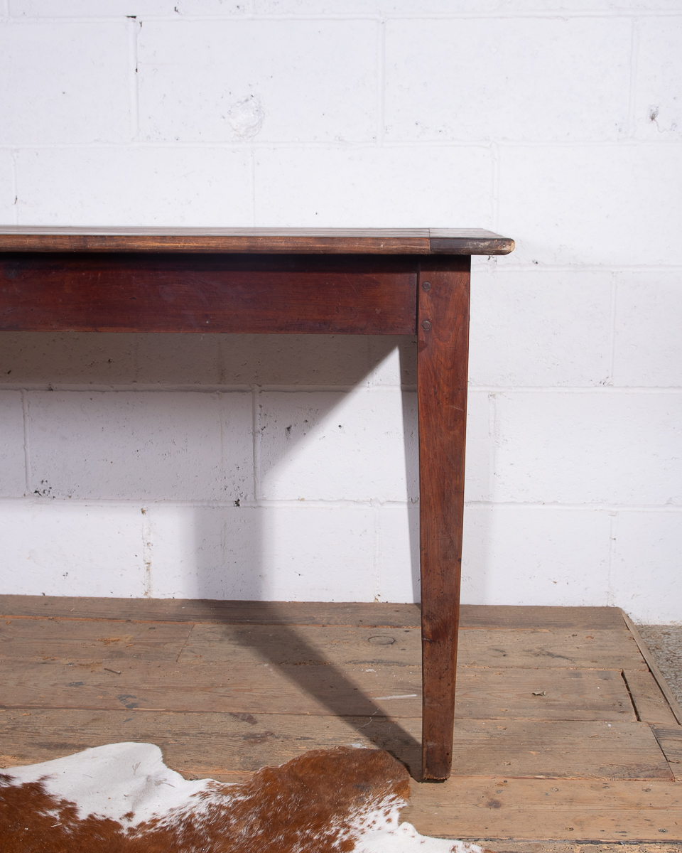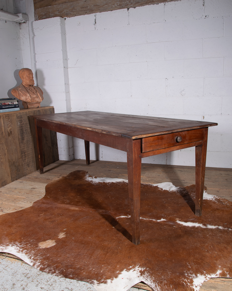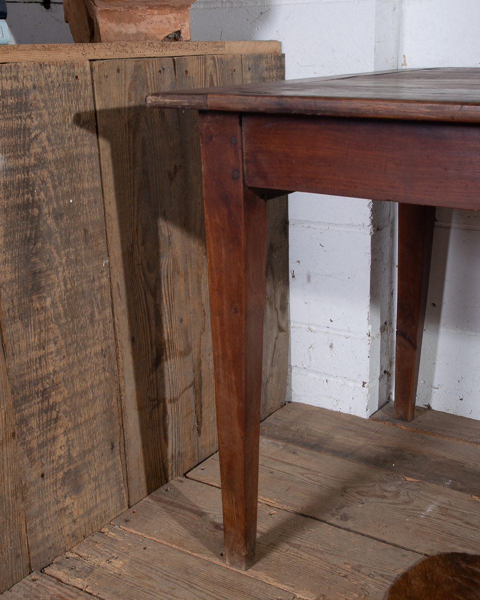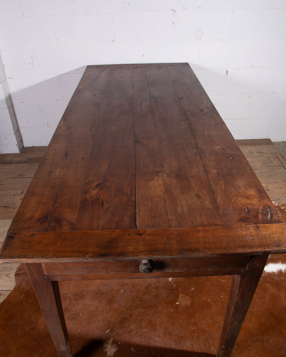 A 19th century French farmhouse dining table with pine scrub top, tapered legs and end drawer.