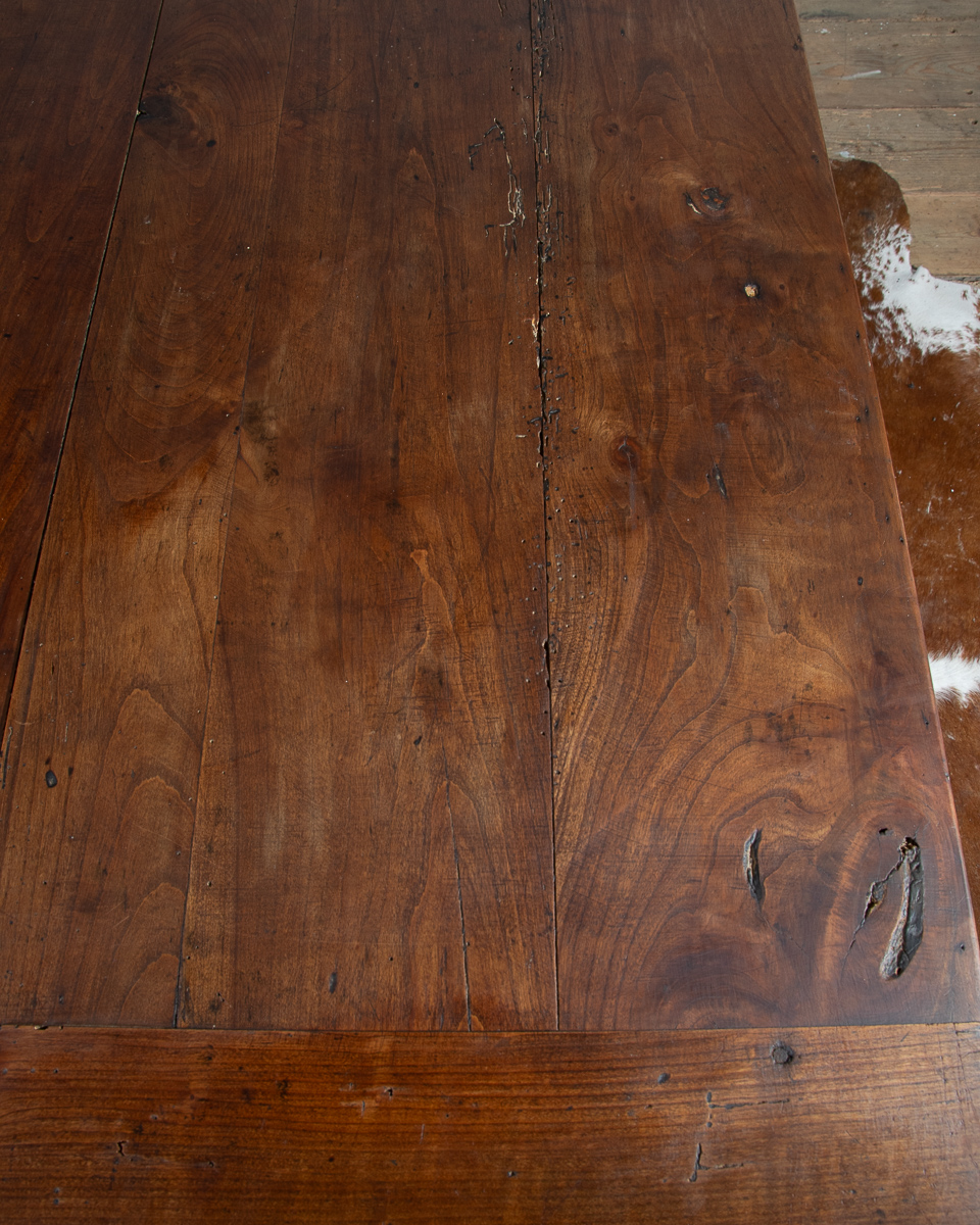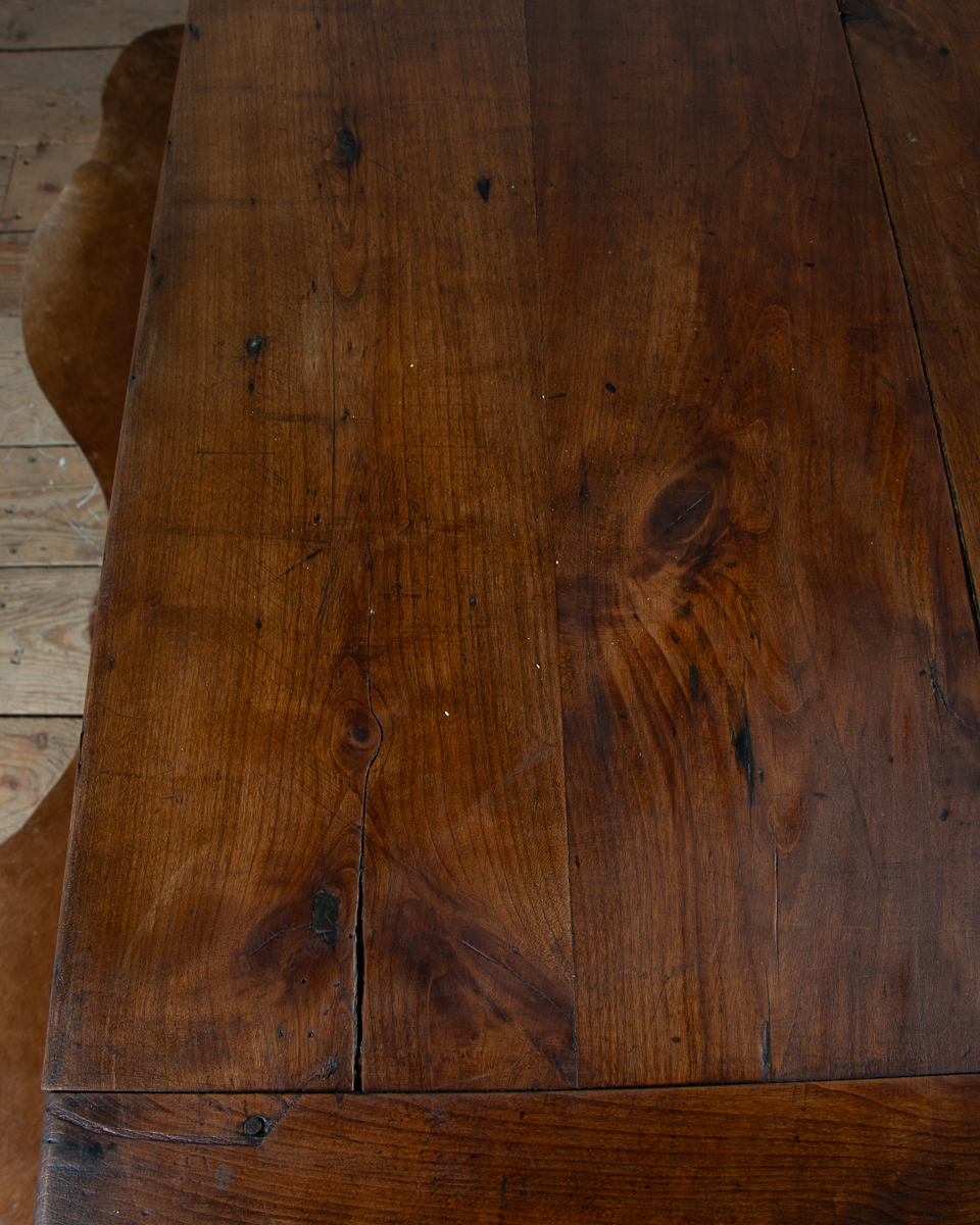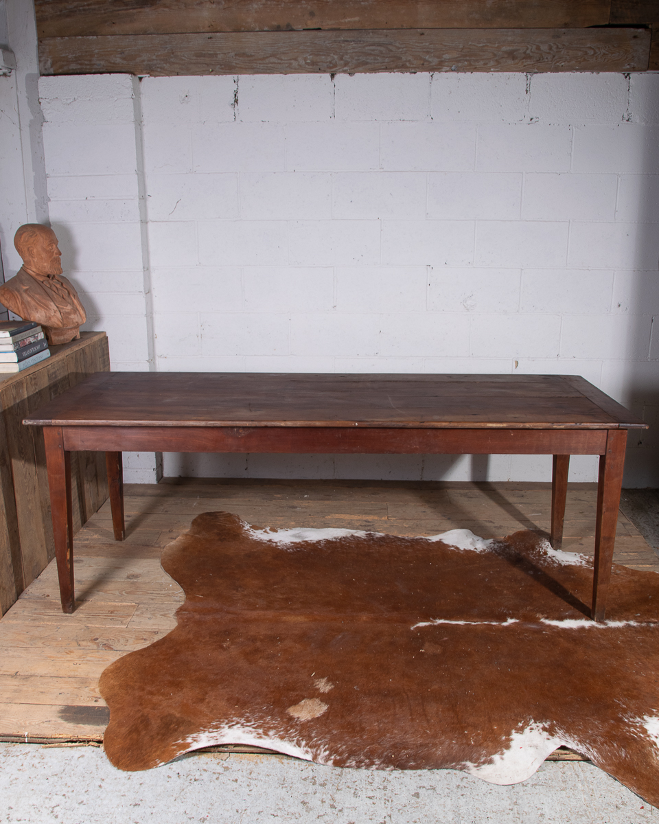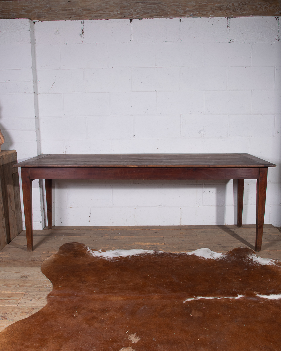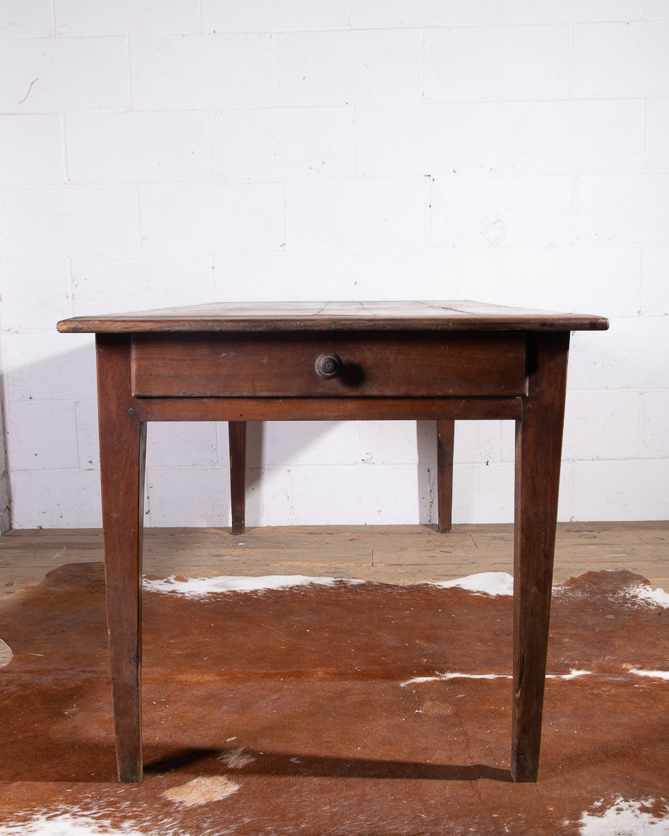 A 19th century French farmhouse dining table with pine scrub top, tapered legs and end drawer.