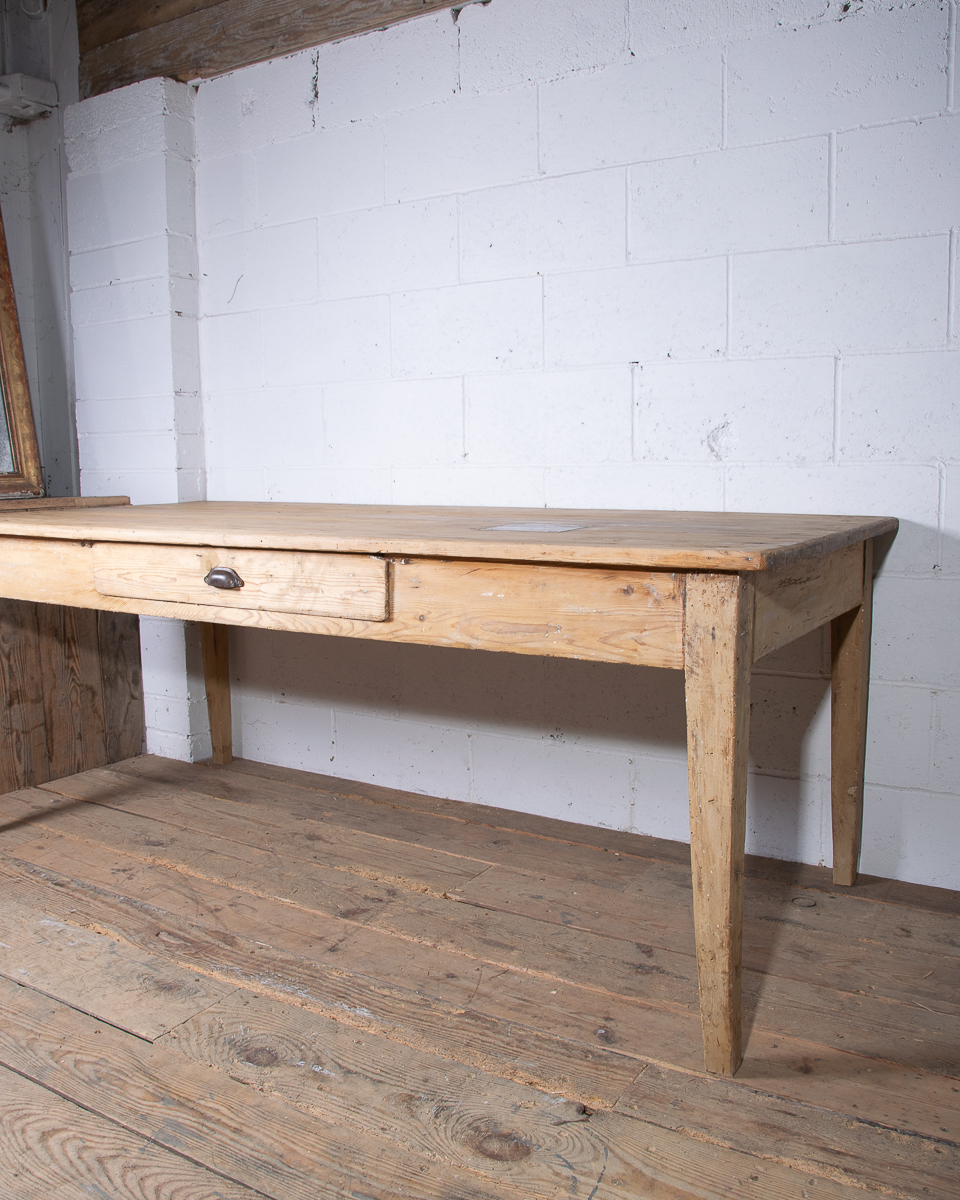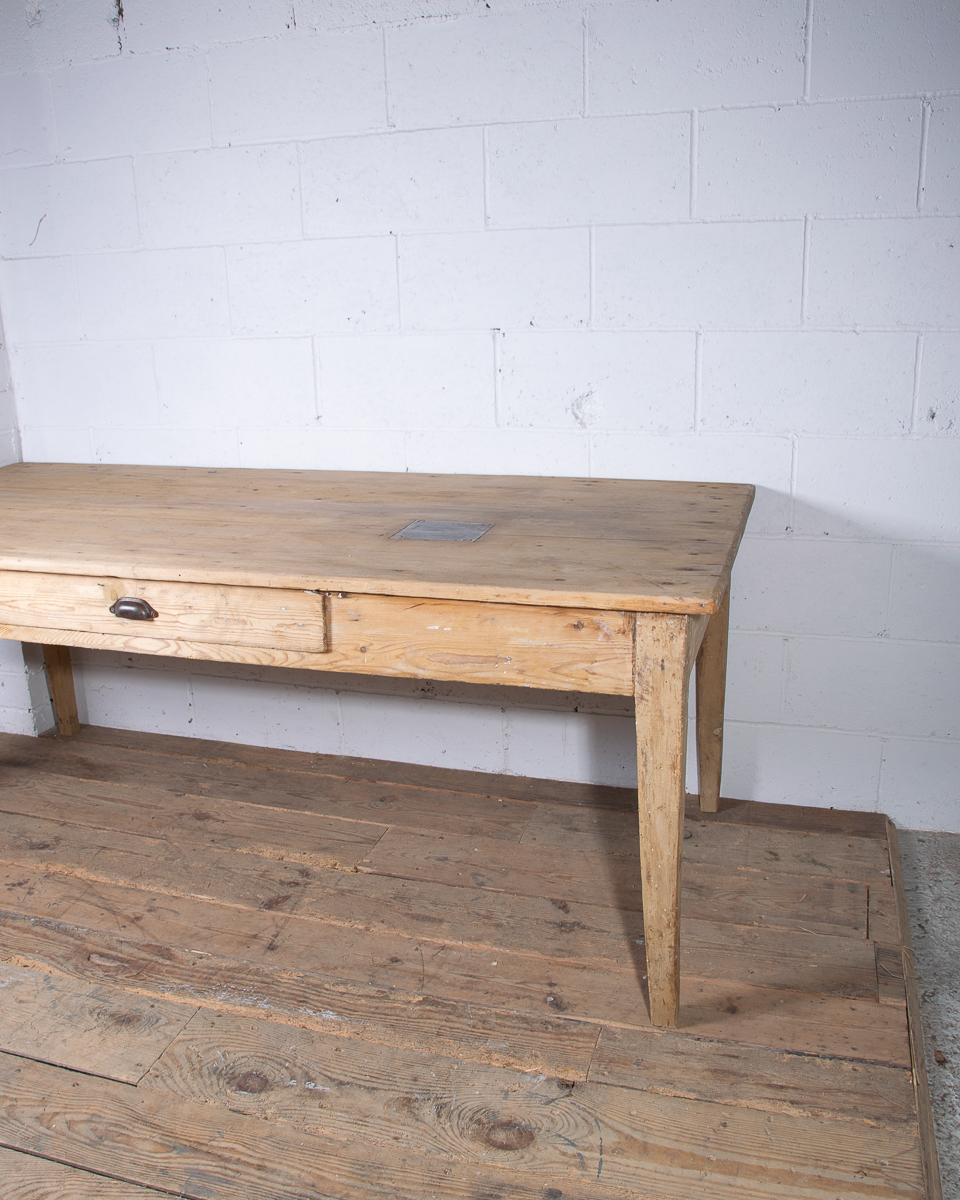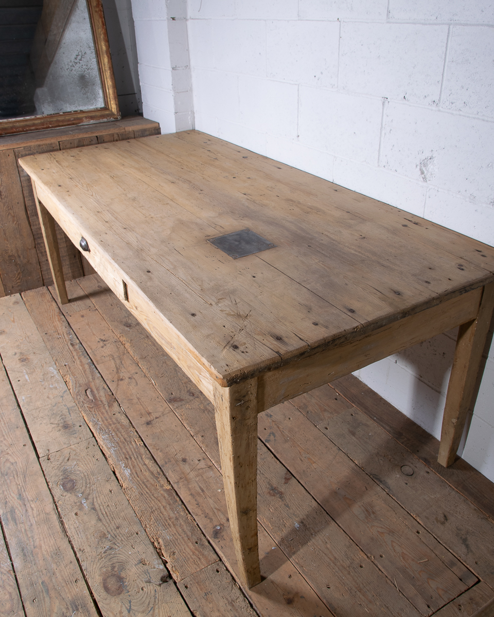 A late 19th century French scrub top pine table with tapered legs and 1 large centre drawer.  The table has been lightly stripped and waxed.  Note old metal plate on table top which once housed some sort of mechanical device.