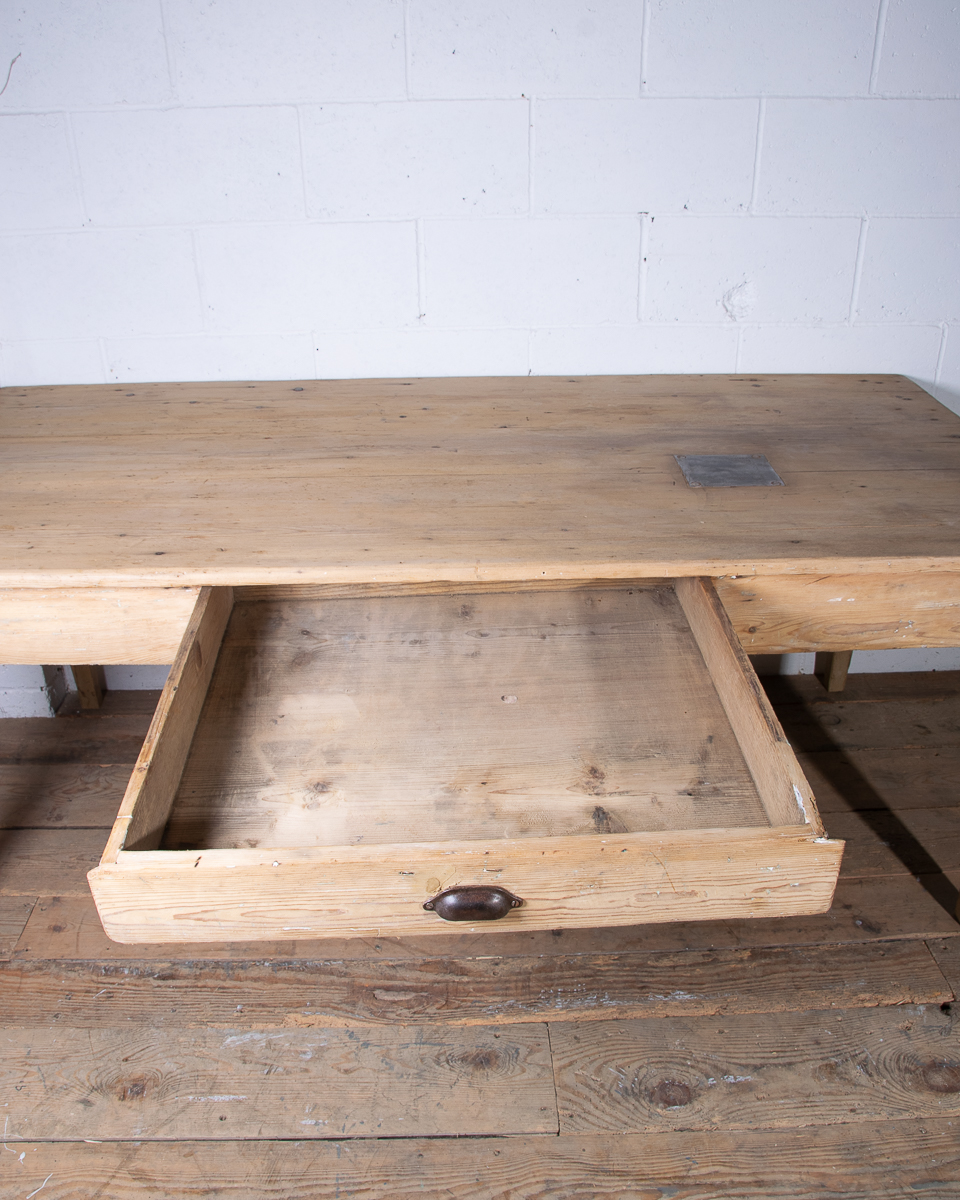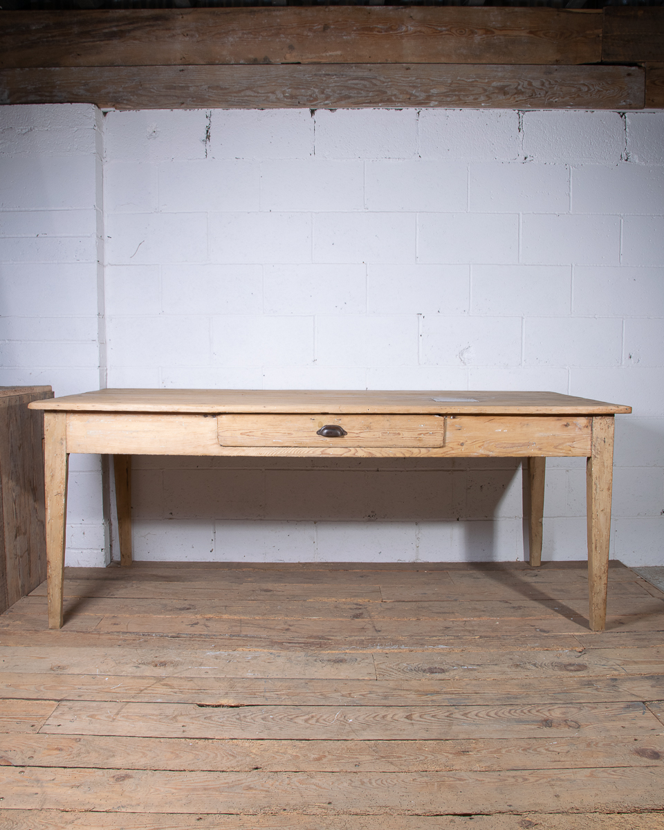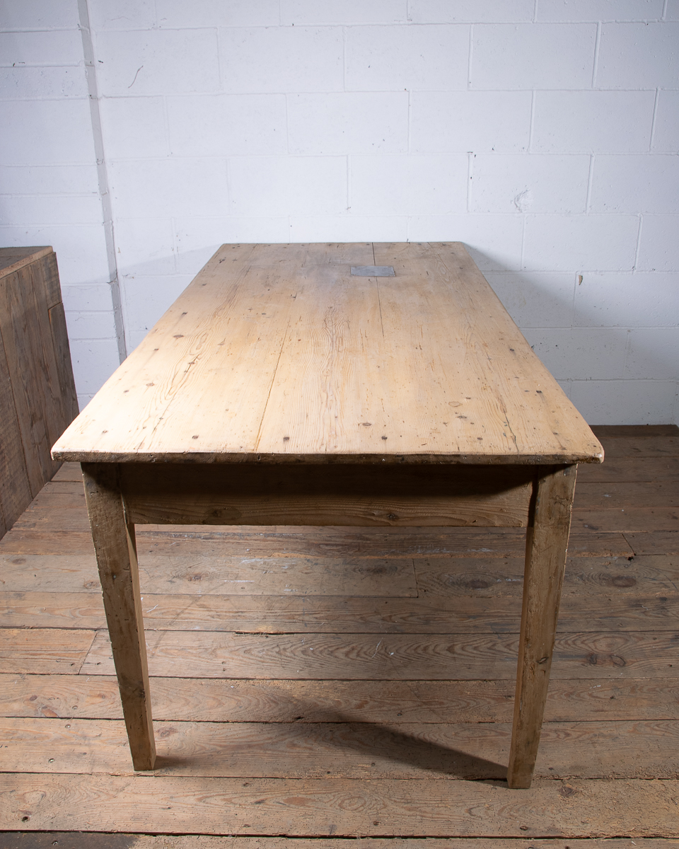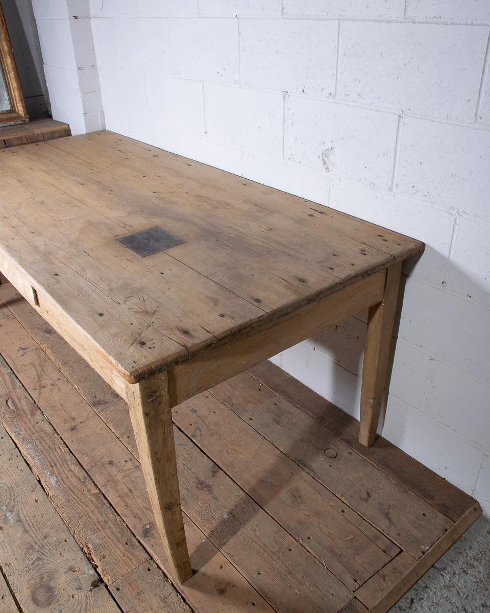 A late 19th century French scrub top pine table with tapered legs and 1 large centre drawer.  The table has been lightly stripped and waxed.  Note old metal plate on table top which once housed some sort of mechanical device.