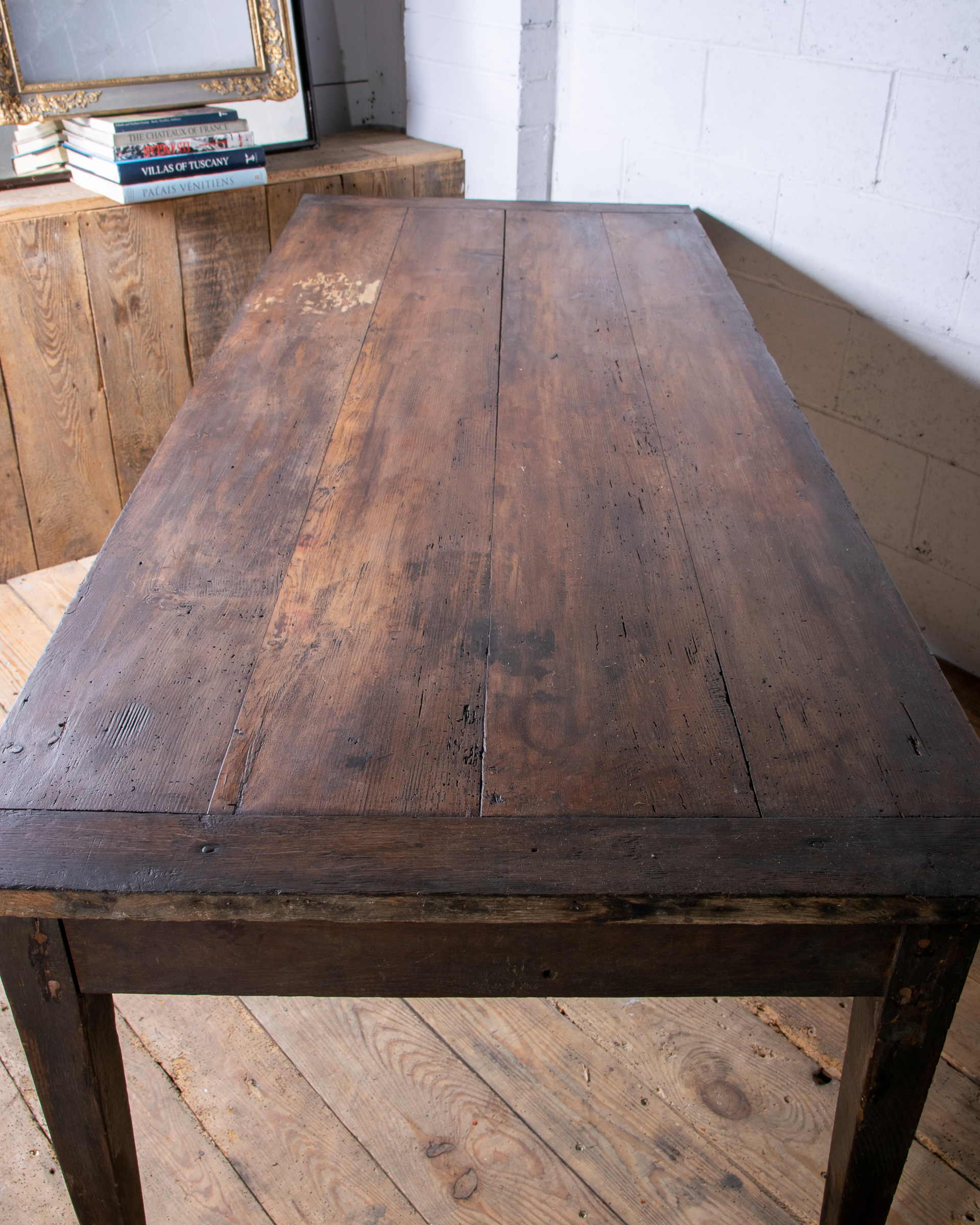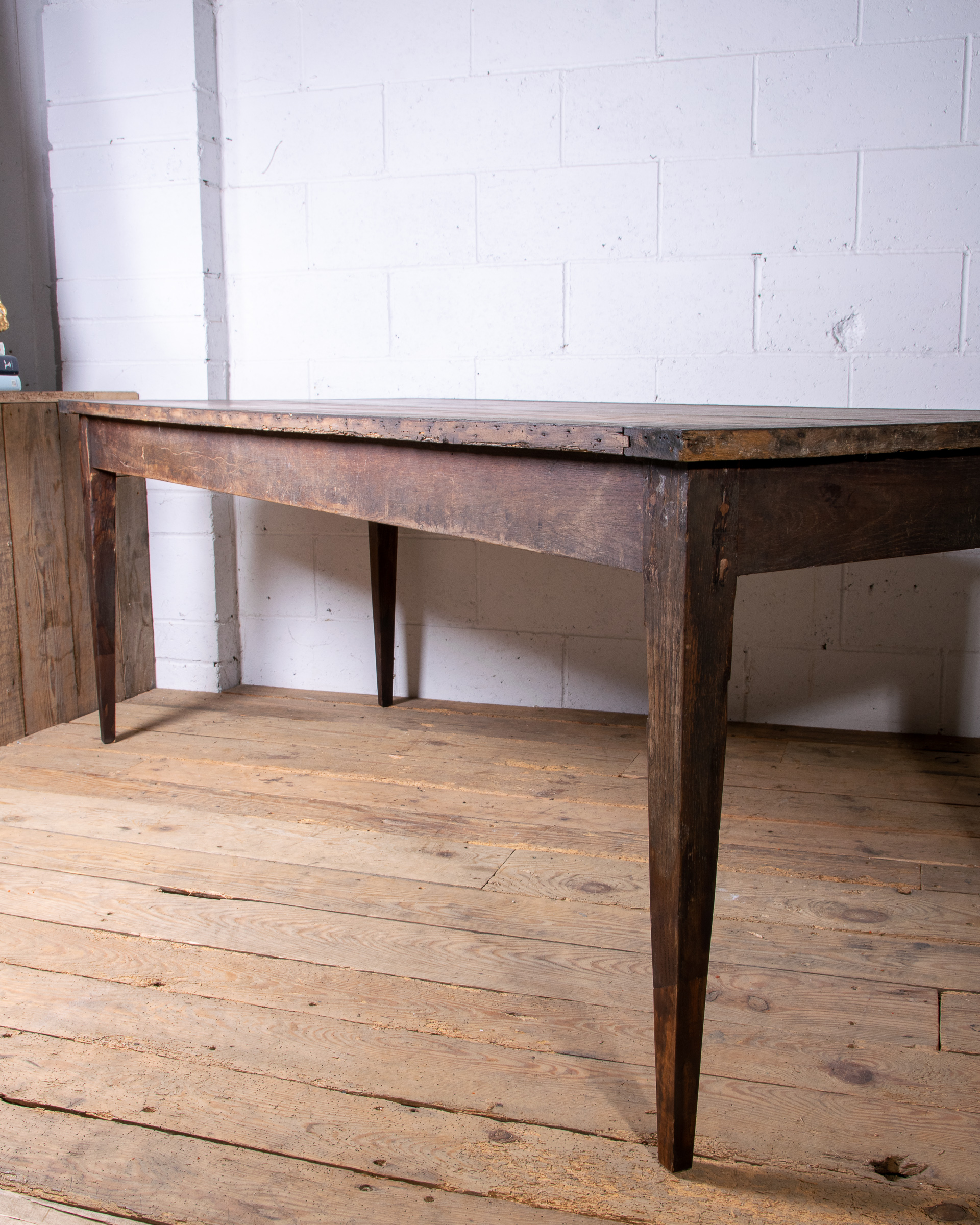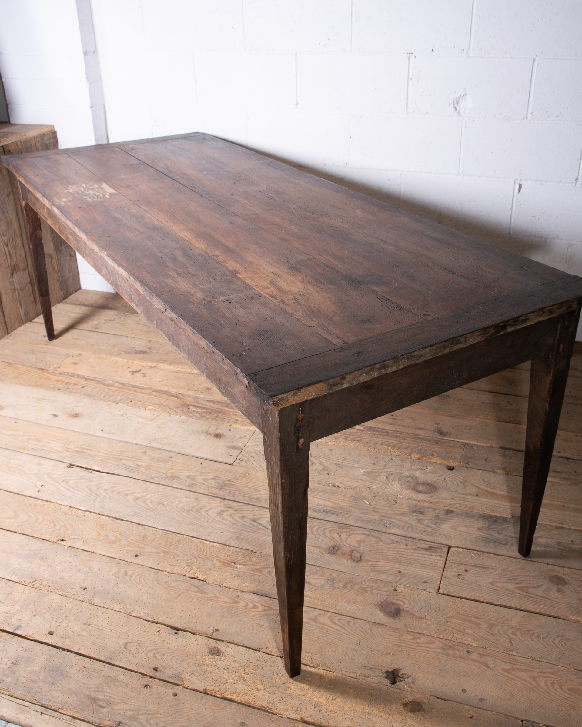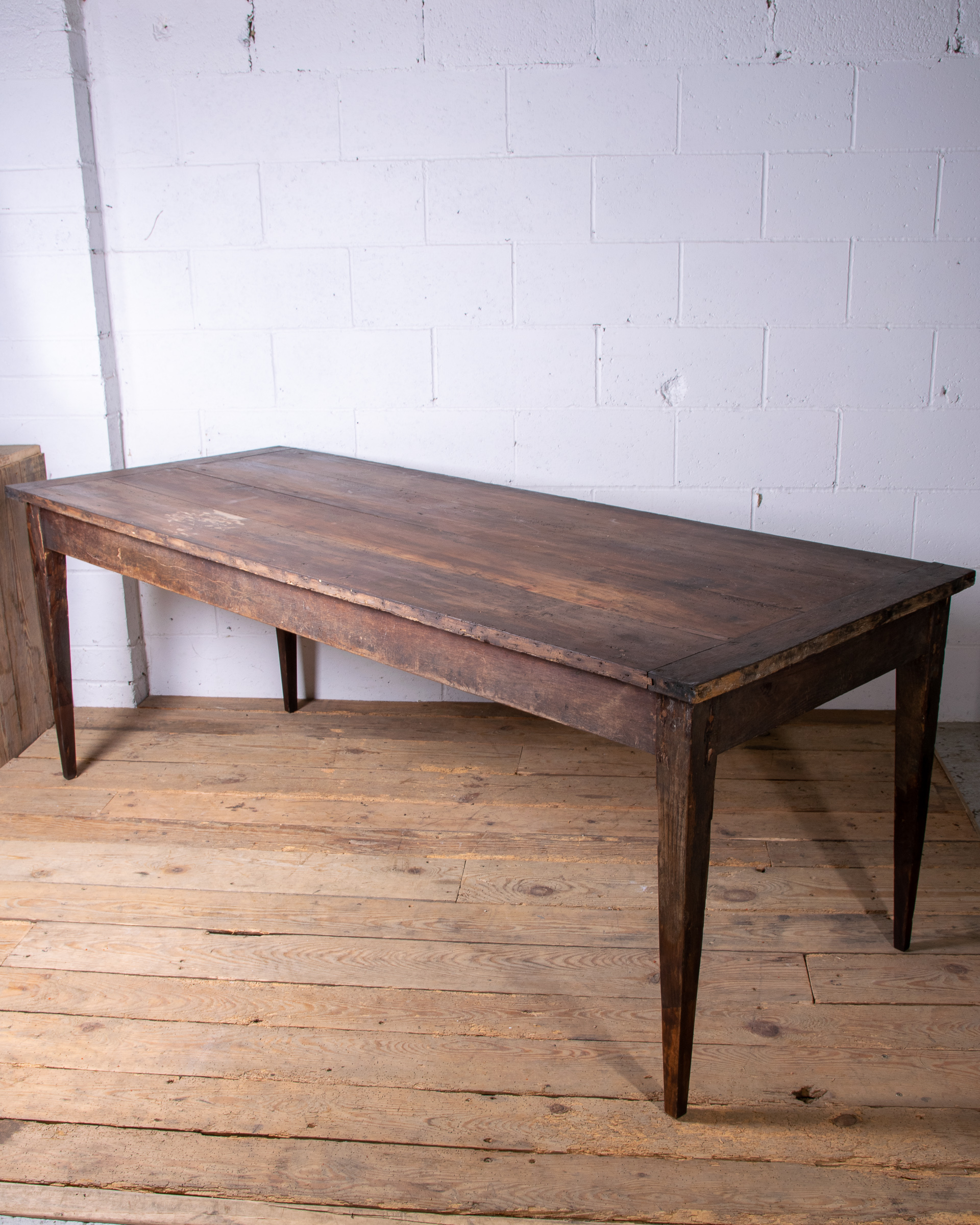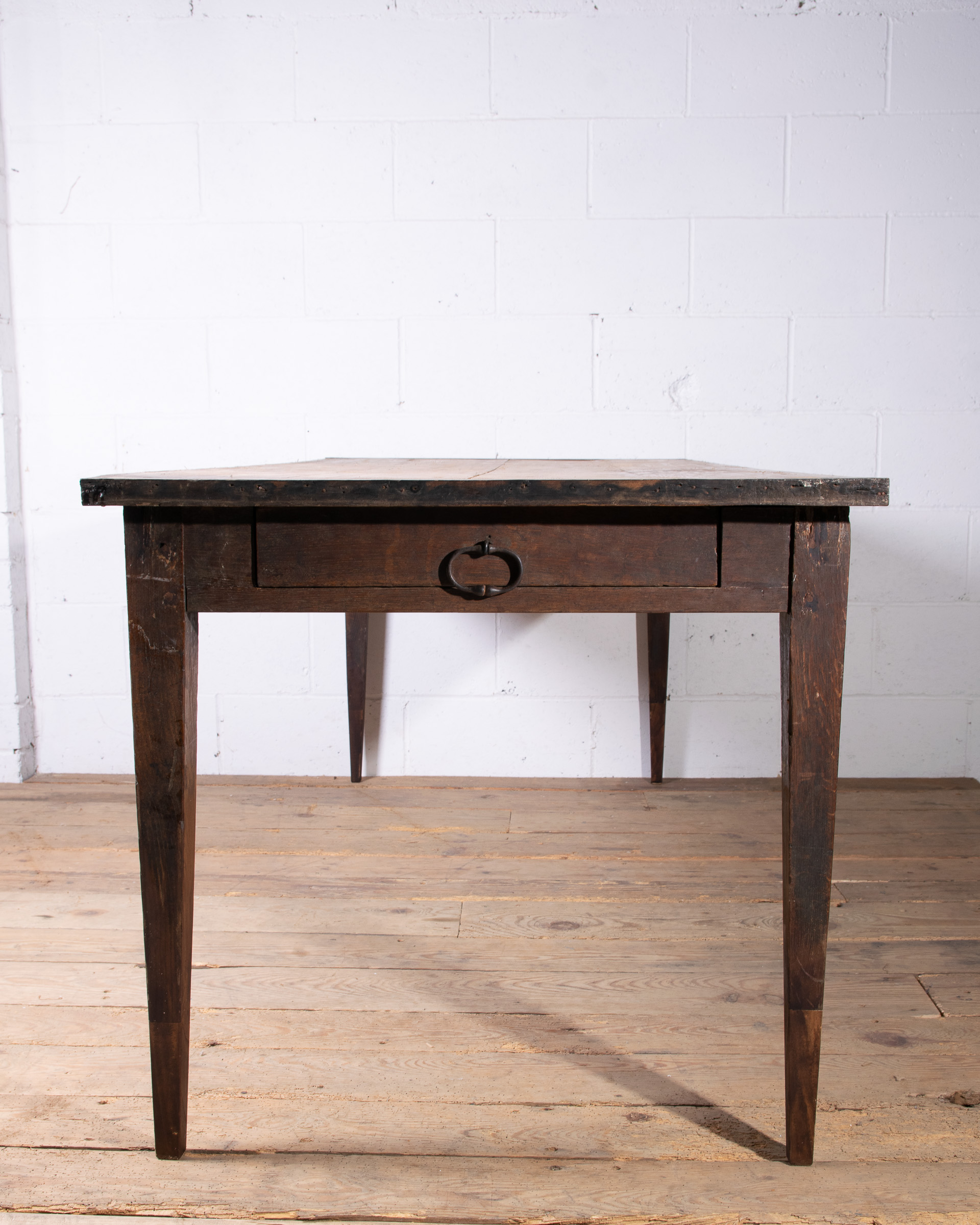 A late 19th century French farmhouse table. Oak base with tapered ebonised legs. Pitch pine scrub top. Peg construction. 1 end drawer.