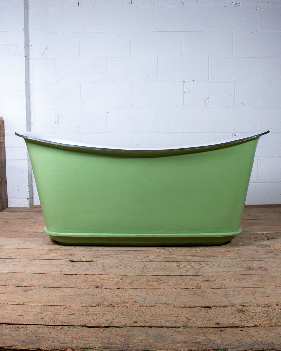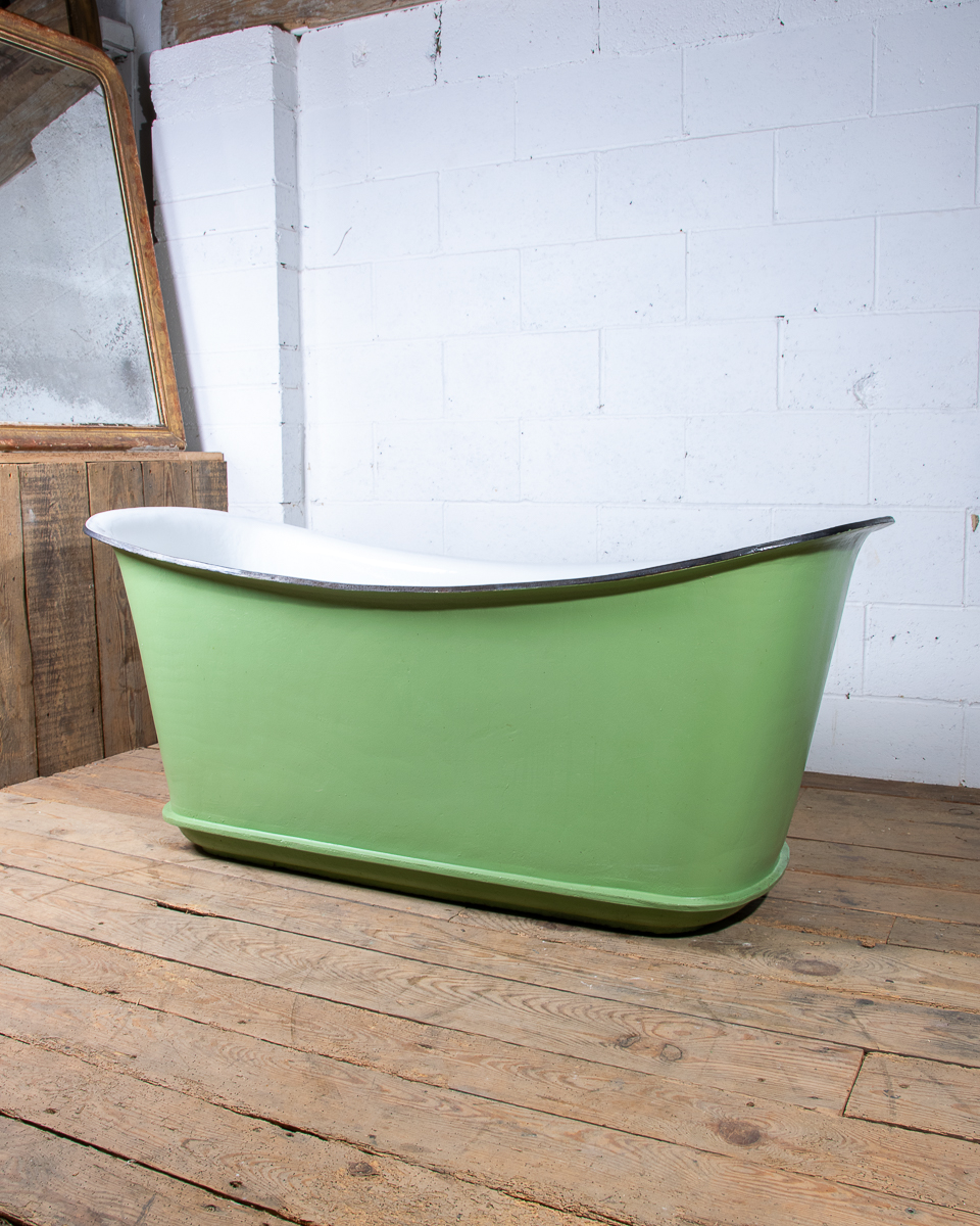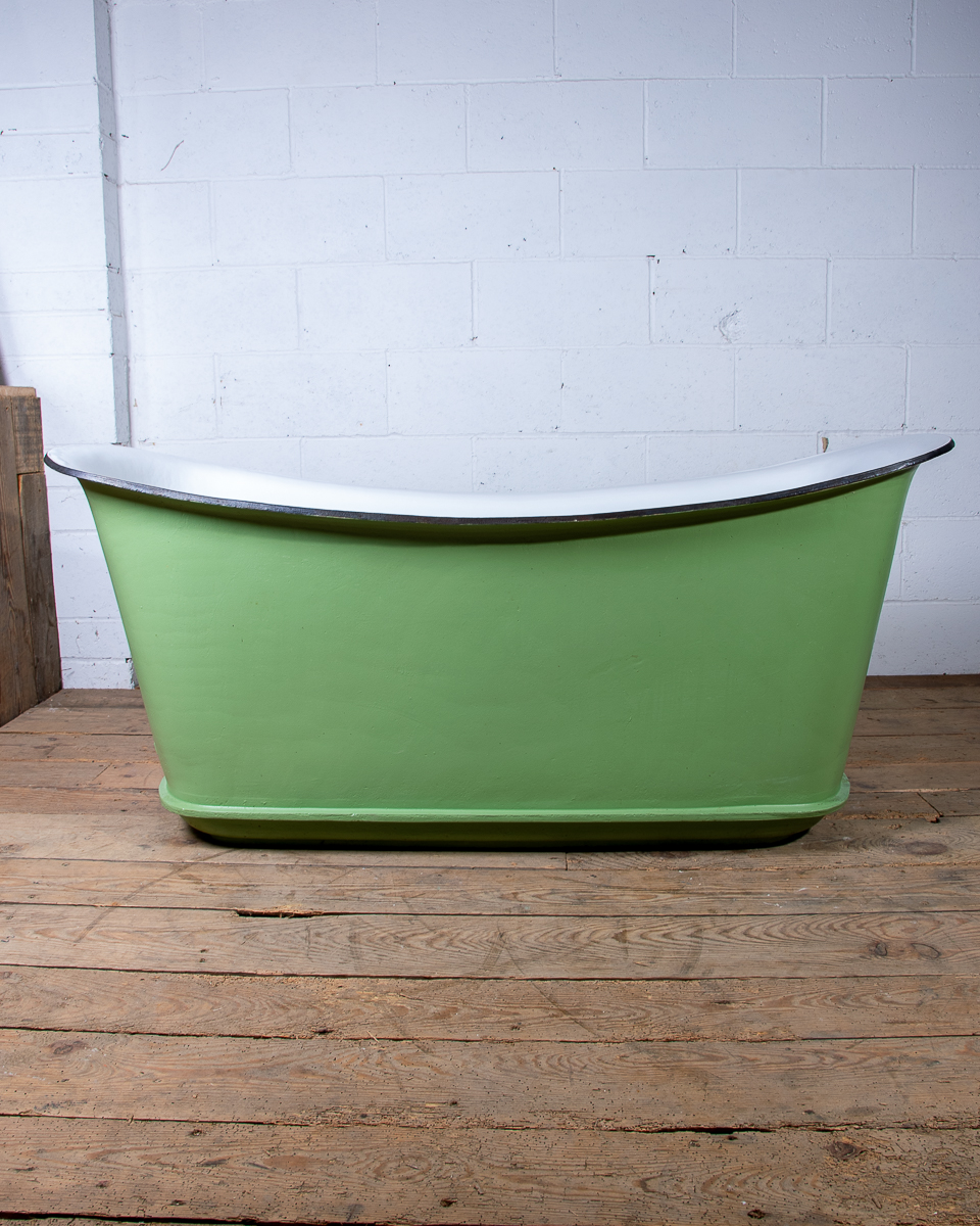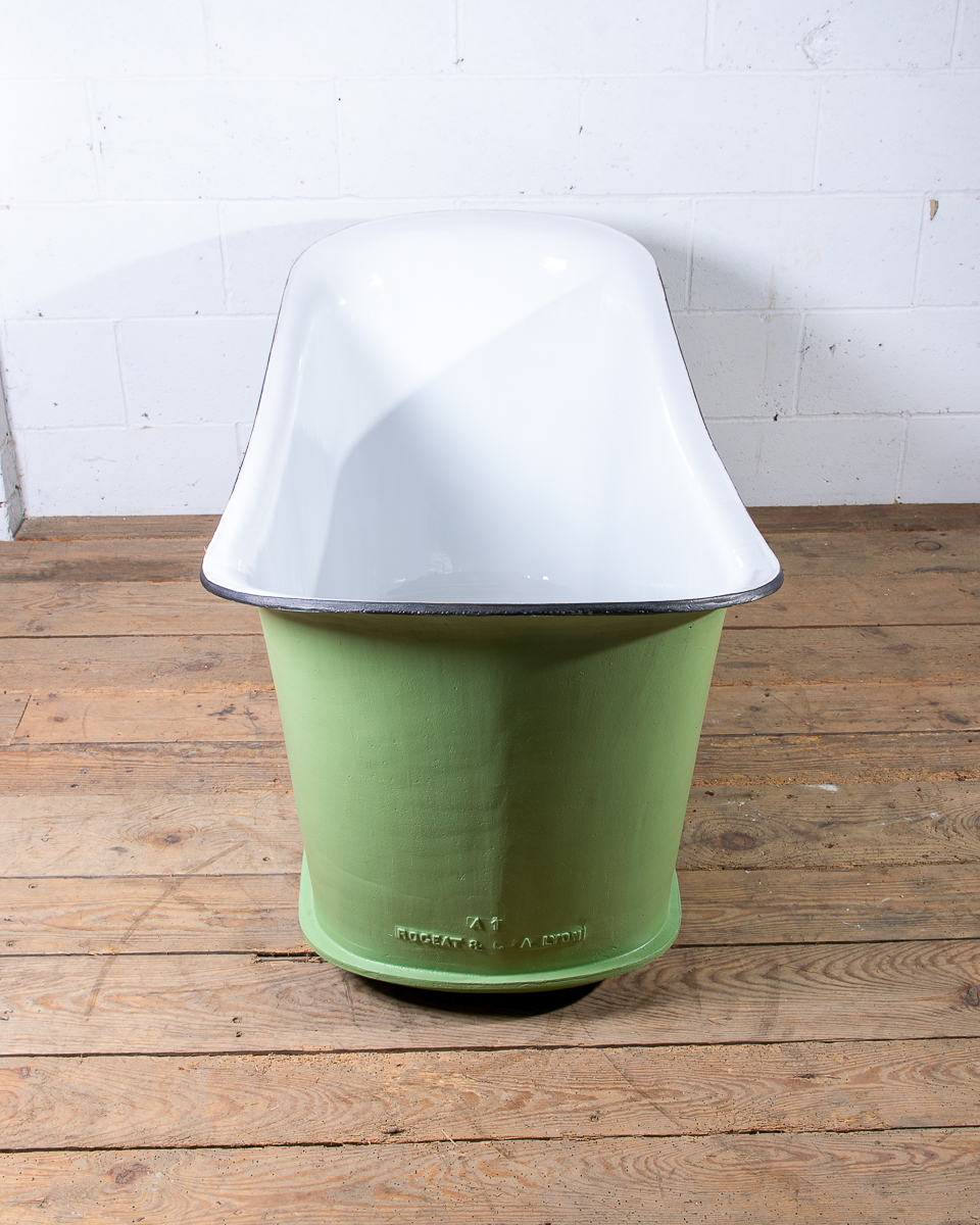 A late 19th century cast iron empire bath manufactured by Rogeat (Lyon). Marked at one of the ends of the bathtub Rogeat model number A1. The bath has been recently resurfaced and the exterior sandblasted and painted in Little Greene Tom’s oil eggshell (colour Garden).