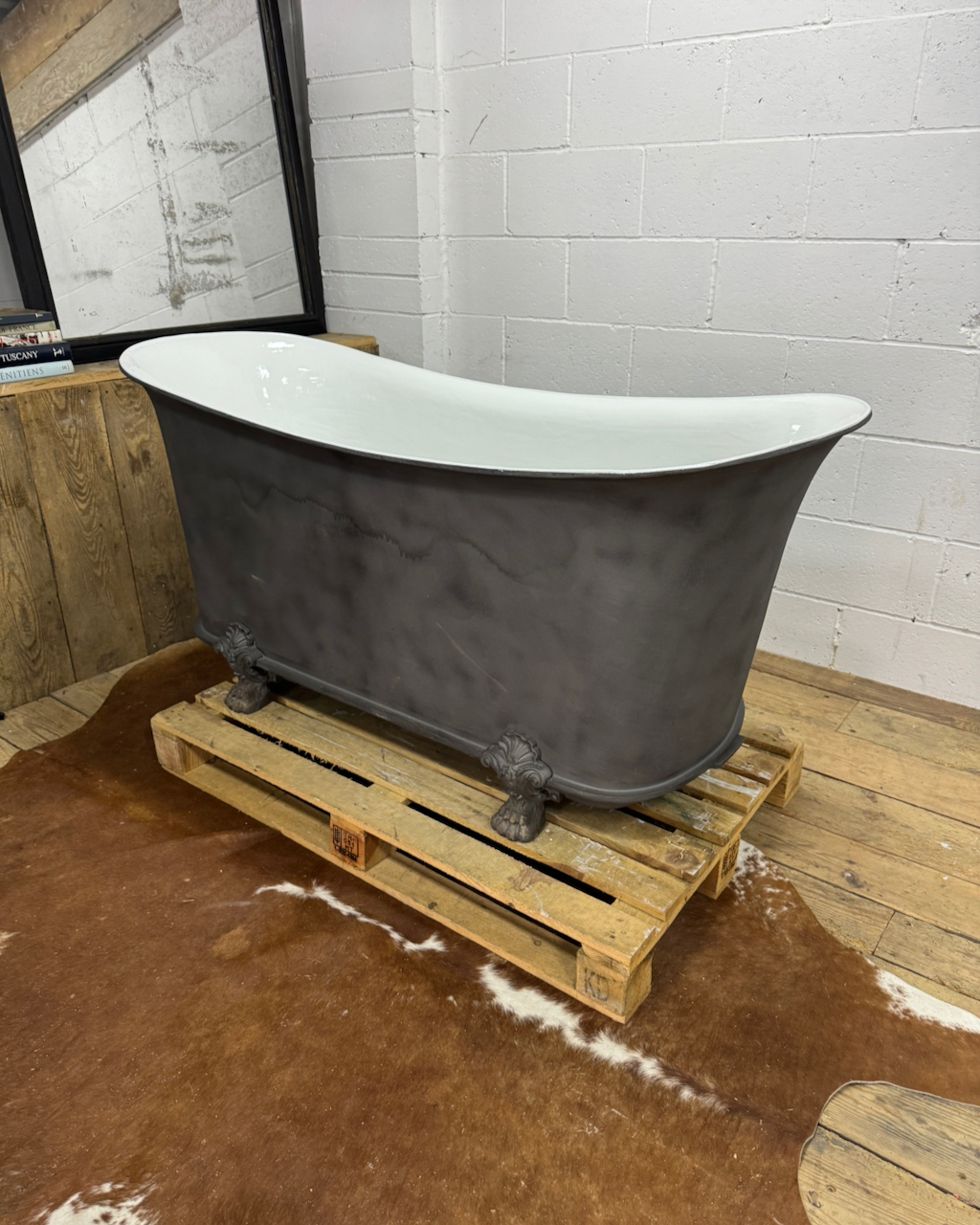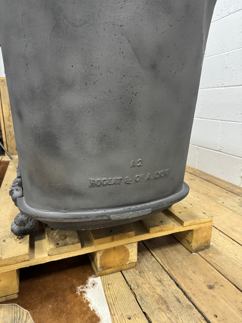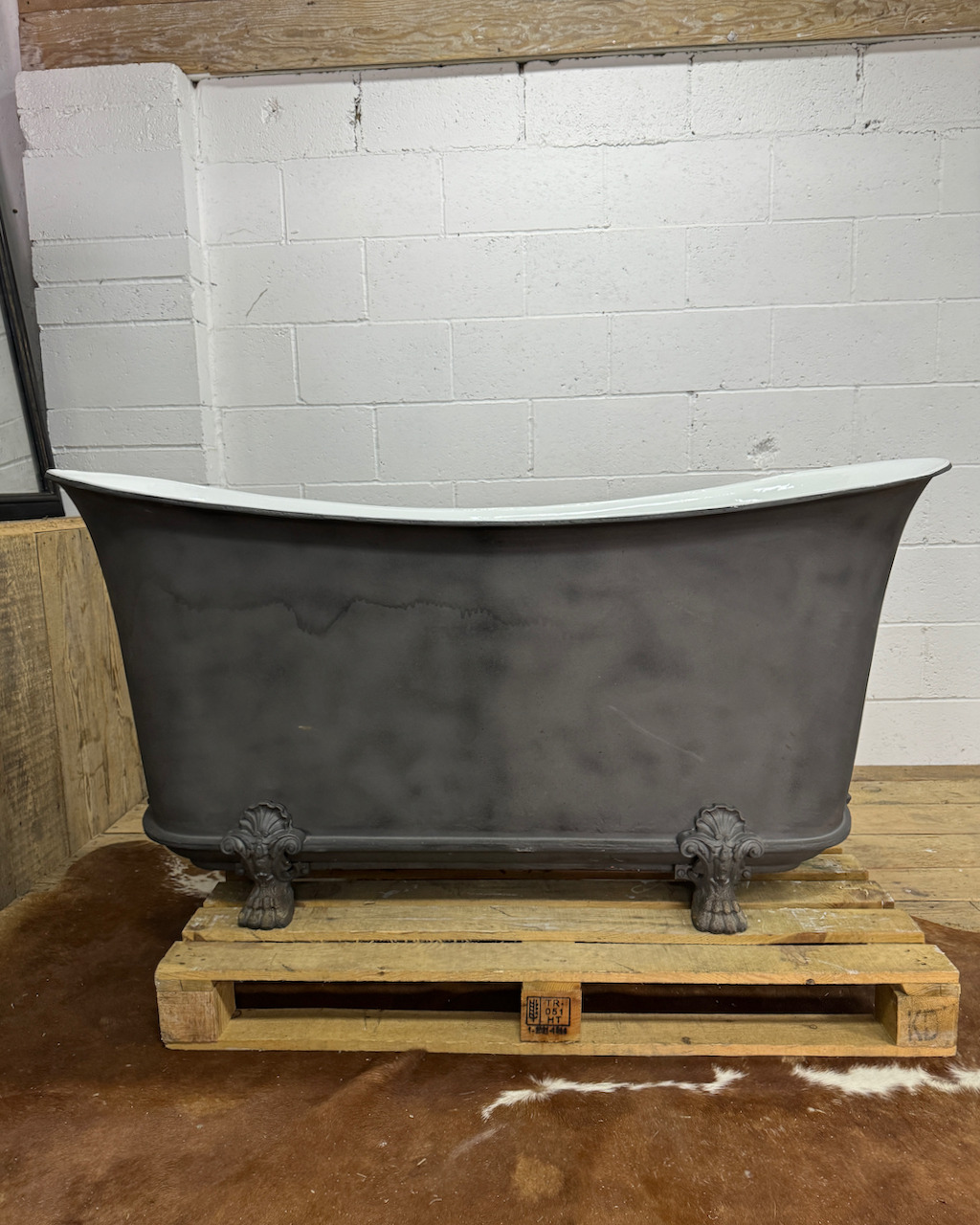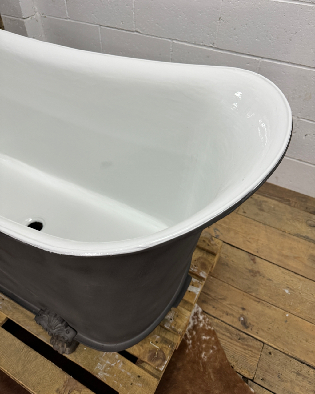 A late 19th century cast iron empire bath by Rogeat (Lyon). On its original lionfeet. The bath has been blasted and resurfaced inside. The exterior is waiting to be primed and painted to the colour of your choice.