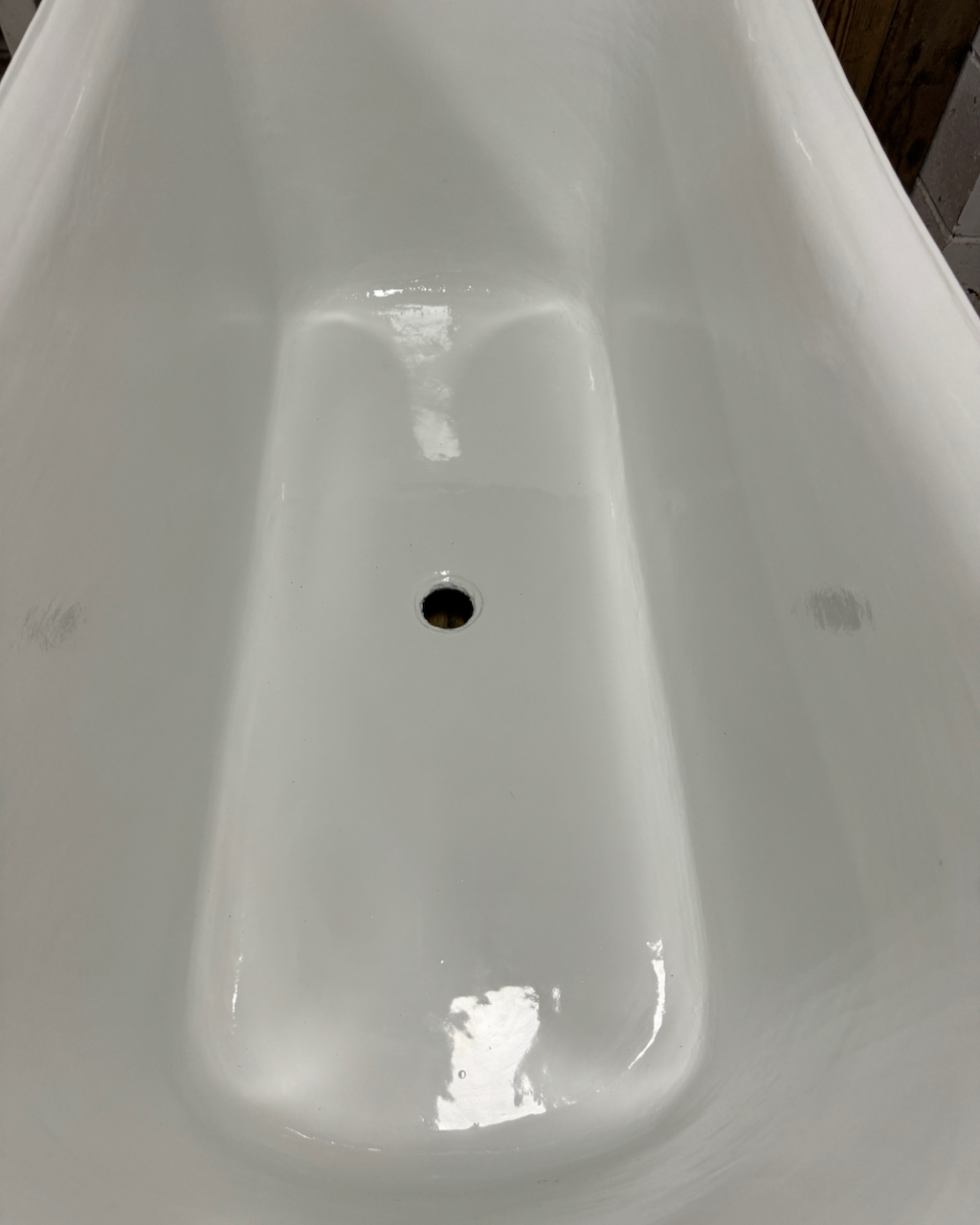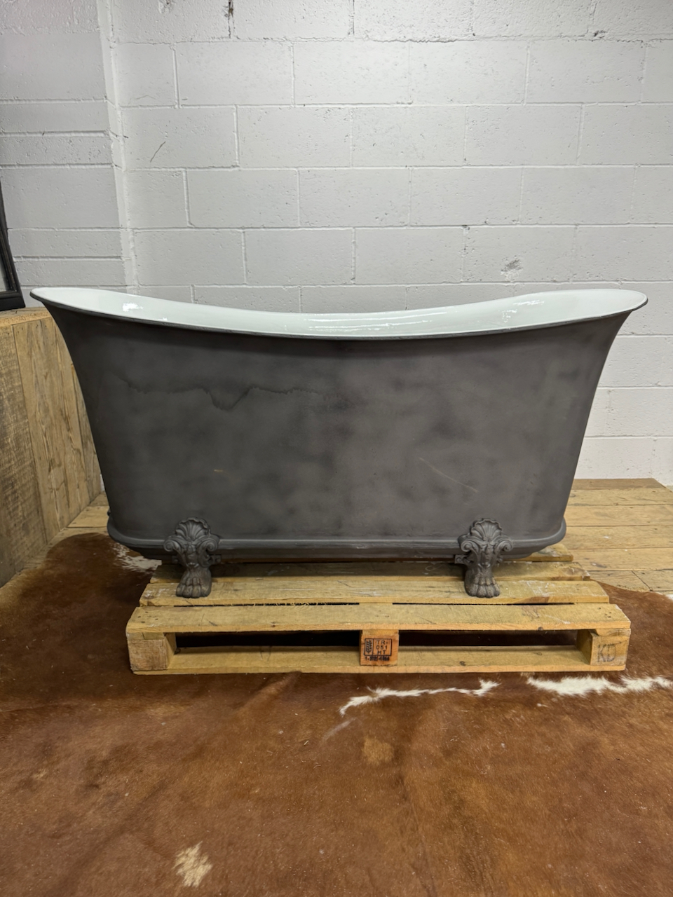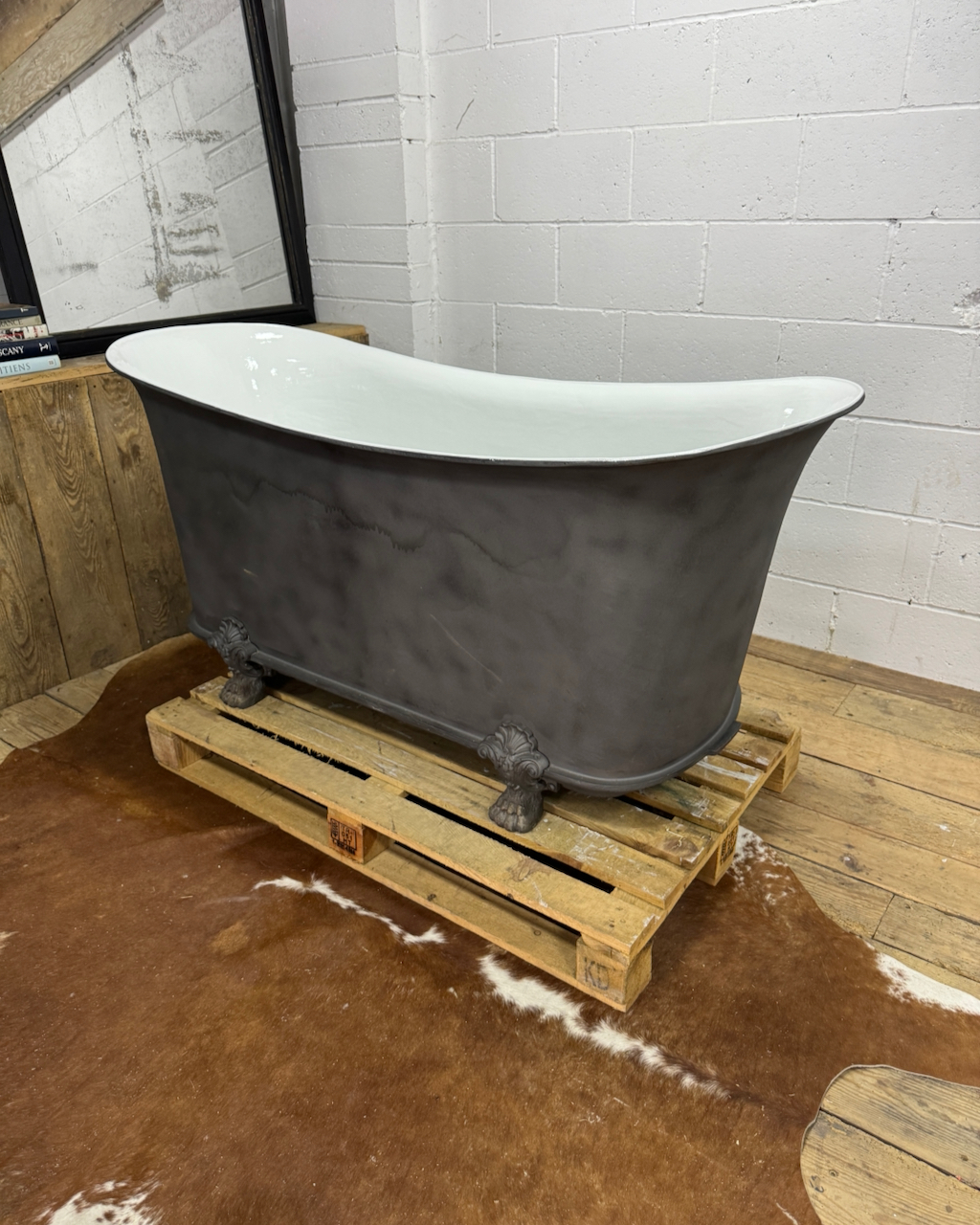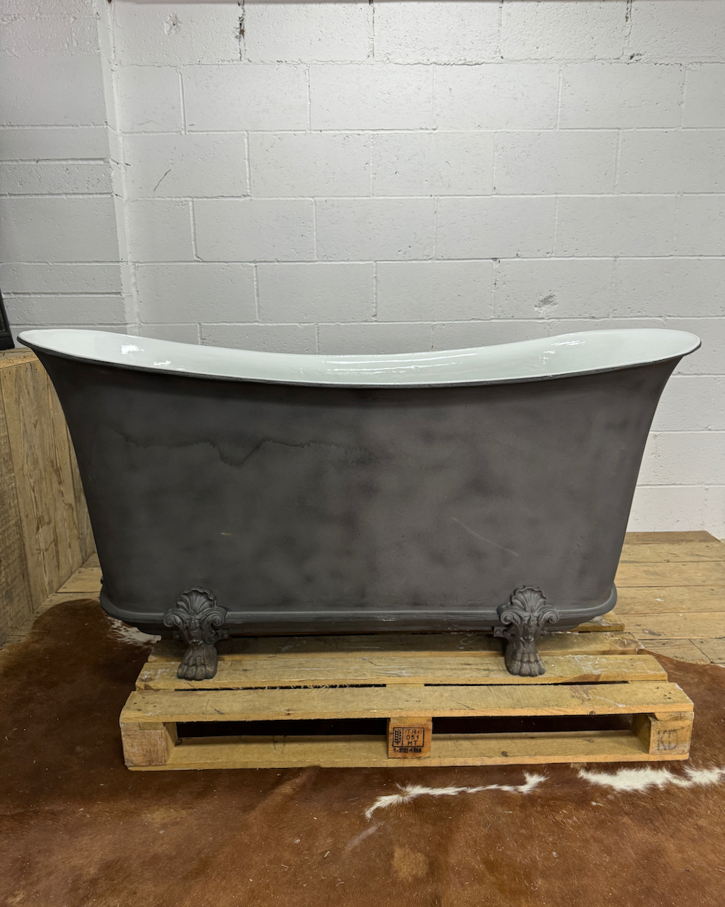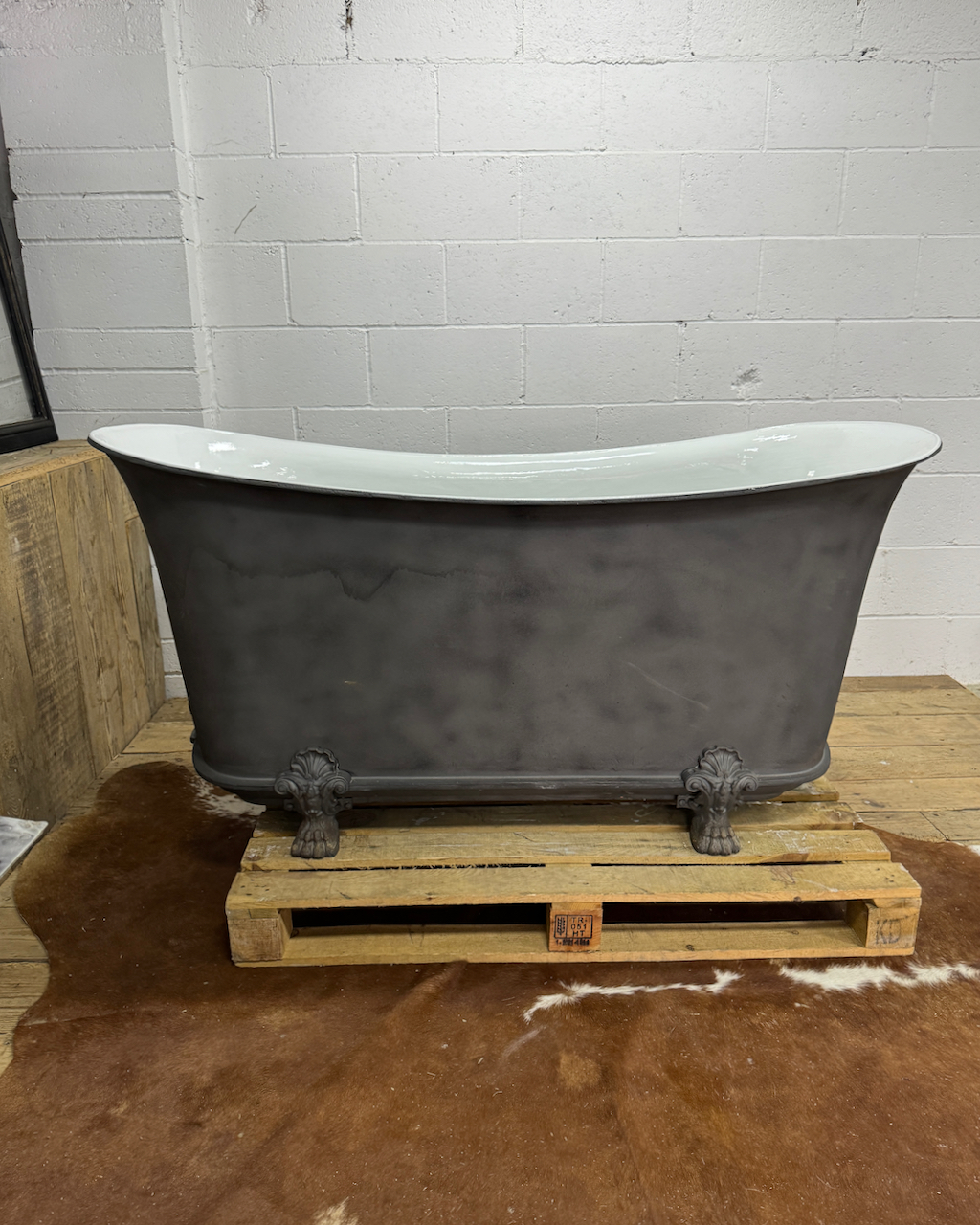 A late 19th century cast iron empire bath by Rogeat (Lyon). On its original lionfeet. The bath has been blasted and resurfaced inside. The exterior is waiting to be primed and painted to the colour of your choice.