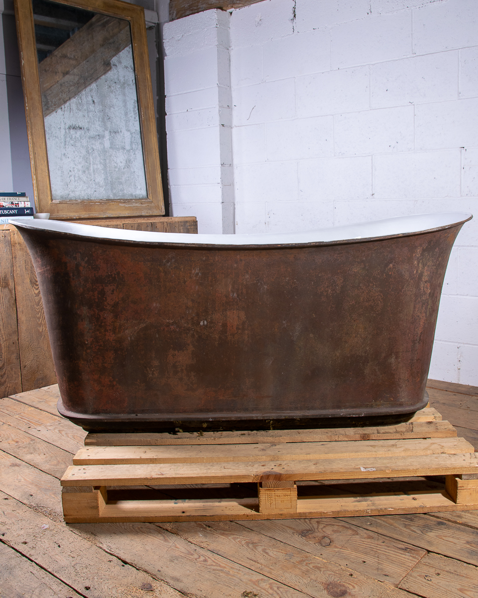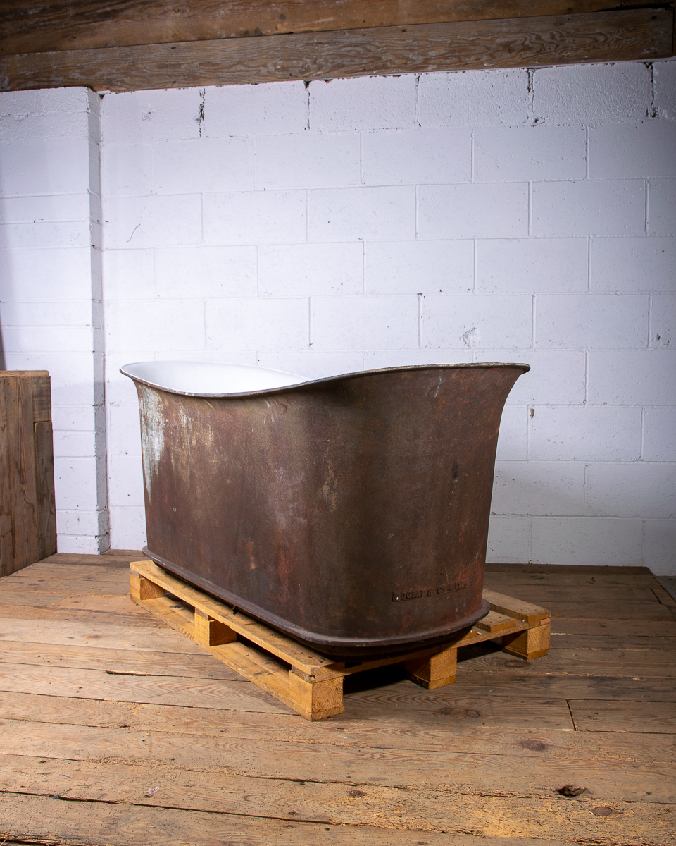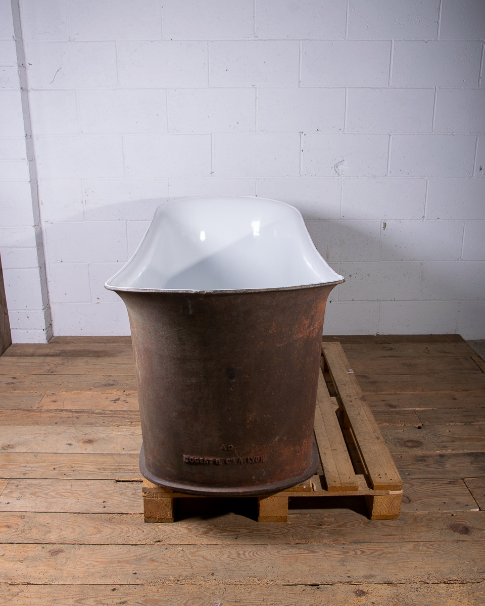 A late 19th century cast iron empire bath manufactured by Rogeat (Lyon). Marked at one of the ends of the bathtub Rogeat model number A2. Its original vitreous enamel has been resurfaced. Original patinated exterior untouched by us showing an interesting earthy red hue.