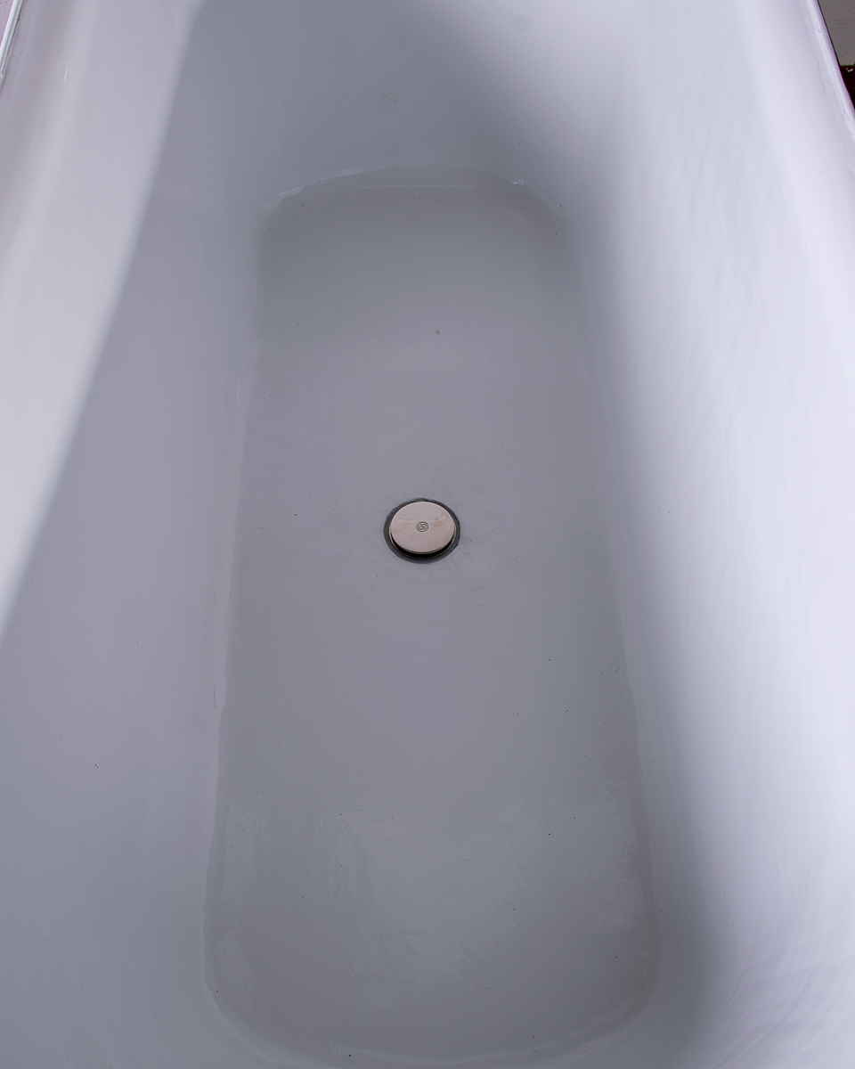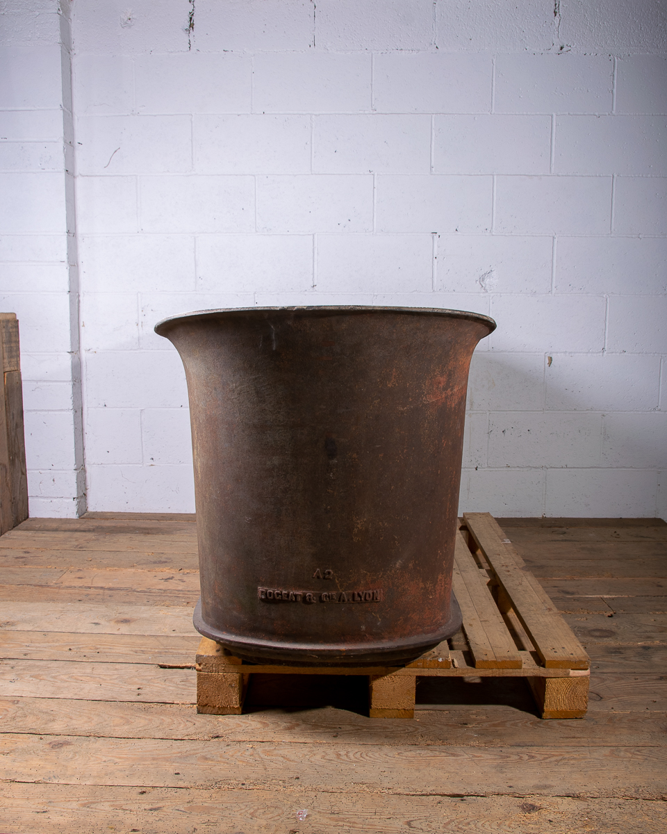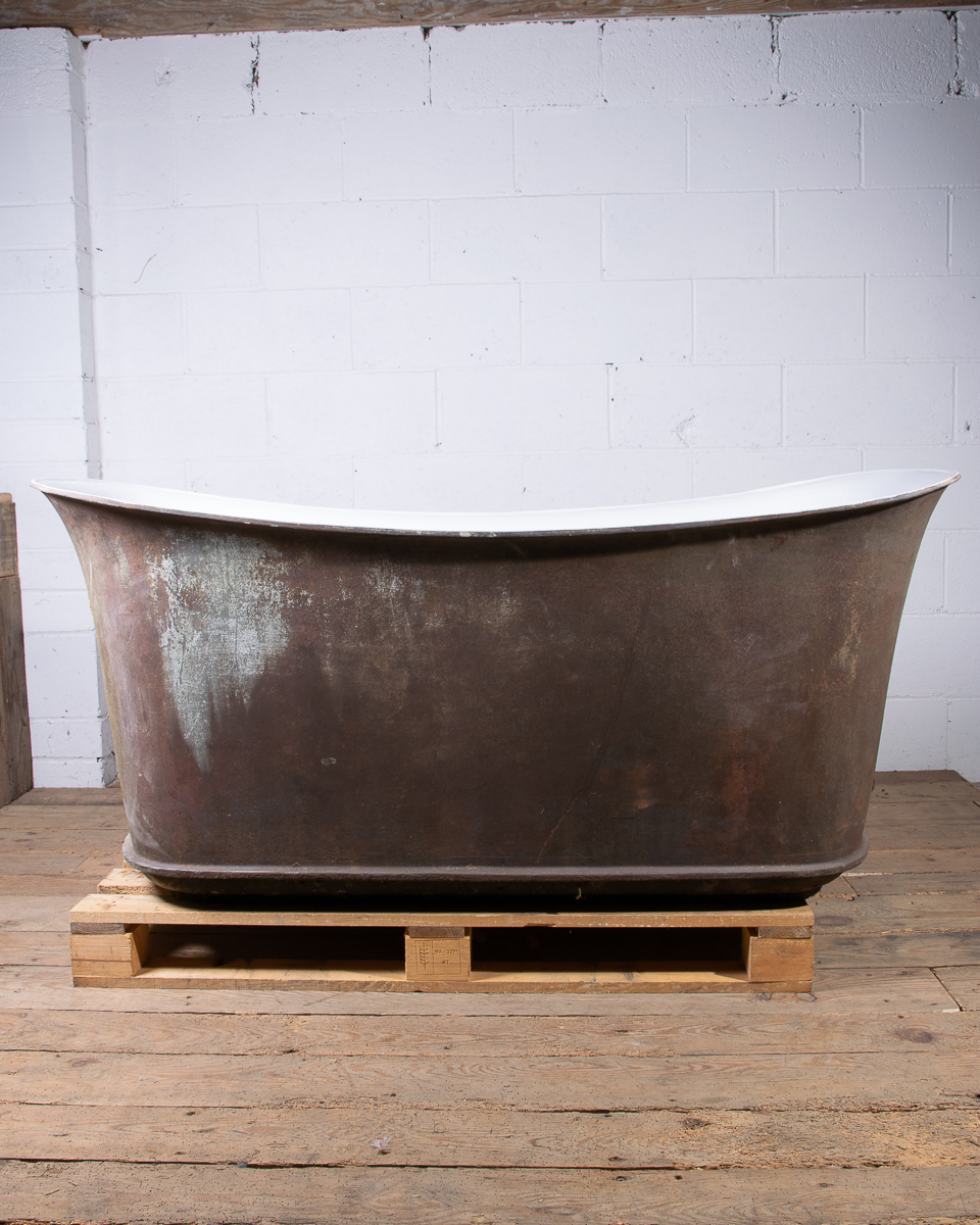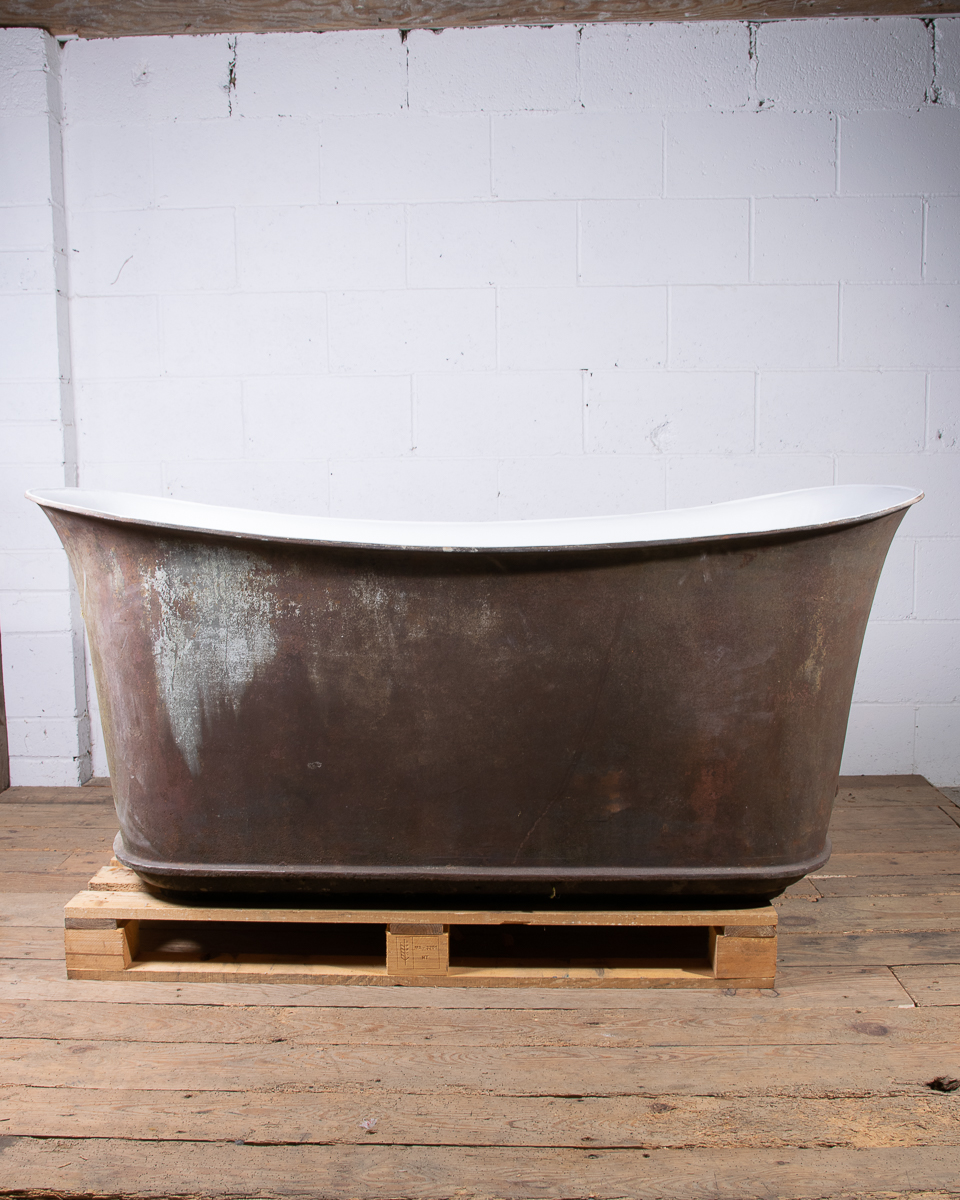 A late 19th century cast iron empire bath manufactured by Rogeat (Lyon). Marked at one of the ends of the bathtub Rogeat model number A2. Its original vitreous enamel has been resurfaced. Original patinated exterior untouched by us showing an interesting earthy red hue.